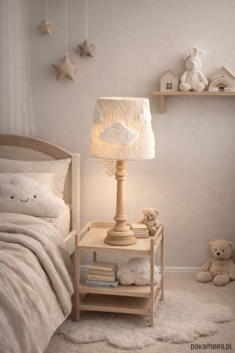 Szukasz wyjątkowej lampki nocnej, która połączy funkcjonalność z niepowtarzalnym urokiem? Nasza lampa stołowa „Delikatna Chmurka” to idealny wybór! Puszyste, białe chmurki rozmieszczone na bawełnianym abażurze wprowadzą do pokoju Twojego dziecka ciepłą i przytulną atmosferę. Dzięki temu każdy wieczór stanie się wyjątkowy, a zasypianie będzie kojarzyć się z bezpieczeństwem i spokojem.