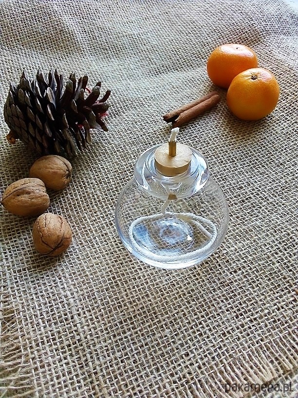 Szklane naczynie, naturalny korek, mosiężna kurka ,knot do lamp oliwnych.