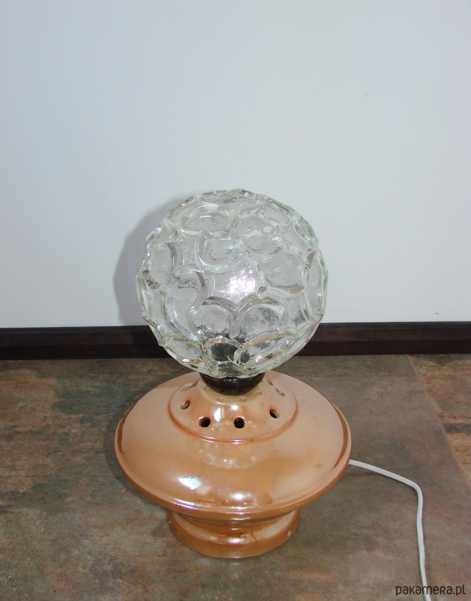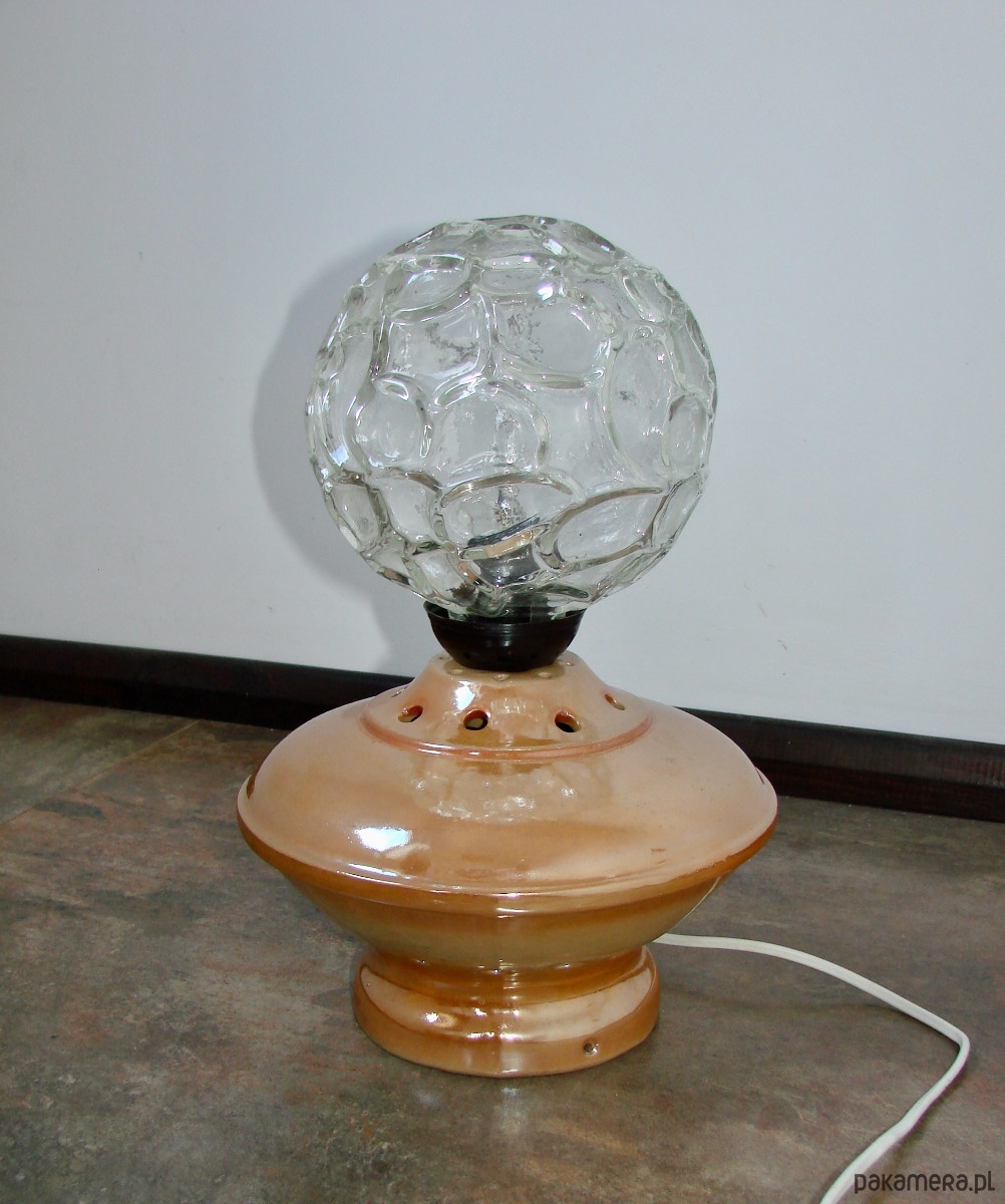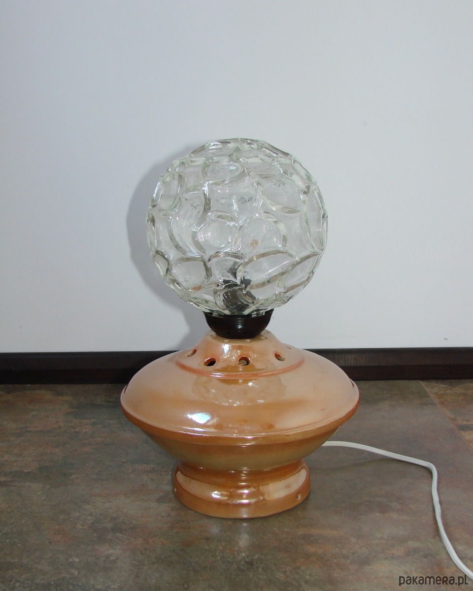 Charakterystyczna forma oraz ciepła kolorystyka sprawiają, że lampka doskonale wpisuje się w stylistykę vintage oraz wnętrza inspirowane designem PRL. Tłoczone szkło pięknie rozprasza światło, tworząc przyjemny, nastrojowy efekt.