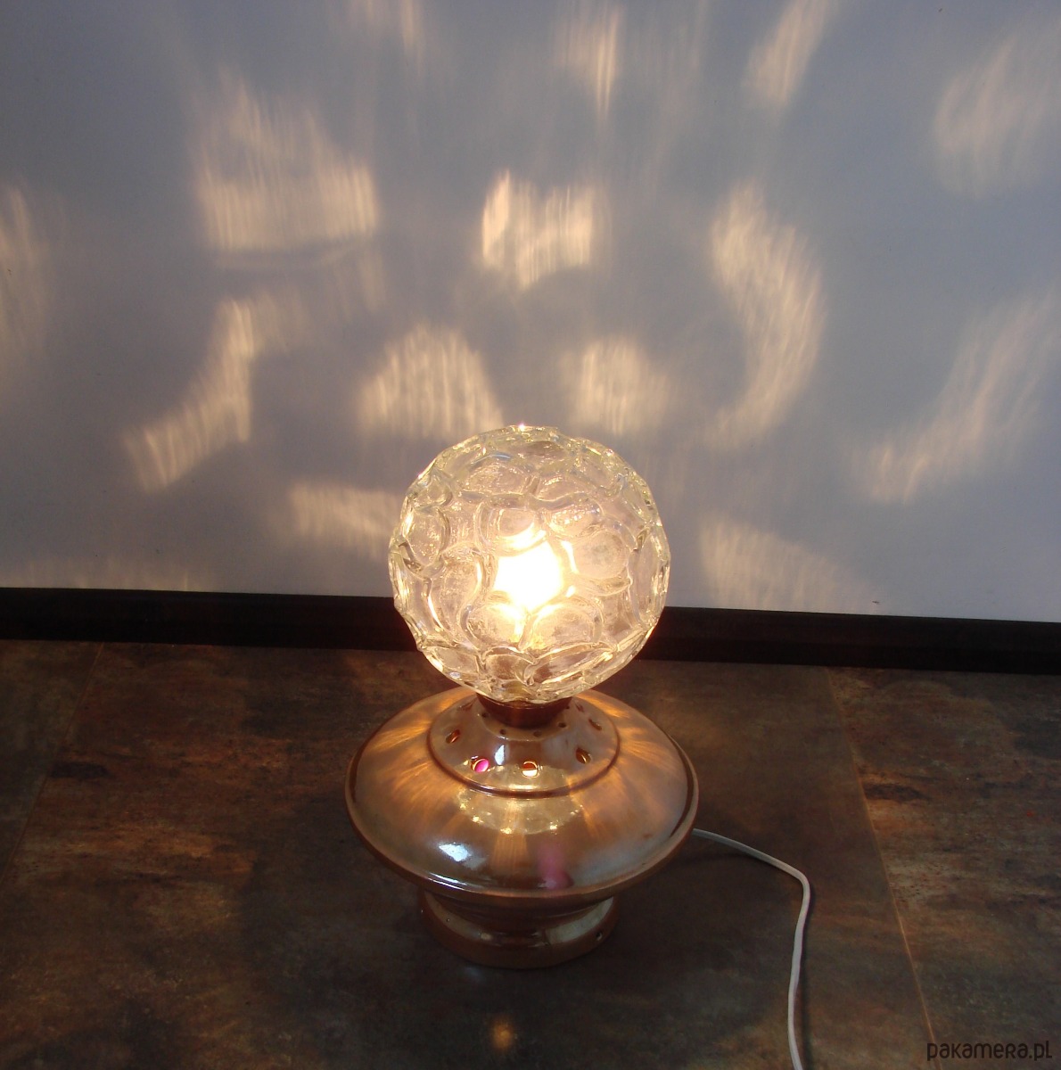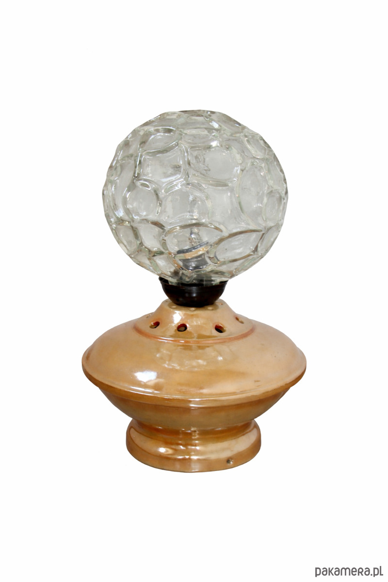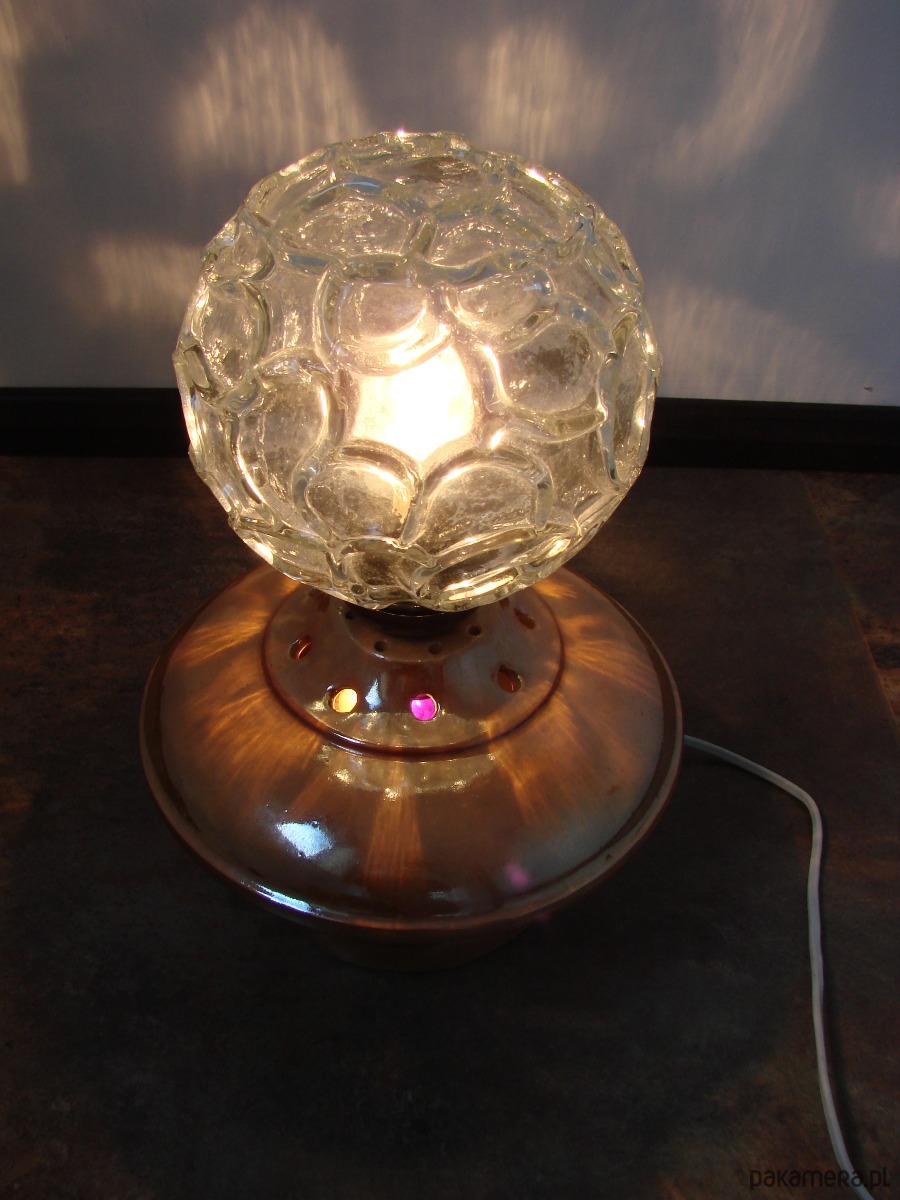 Charakterystyczna forma oraz ciepła kolorystyka sprawiają, że lampka doskonale wpisuje się w stylistykę vintage oraz wnętrza inspirowane designem PRL. Tłoczone szkło pięknie rozprasza światło, tworząc przyjemny, nastrojowy efekt.