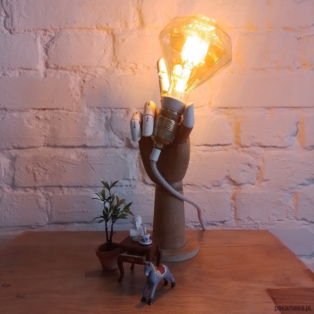 Nietypowa i intrygująca lampka w kształcie dłoni trzymającej oprawkę z żarówką. Idealna dla osób poszukujących niebanalnych, autorskich dekoracji wnętrz albo wyjątkowych prezentów.
