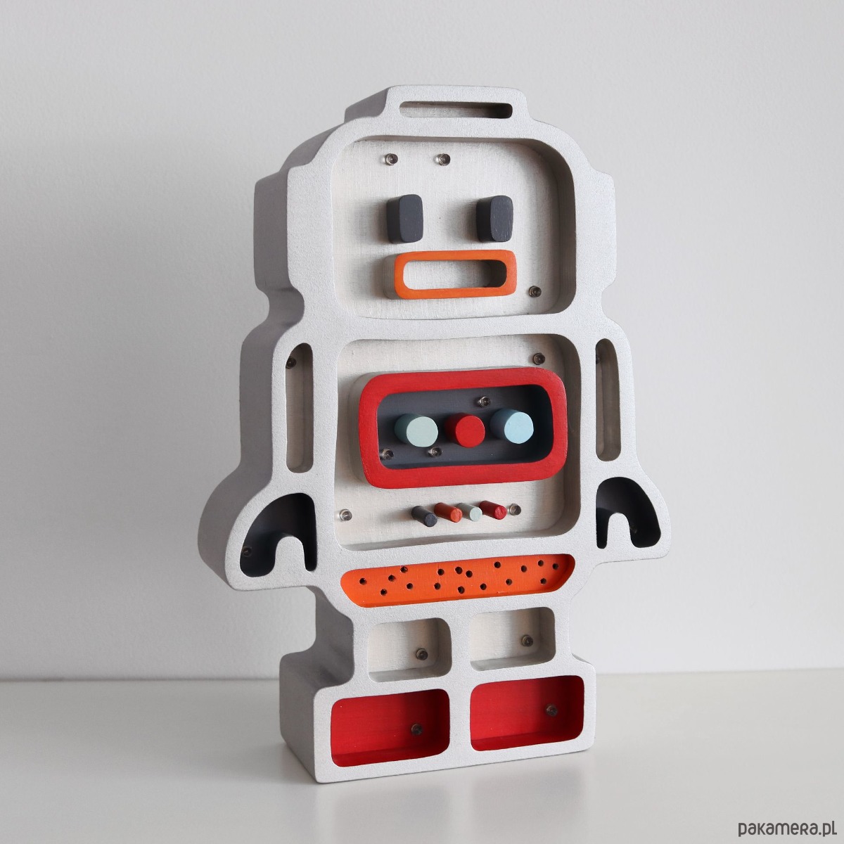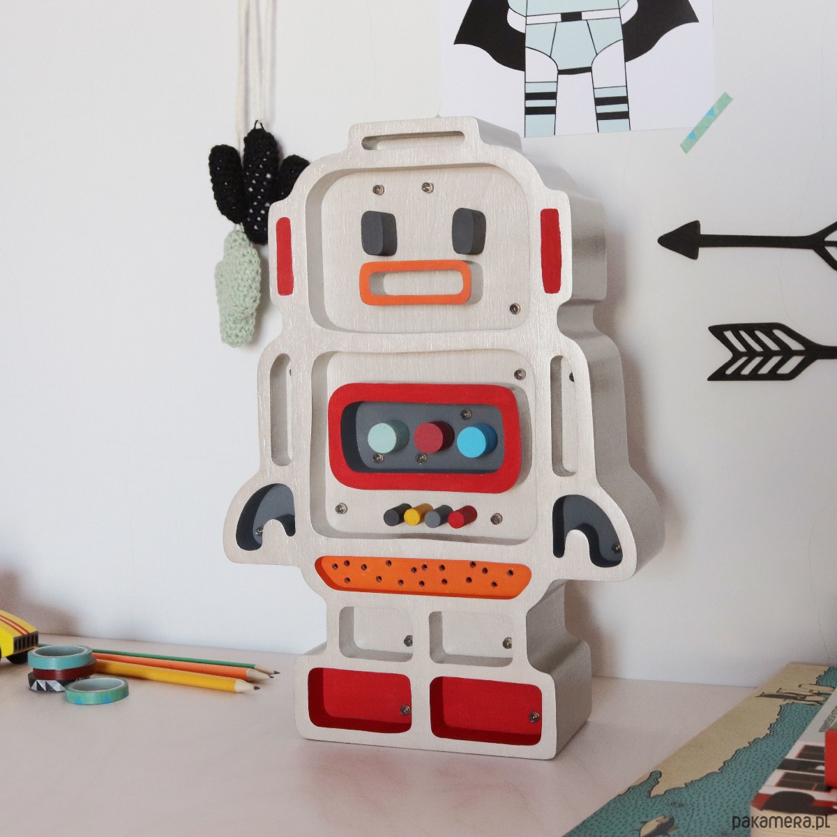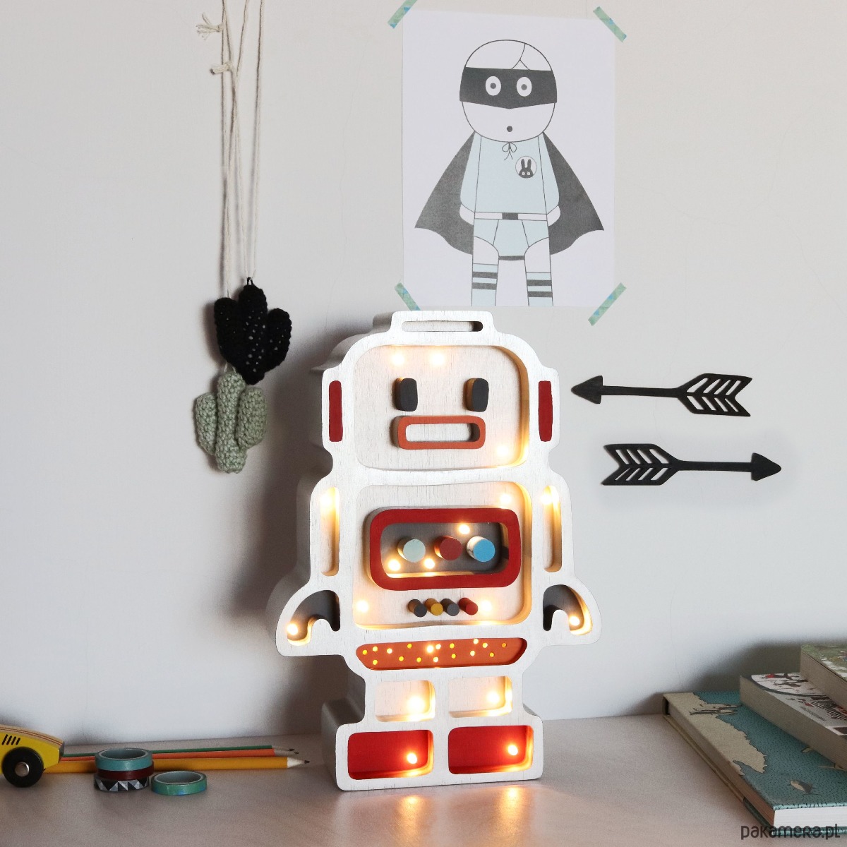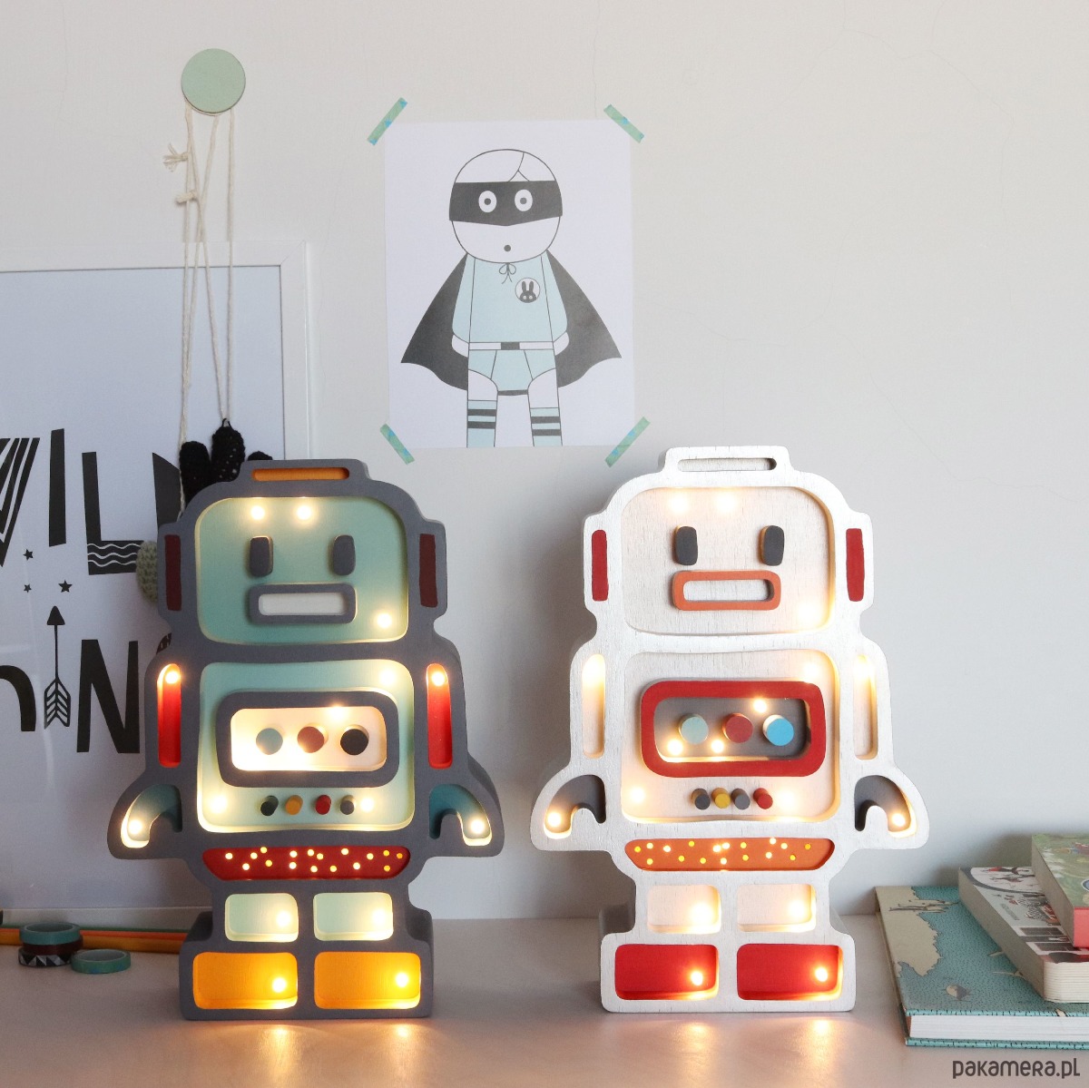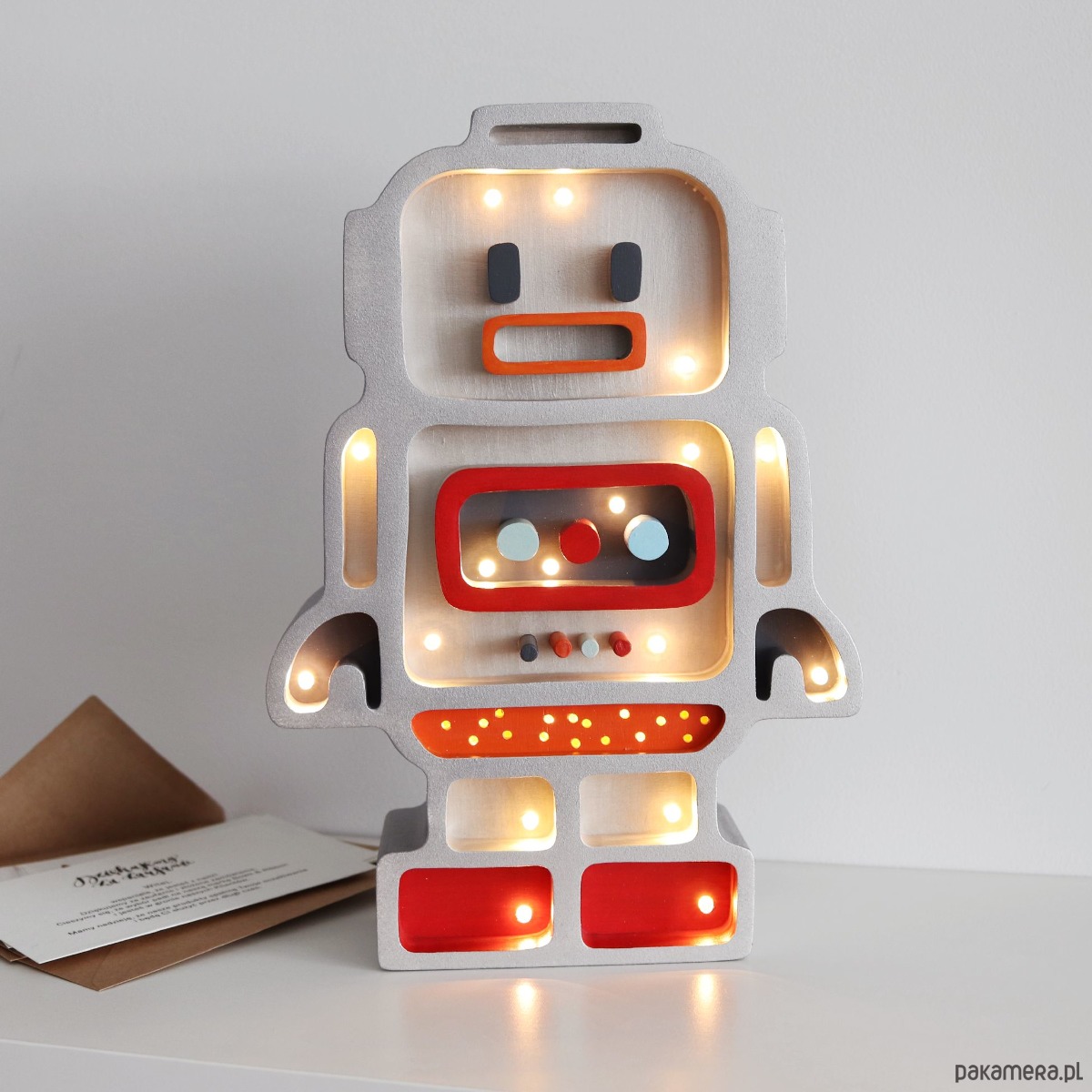 Urocza lampka w kształcie robota została zaprojektowana i ręcznie wykonana w naszej pracowni.