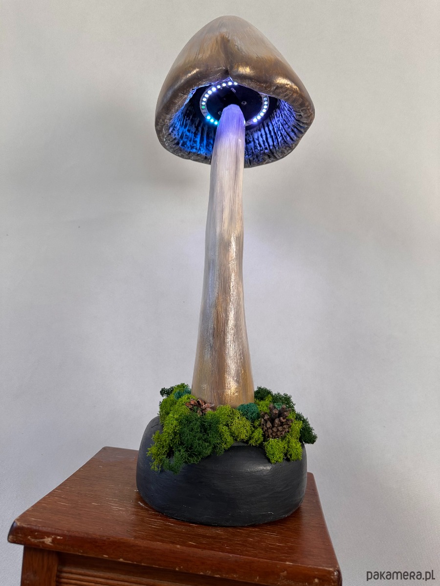 Przedstawiam wyjątkową, ręcznie wykonaną lampkę dekoracyjną w kształcie grzyba, która stanie się niepowtarzalnym elementem Twojego wnętrza. Jej elegancka kolorystyka oraz naturalne dodatki wprowadzą ciepłą i przytulną atmosferę do każdego pomieszczenia.