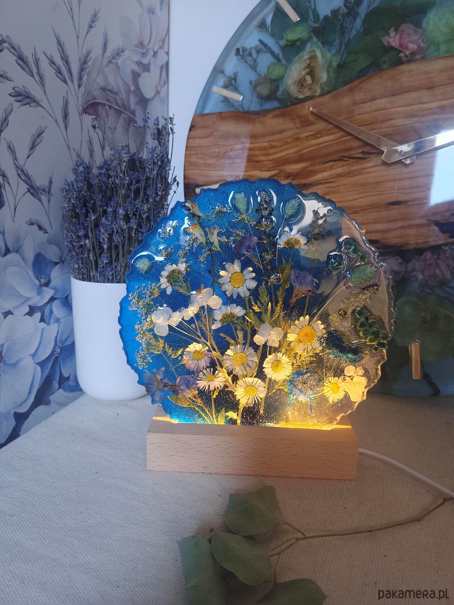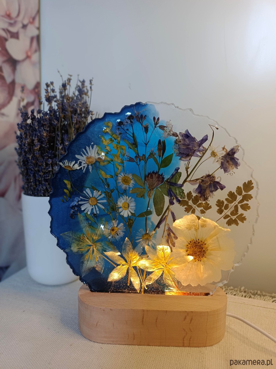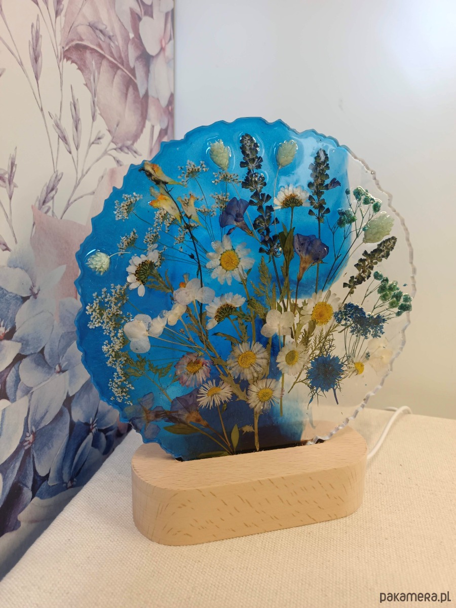 Lampka typu łąka tonacja niebieska - naturalne, suszone kwiaty w autorskiej kompozycji zamknięte w żywicy epoksydowej.