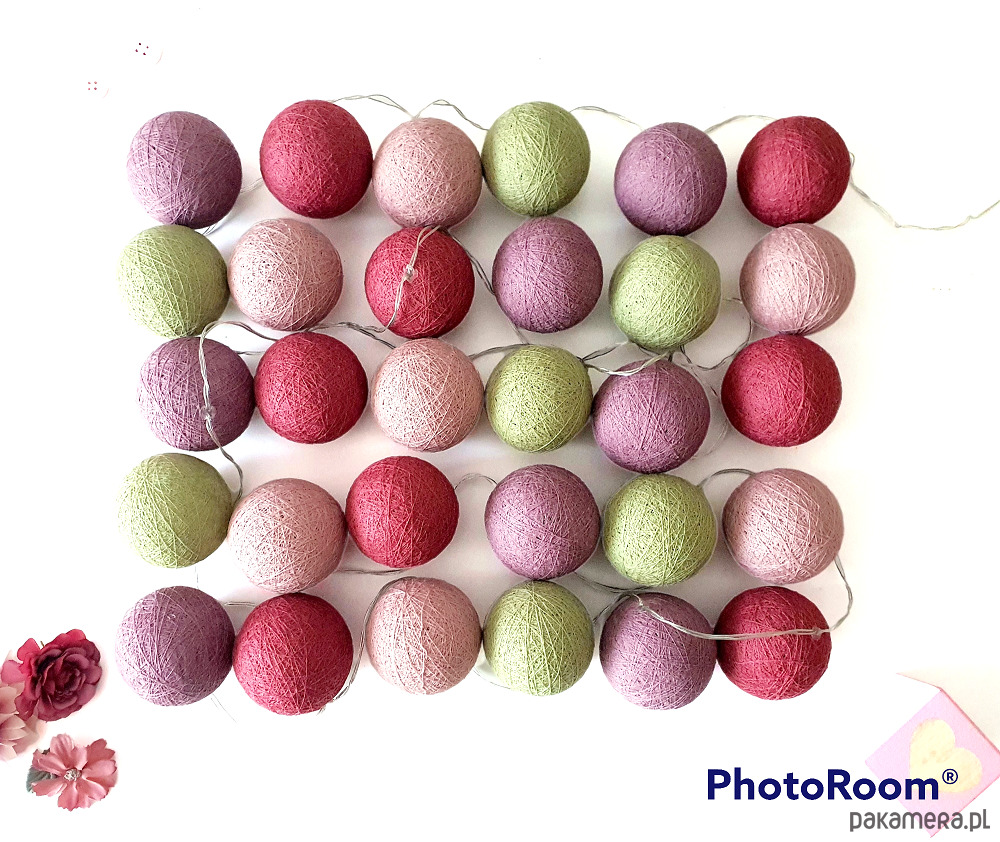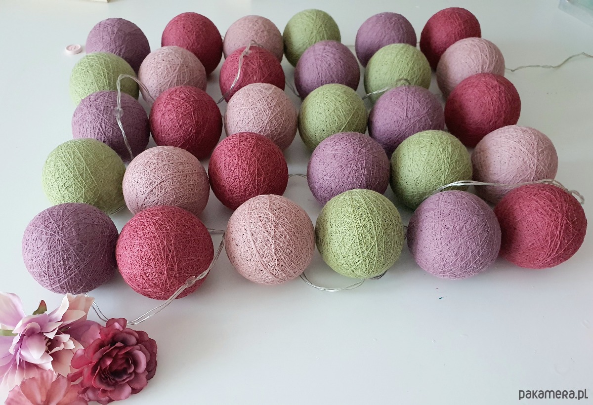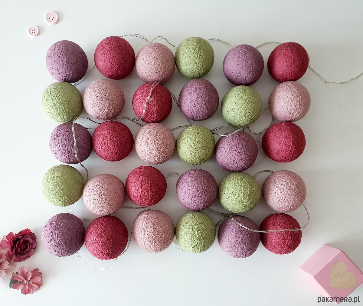 Lampki Cotton Balls 30 led, Malinowe, świecące kule na baterie