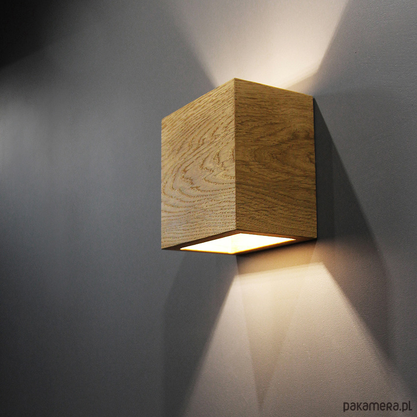 Dekoracyjna drewniana lampa ścienna wykonana z litego drewna dębowego.