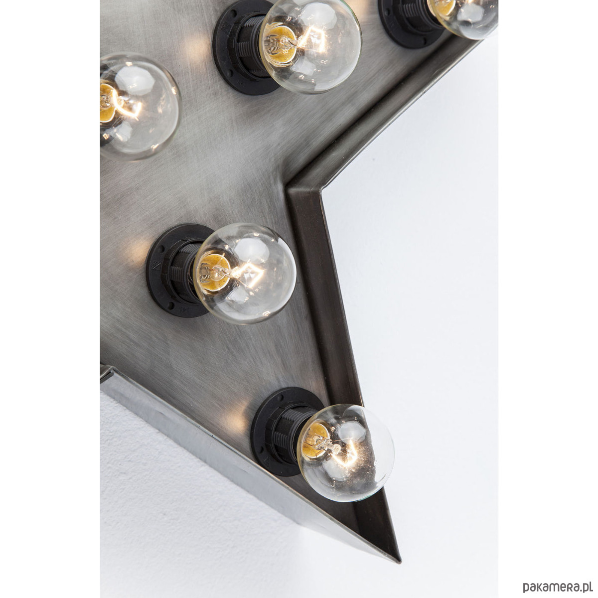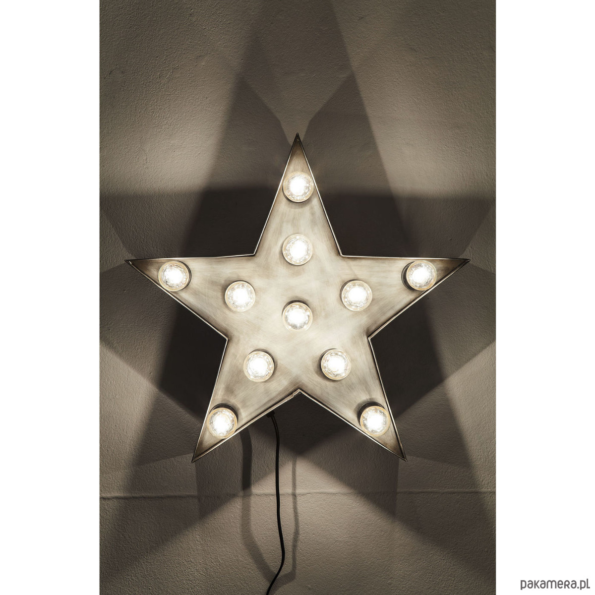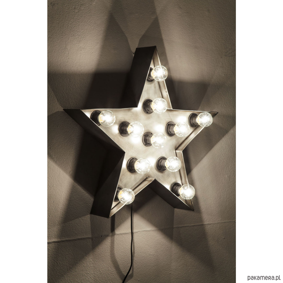 Lampa kinkiet w kształcie gwiazdy. Wykonana ręcznie z metalu, spawana w stylu vintage. Posiada 11 opraw na żarówki. Lampa jest jednocześnie dekoracją, można ją powiesić na ścianie, postawić na półce czy też posadzce. W każdym położeniu wygląda doskonale. Daje klimatyczne oświetlenie, stwarzając klimat we wnętrzu gdzie się znajduje.