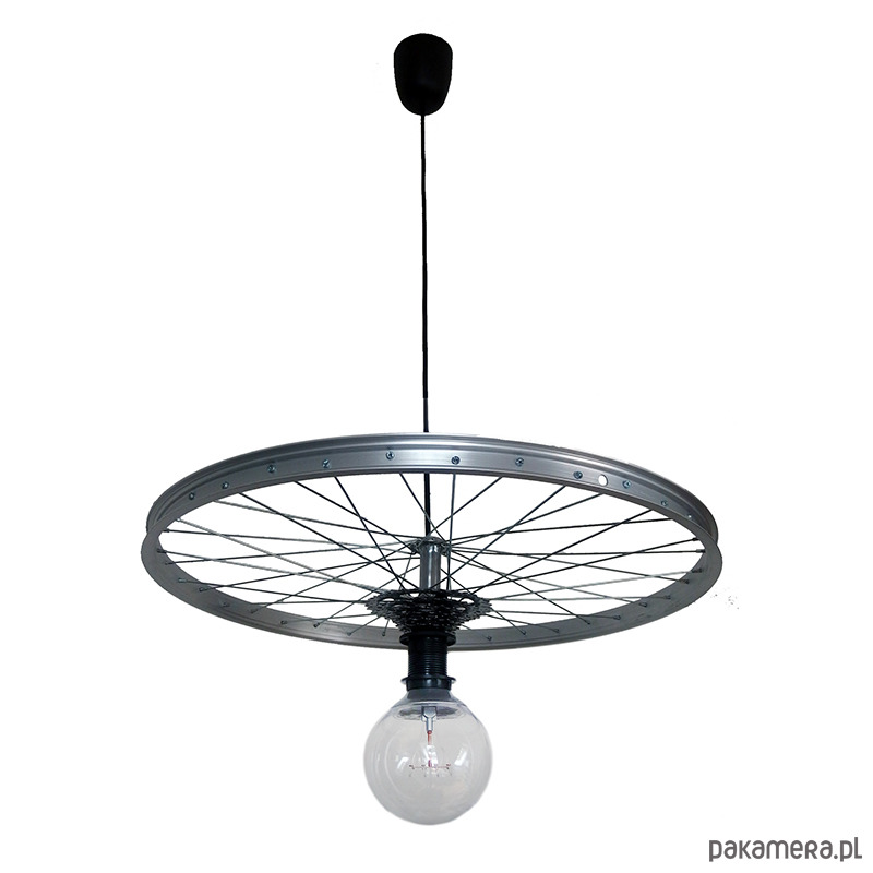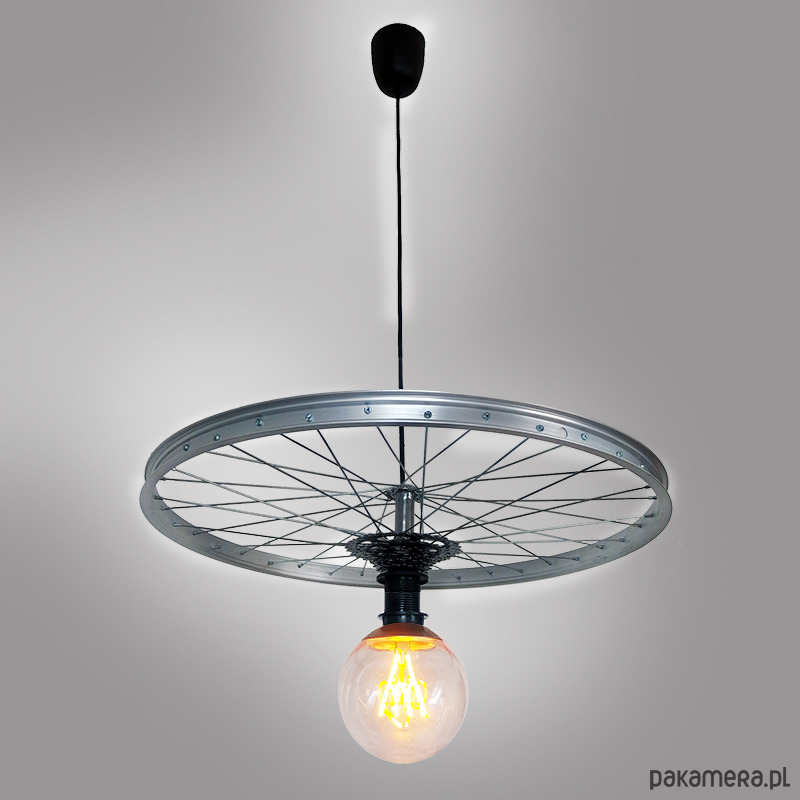 Lampa z serii bike design od Bikes Bazaar, wyjątkowa i niezwykła lampa wisząca,model Secret Light, lampa wykonana z oryginalnych części rowerowych: koło aluminiowe,kaseta. Ozdobna duża żarówka LED o średnicy 12 cm. Świetnie wpasuje się w wystrój industrialnych wnętrz i nie tylko, świetna na aranżacje do restauracji, sklepów, hoteli.