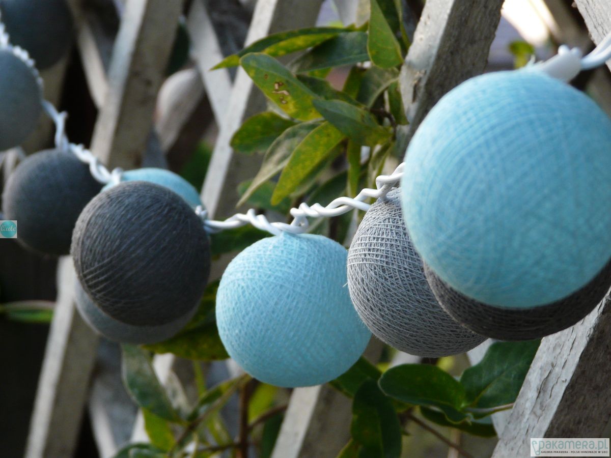 Piękne, nastrojowe lampki składające się z 10 ręcznie robionych kul o średnicy ok. 6 cm. Girlanda lampki/kule z przędzy bawełnianej, tzw. Cotton Balls Light Nadają uroku i klimatu każdemu wnętrzu. Delikatne światło zapewnia niepowtarzalny nastrój. Światło nie razi w oczy. Lampki są gotowe do zawieszenia. Nie wymagają żadnego montażu. W zestawie 2 zapasowe żarówki i instrukcja obsługi. Całkowita długość girlandy ok. 2,8 m. Kolory: turkusowy, szary, jasnoszary. Zasilanie: 220V Lampki wysyłamy w odpowiednio zabezpieczonym pudełku kartonowym.
