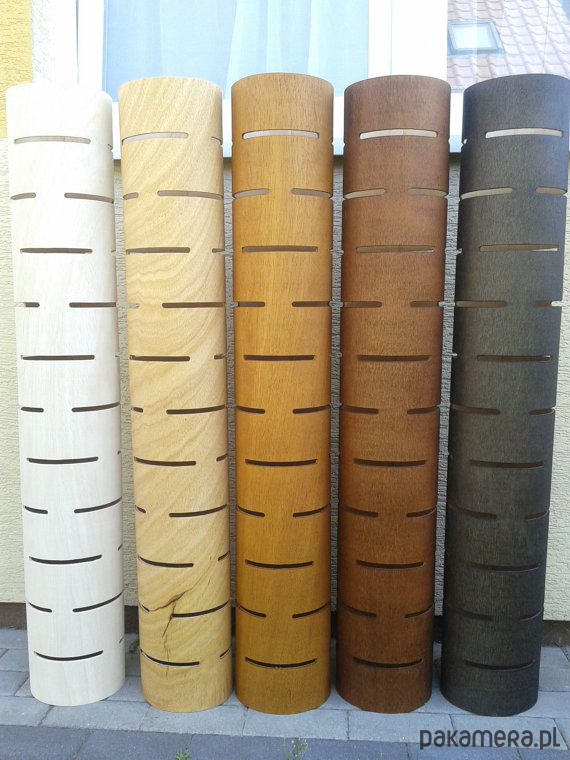 Lampa podłogowa, która stanie się świetną dekoracją salonu zarówno w dzień jak i w nocy. Faktura drewna, szczególnie widoczna przy jasnym kolorze bejcy doskonale podkreśla naturalny charakter lampy za dnia, a ciepłe światło przebłyskujące przez szczeliny w nocy sprawia, że nie można od niej odwrócić wzroku. Wysokość lampy to 120cm a jej średnica 20cm, wykonana jest z 5mm sklejki giętej. Wyposażona w 2szt oprawek E27 oraz 2,5m kabel zasilający z przełącznikiem. Zabejcowana z zewnątrz na kolor jak na ostatnim zdjęciu: biały, naturalny,olcha,teak lub czarny.