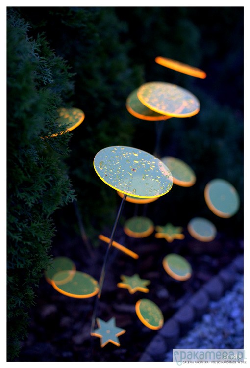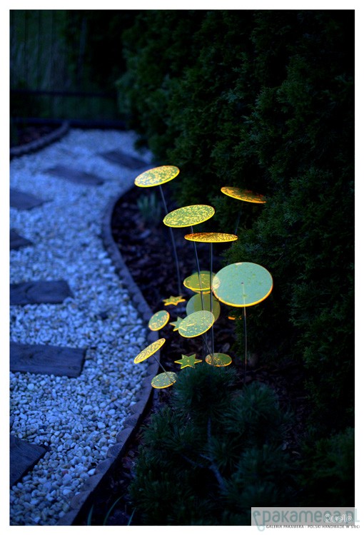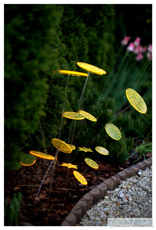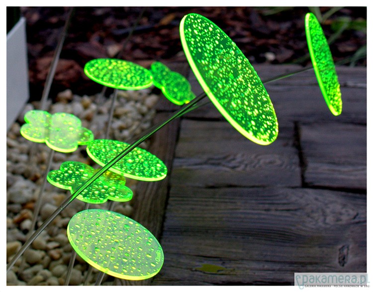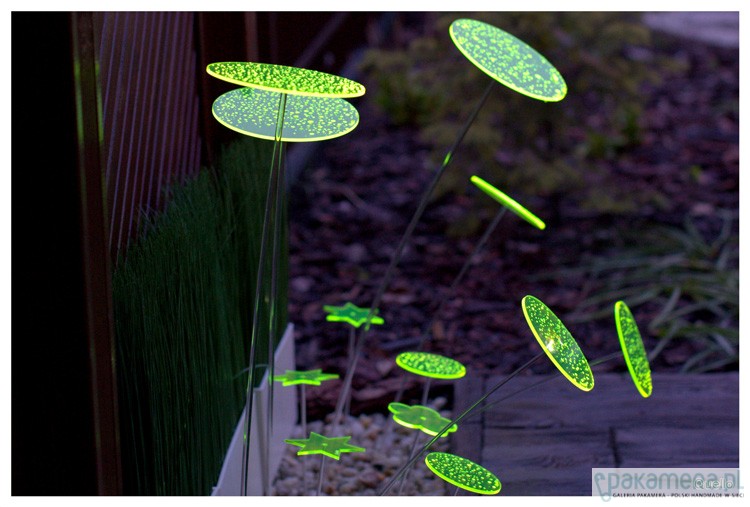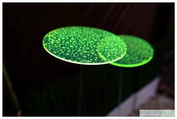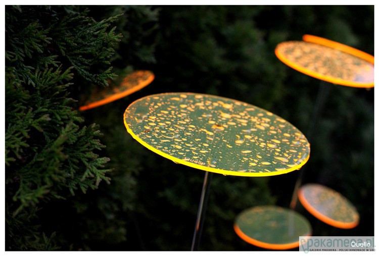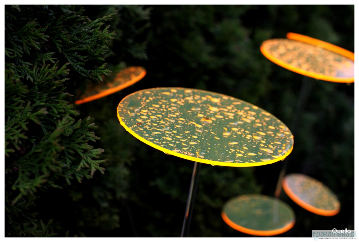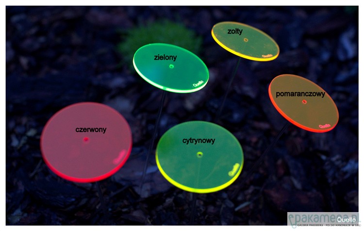 Nowość 2014. Quello to absolutna nowość na rynku. Jest to połączenie współczesnej filozofii, designu i natury. Połączenie codzienności i mistyki. Łąka z produktów Quello to magiczne miejsce, które zawsze wygląda tak samo, niezależnie od pory roku. Ta metaforyczna łąka, rodzi się ze światła i barwy. Elementy Quello absorbując światło dzienne przetwarzają niewidzialne fale słoneczne w widzialną energię. Quello świeci do zapadnięcia zmroku. Największy efekt jest wtedy, gdy nie ma bezpośredniego słońca i zapada zmierzch. Wspaniale wygląda w ogrodzie pośród roślin, w doniczkach balkonowych oraz w domu na parapecie. Wszędzie tam gdzie Quello jest wyeksponowane na działanie promieni słonecznych i sztucznego światła. Na tej stronie są sprzedawane kółka o szerokości 15 cm na czarnych metalowych prętach o wysokości 75 cm lub 100 cm. Jest jedna cena dla dwóch różnych wysokości. Brak przezroczystych nóżek. Quello występuje w 5 kolorach. Cena dotyczy 1 sztuki Quello