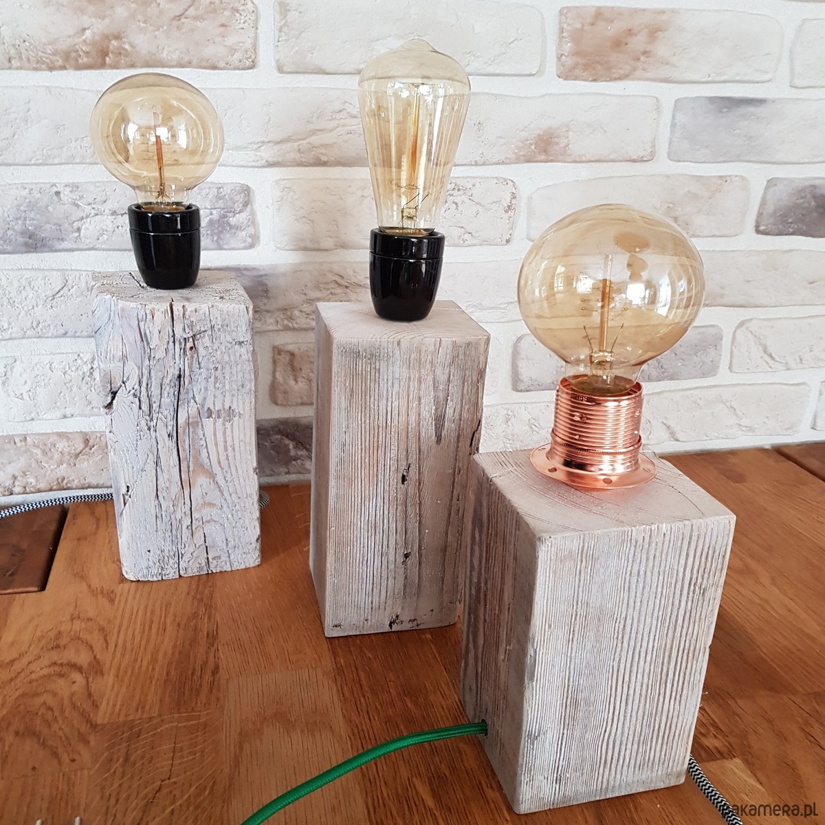 Ciekawa lampa autorska. Podstawa wykonana jest z drewna z odzysku o wysokości około 26cm. Zwieńczona jest piękną czarną oprawką porcelanową E27 oraz przewodem w oplocie w kolorze czarno białym z wyłącznikiem i wtyczką. Lampa sprzedawana jest z dekoracyjną żarówką o ciepłej, nastrojowej barwie.
