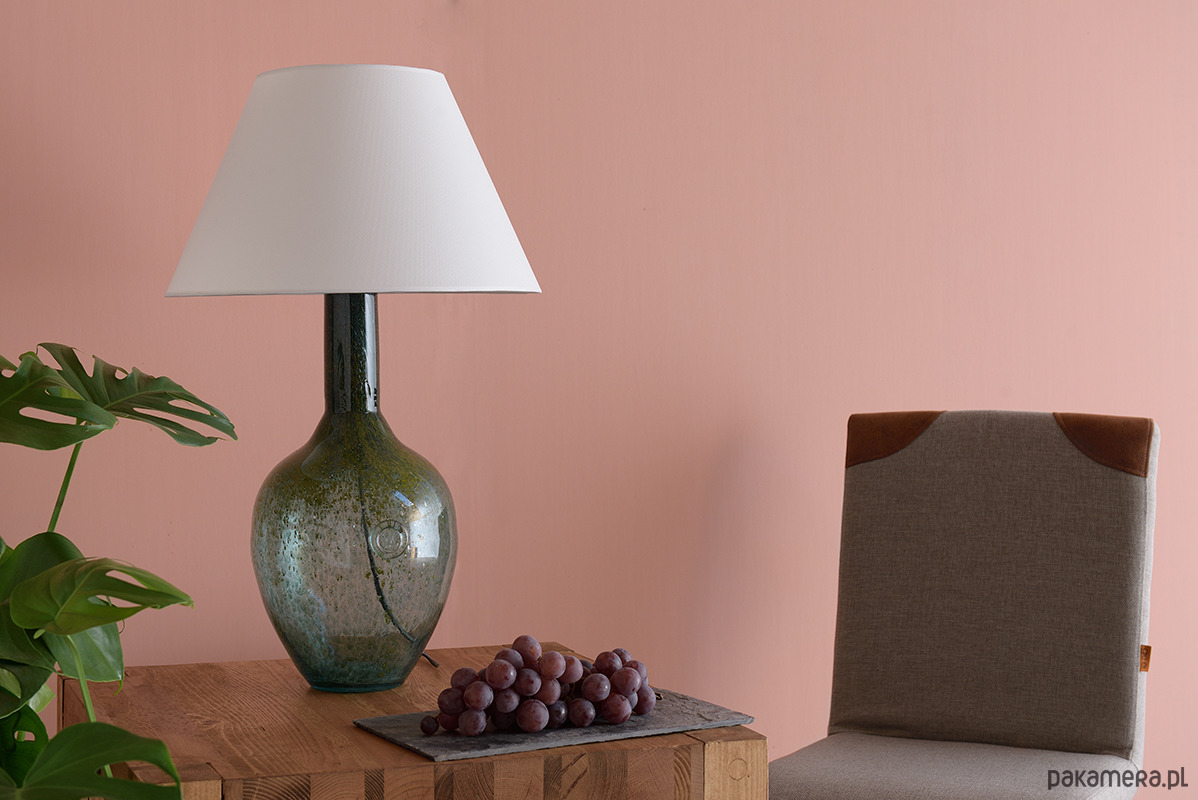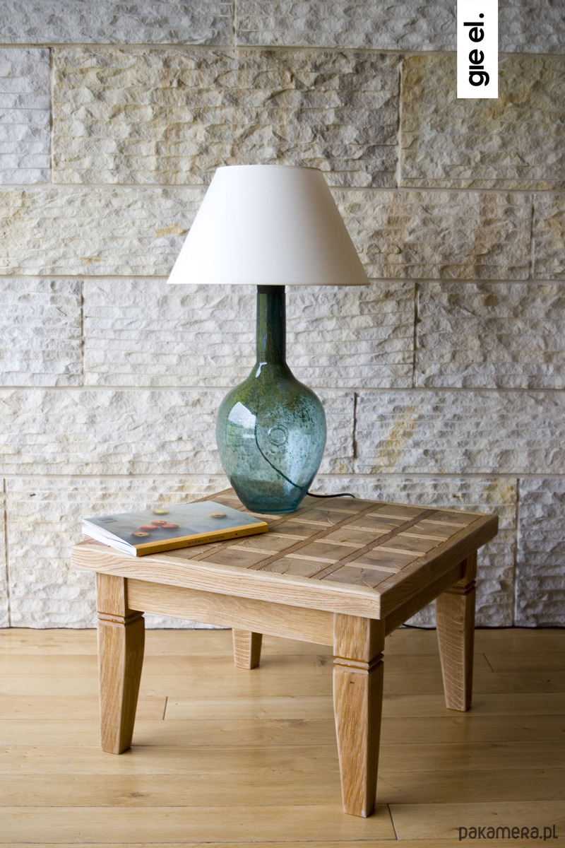 Lampa stołowa o ciekawym kształcie. W kolorze turkusowym. Tekstylny biały abażur, harmonijnie rozpraszający światło. Szkło ręcznie formowane, przez Polskich rzemieślników. Każda lampa posiada niepowtarzalny odcień oraz kształt. Znakowana logiem Gie El.