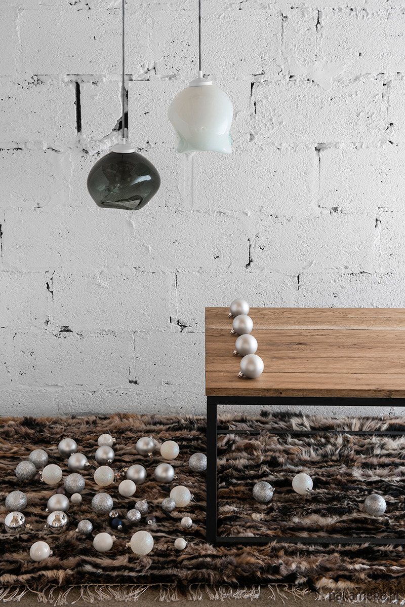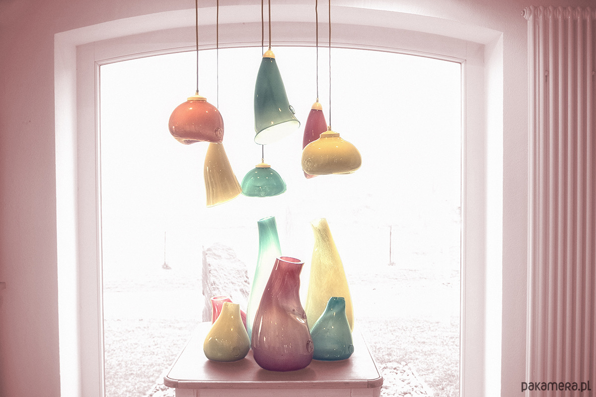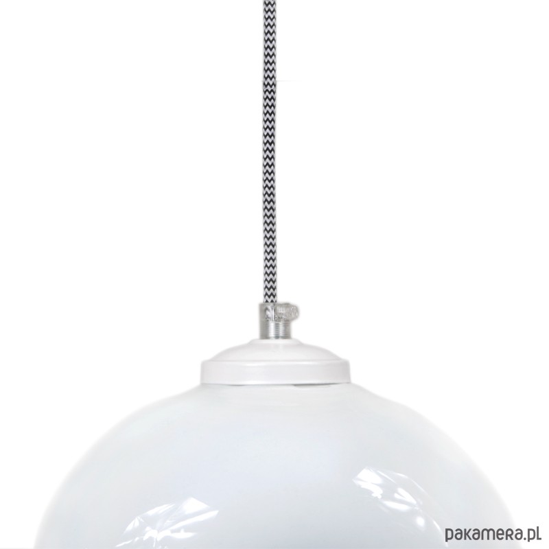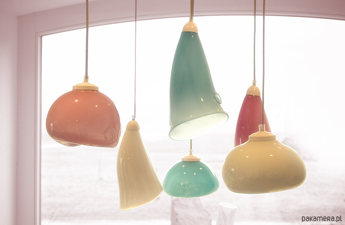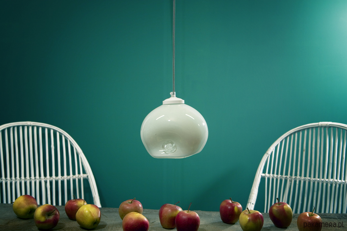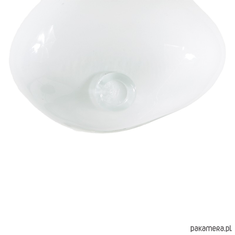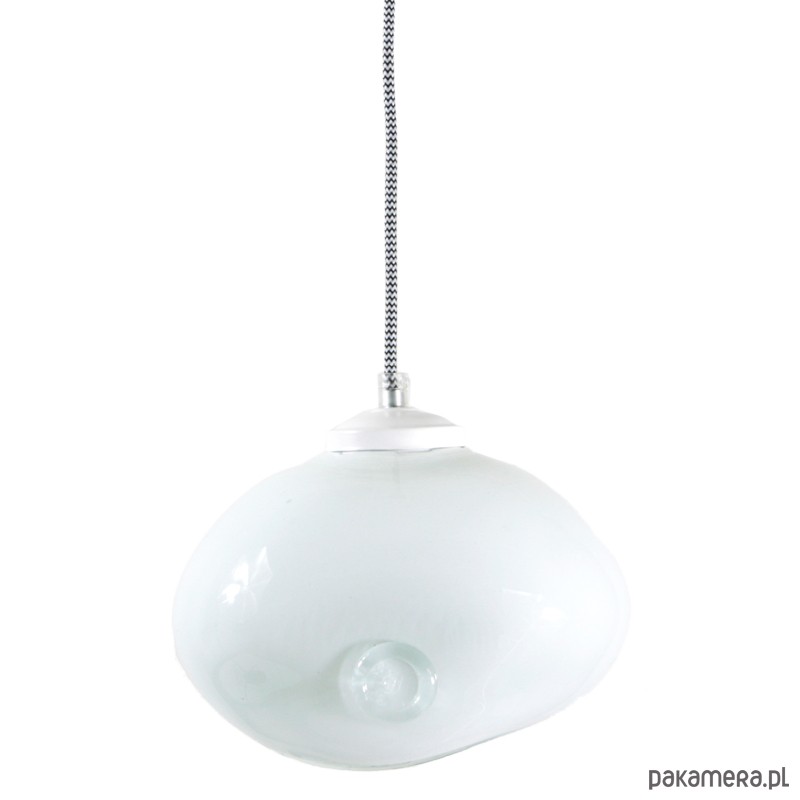 Szklana lampa wisząca, o interesującym kształcie i niezwykłym odcieniu pastelowej bieli. Szkło ręcznie formowane, przez Polskich szklarzy. Każda lampa posiada niepowtarzalny odcień oraz kształt. Znakowana logiem Gie El.