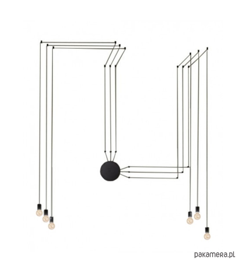 Lampa składa się z sześciu czarnych kabli o długości 8m każdy, opraw na żarówki E27, metalowej puszki o średnicy 12 cm oraz czarnych metalowych uchwytów na kable.