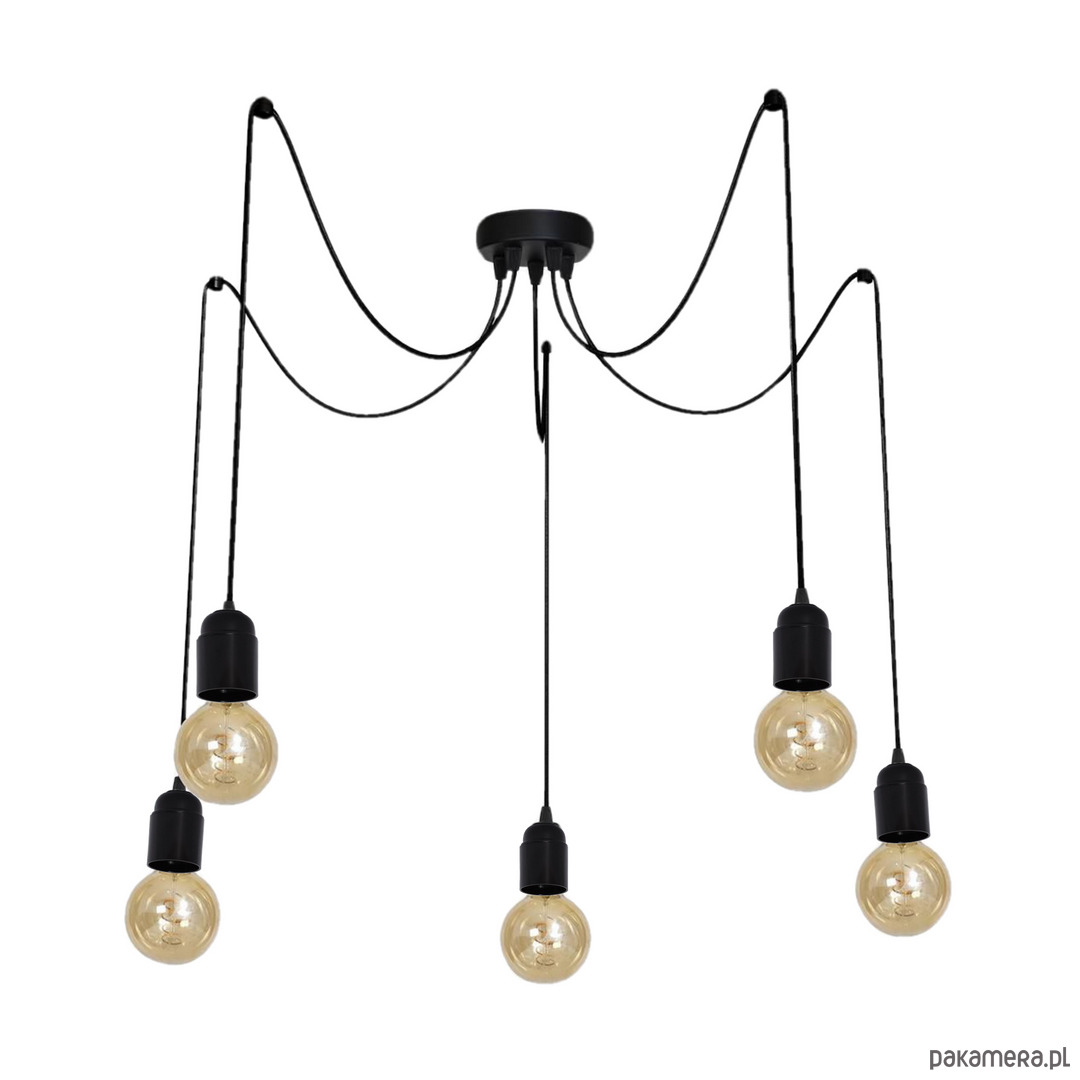 Lampa wykonana z 5 kabli w czarnej polwinitowej izolacji o długości 140 cm każdy i 5 bakelitowych opraw na żarówki E27.