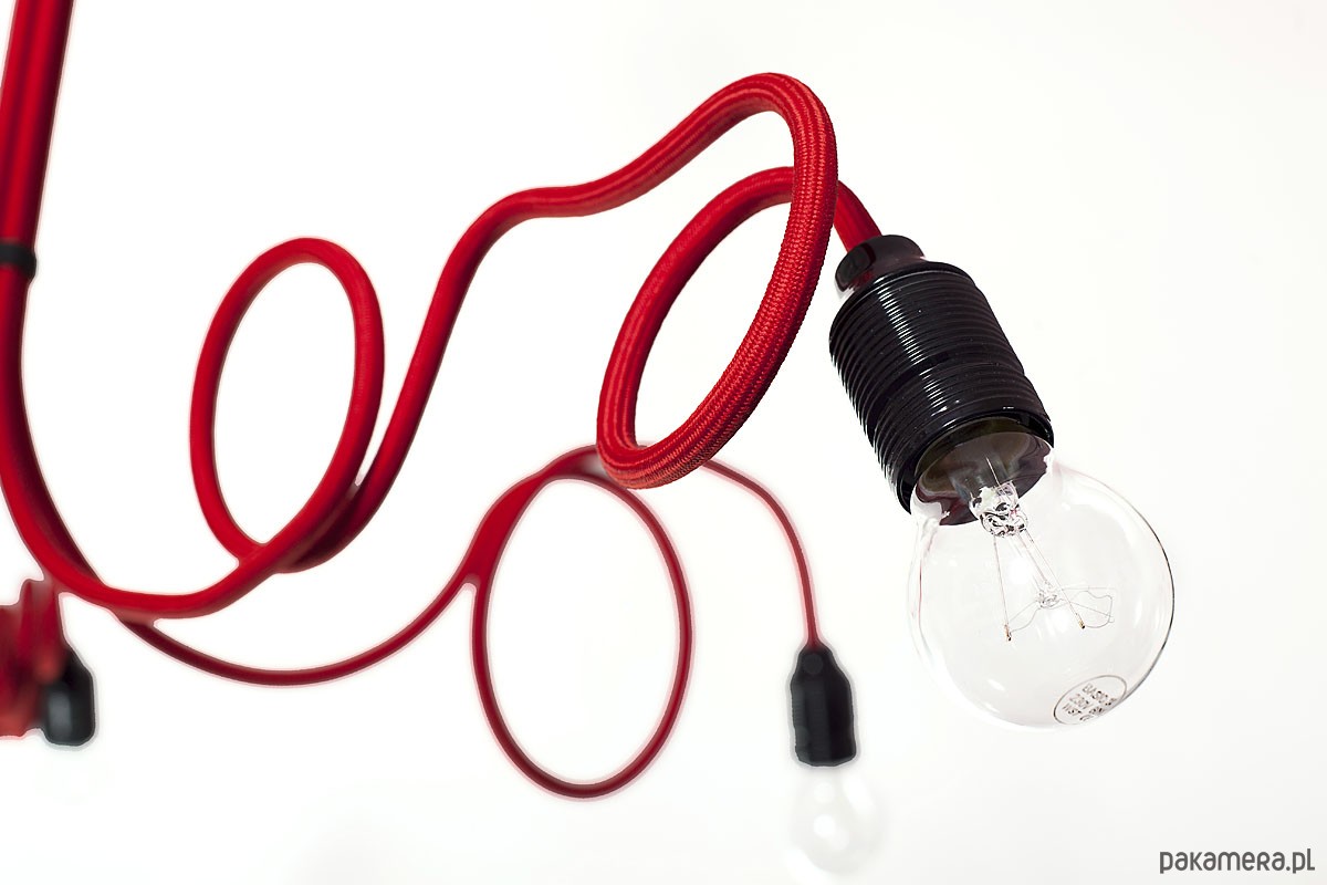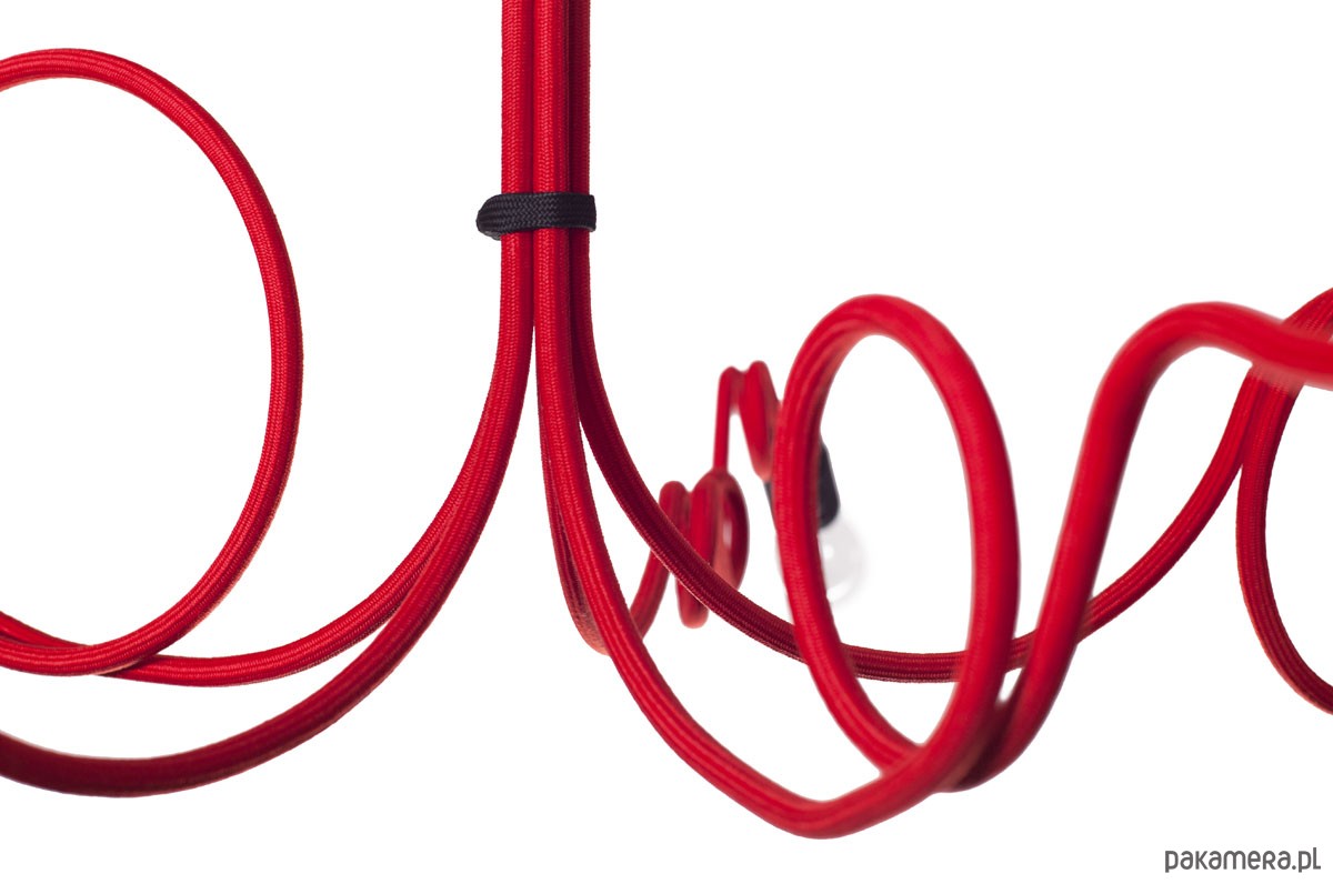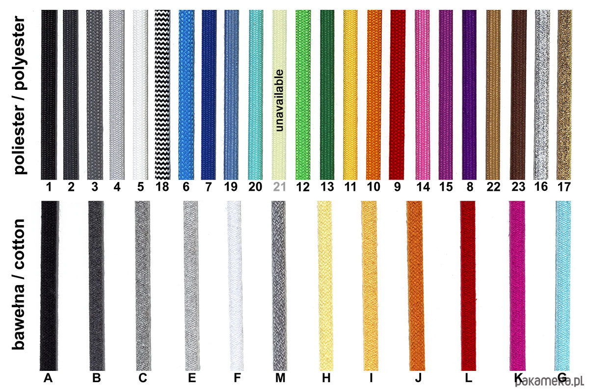Oplot kabla poliestrowy w kolorze czerwonym - tak jak na zdjęciu, oprawki metalowe w kolorze czarnym, podsufitka plastikowa w kolorze czarnym.