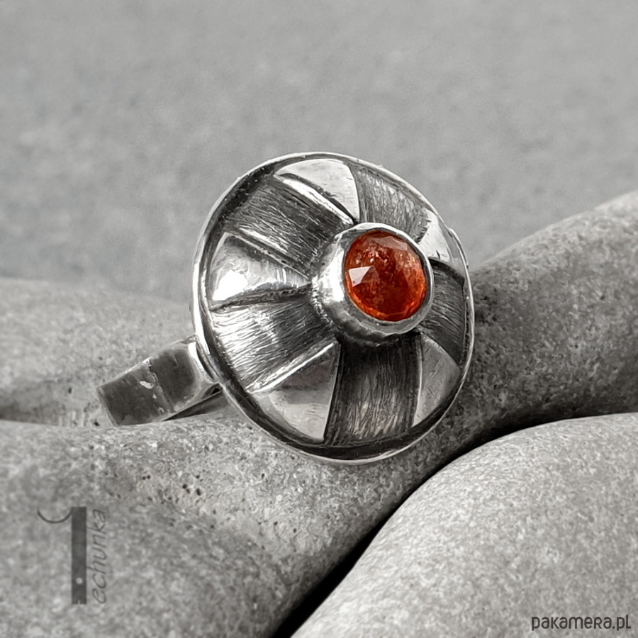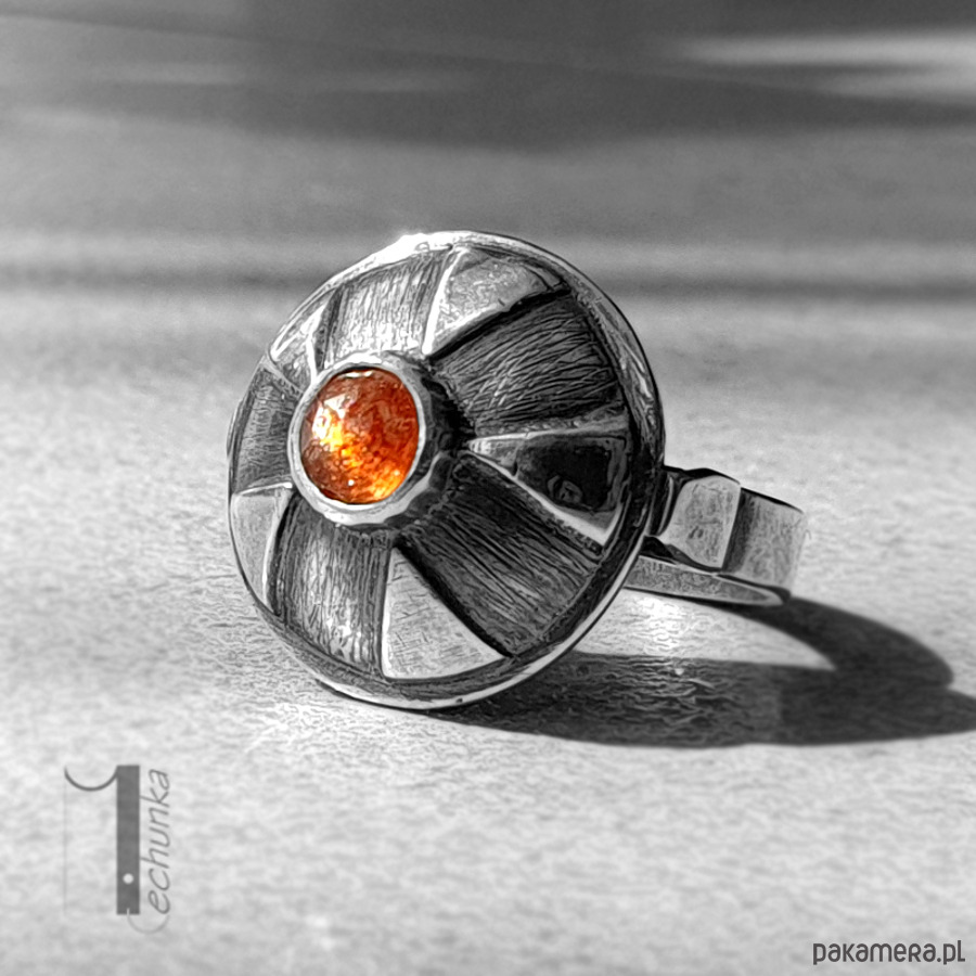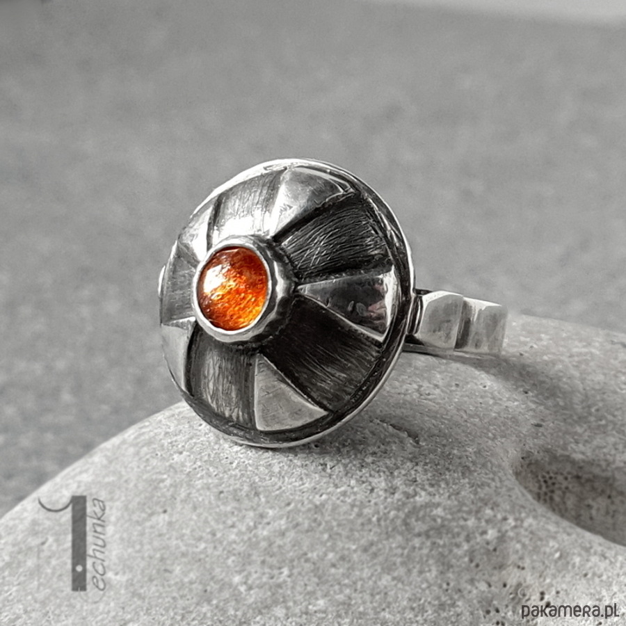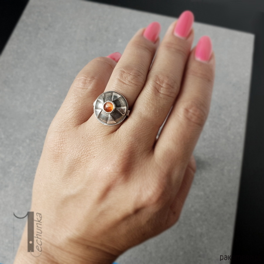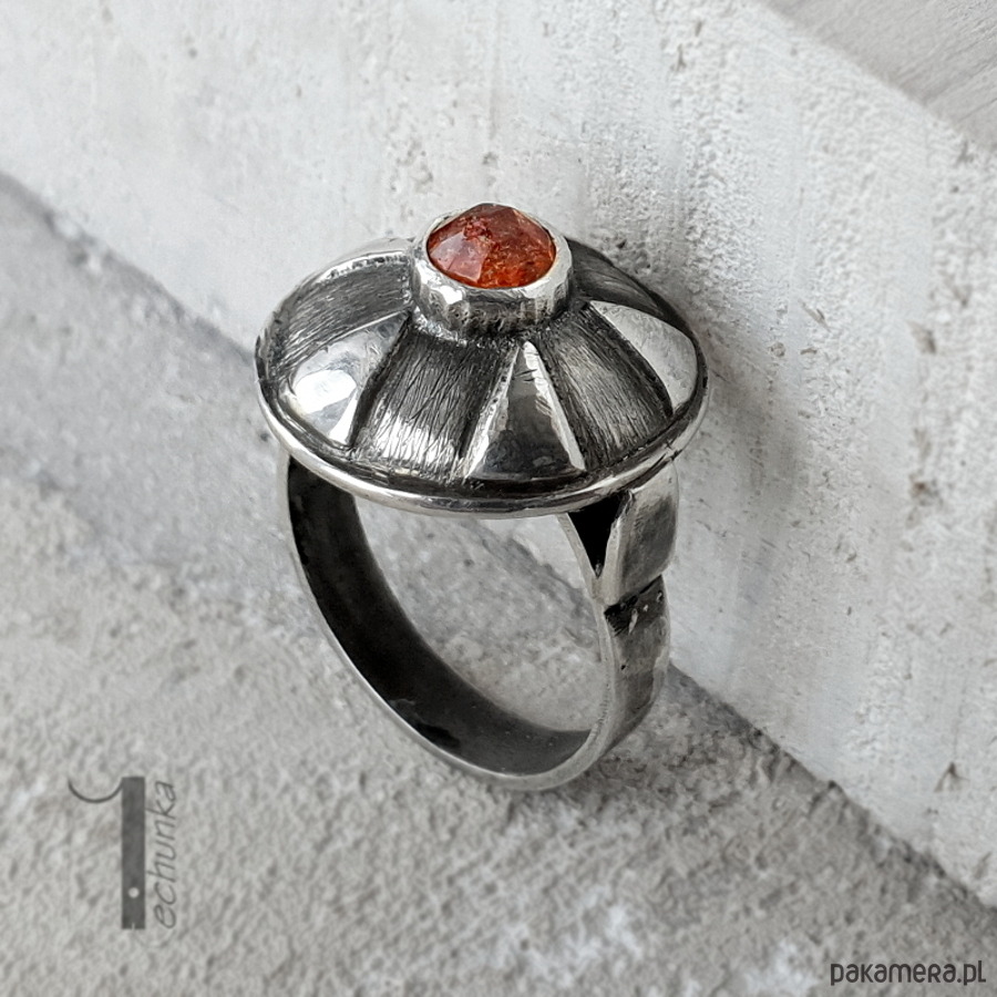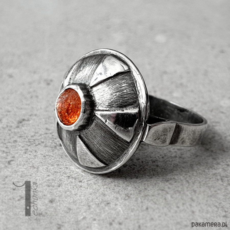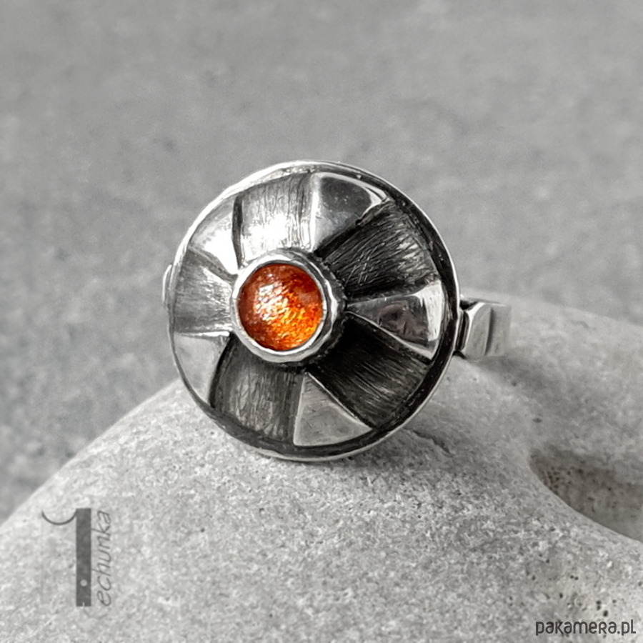 Srebrny pierścień z kamieniem słonecznym. Pierścionek zdobi ręcznie zdobiona kopuła zwieńczona okrągłym fasetowanym kaboszonem kamienia słonecznego. Całość wykonana ręcznie w jednym niepowtarzalnym egzemplarzu. Pierścionek został postarzany, młotkowany, matowiony i zoksydowany. Średnica kopułki pierścionka: ok 17mm. Rozmiar jubilerski obrączki 14 . Biżuteria zostanie ozdobnie zapakowana.