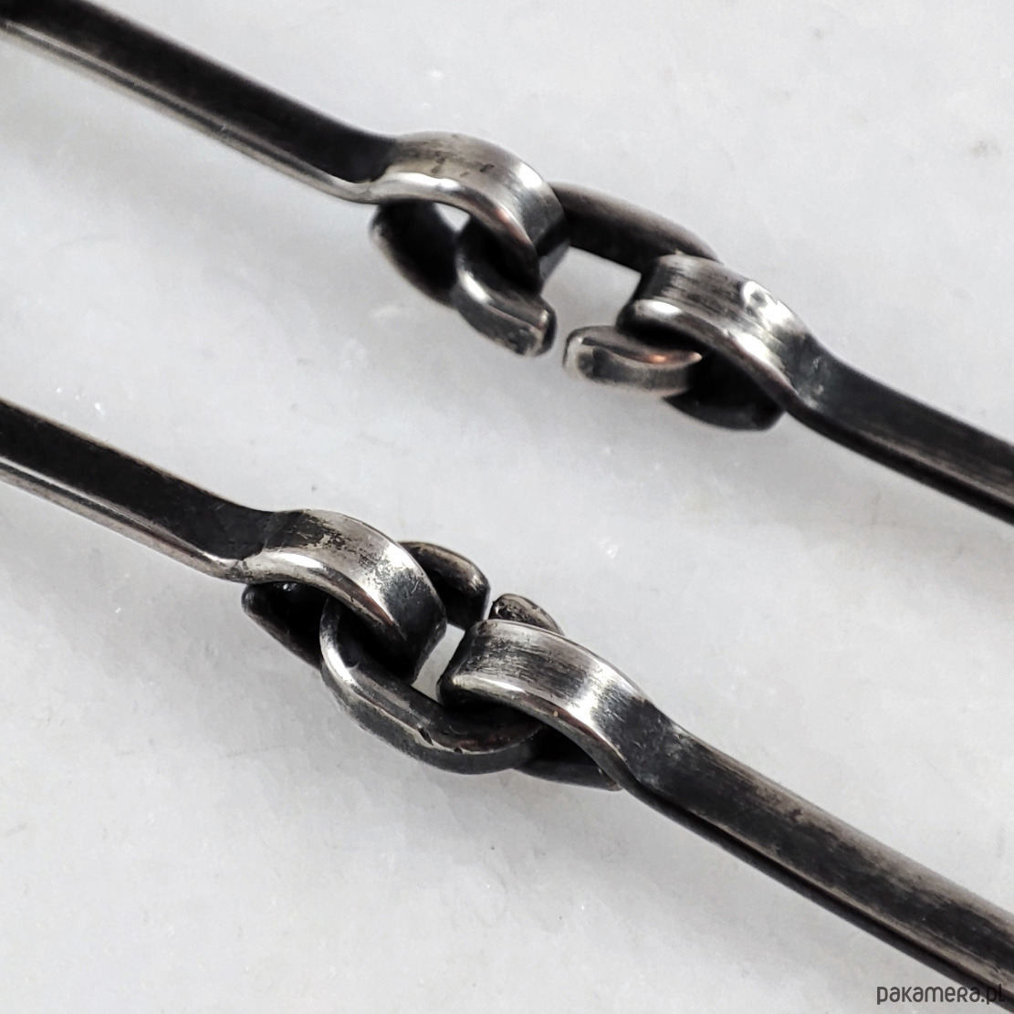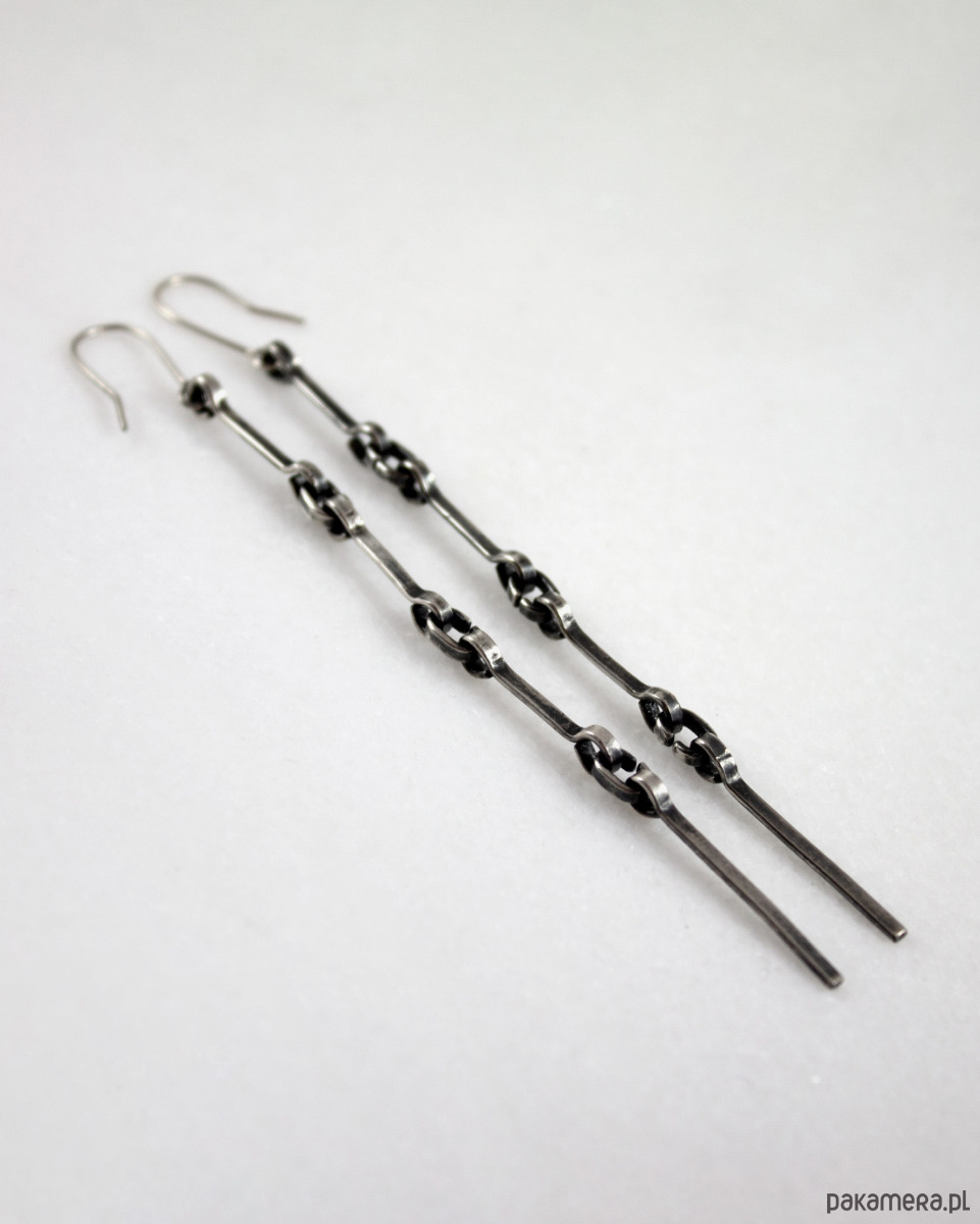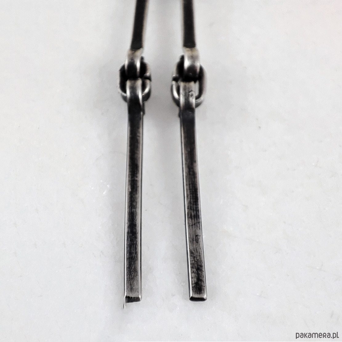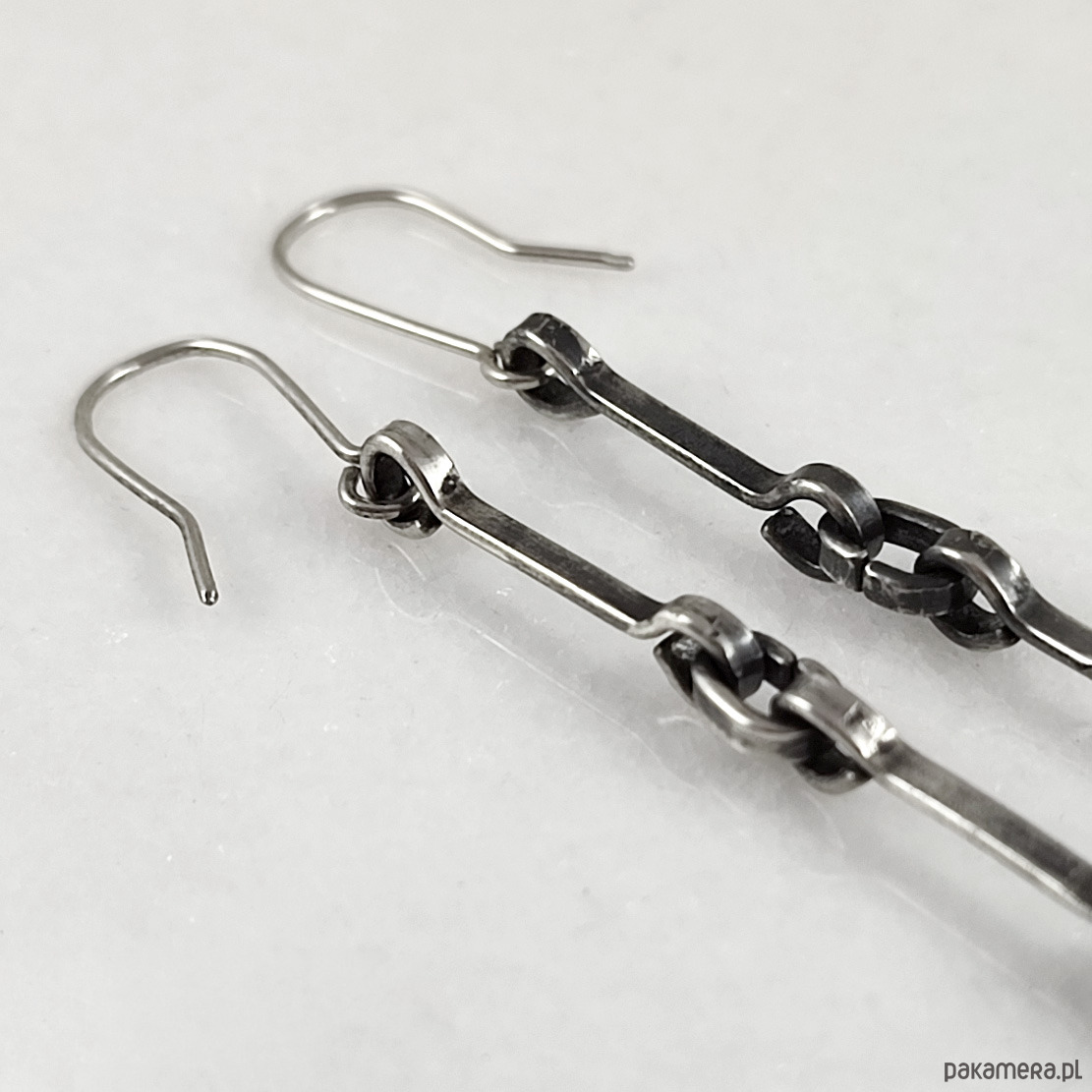 Wykonane ręcznie ze srebra próby 925. Mają prosty, lekko nieregularny kształt i fakturę podkreśloną ciemną patyną uzyskaną w procesie oksydacji (bez użycia barwników).