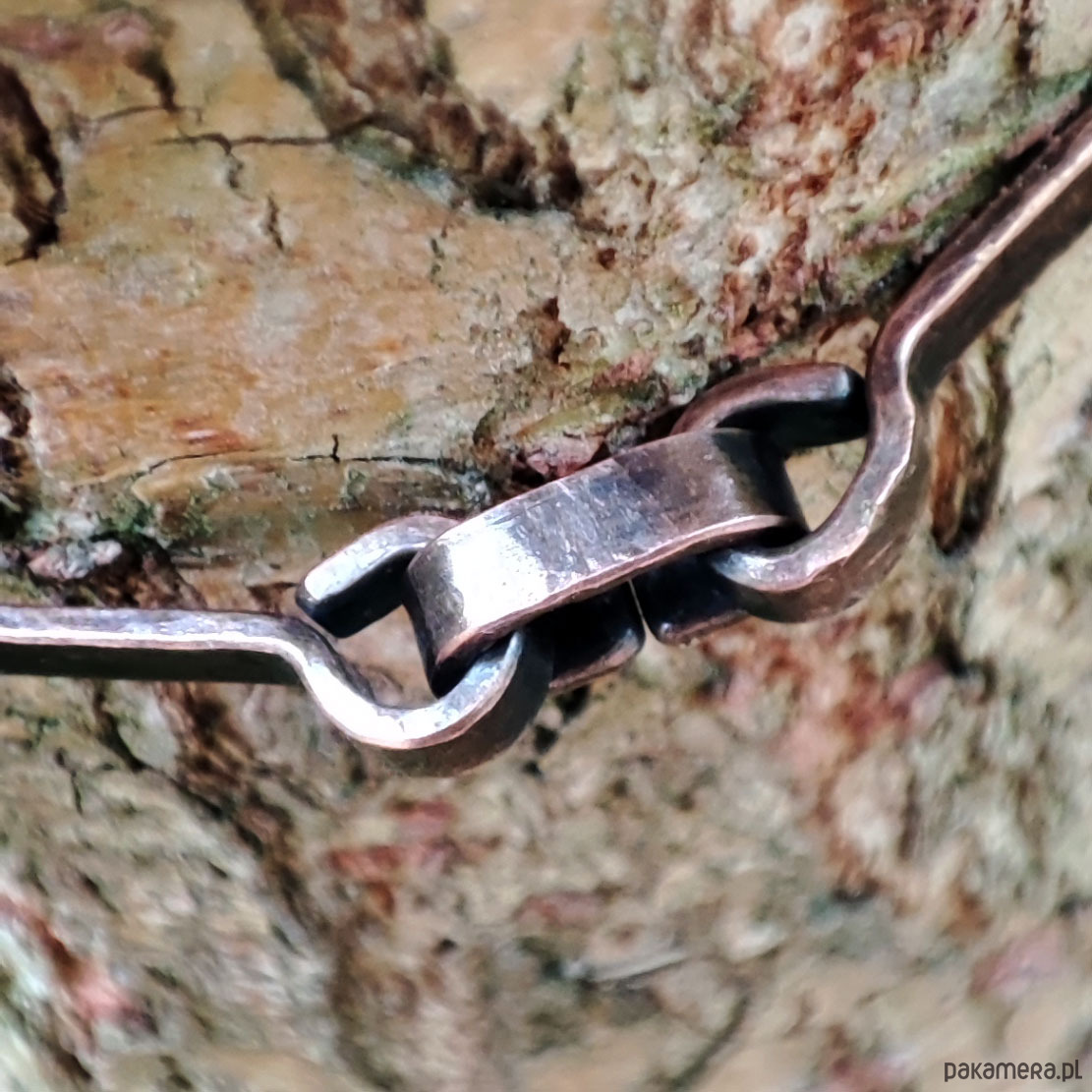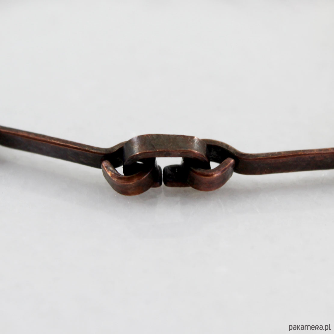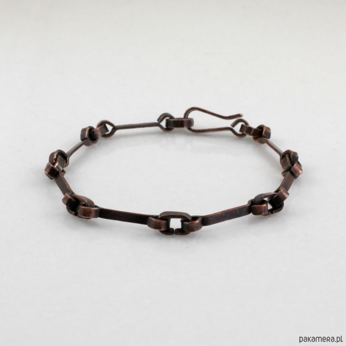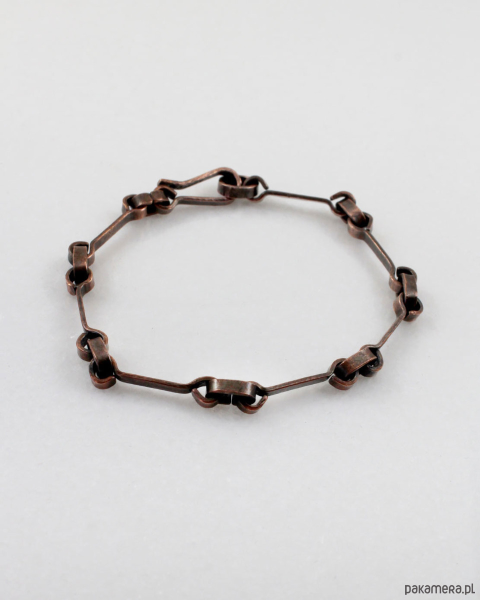 Bransoletka została wykonana w całości z grubego miedzianego drutu, odpornego na odkształcenia. Proste ale mocne zapięcie. Lekka nieregularność jest efektem zamierzonym. Faktura została podkreślona ciemną patyną uzyskaną w procesie oksydacji (bez użycia barwników).