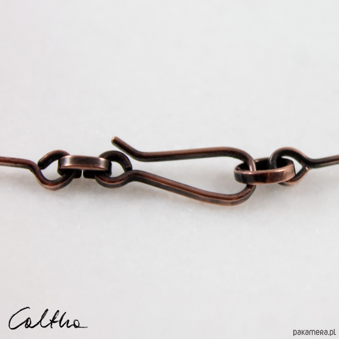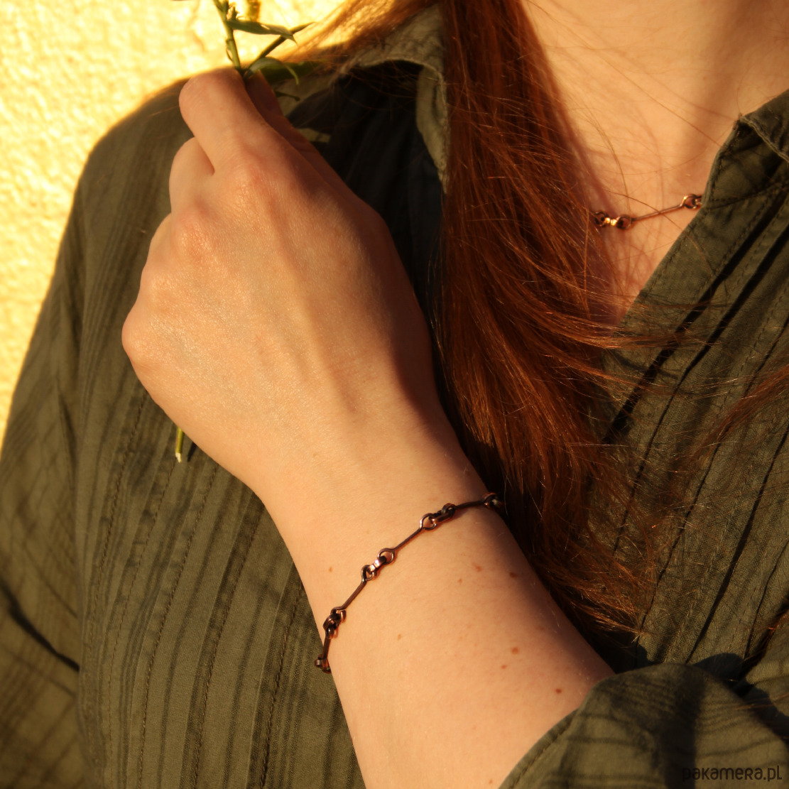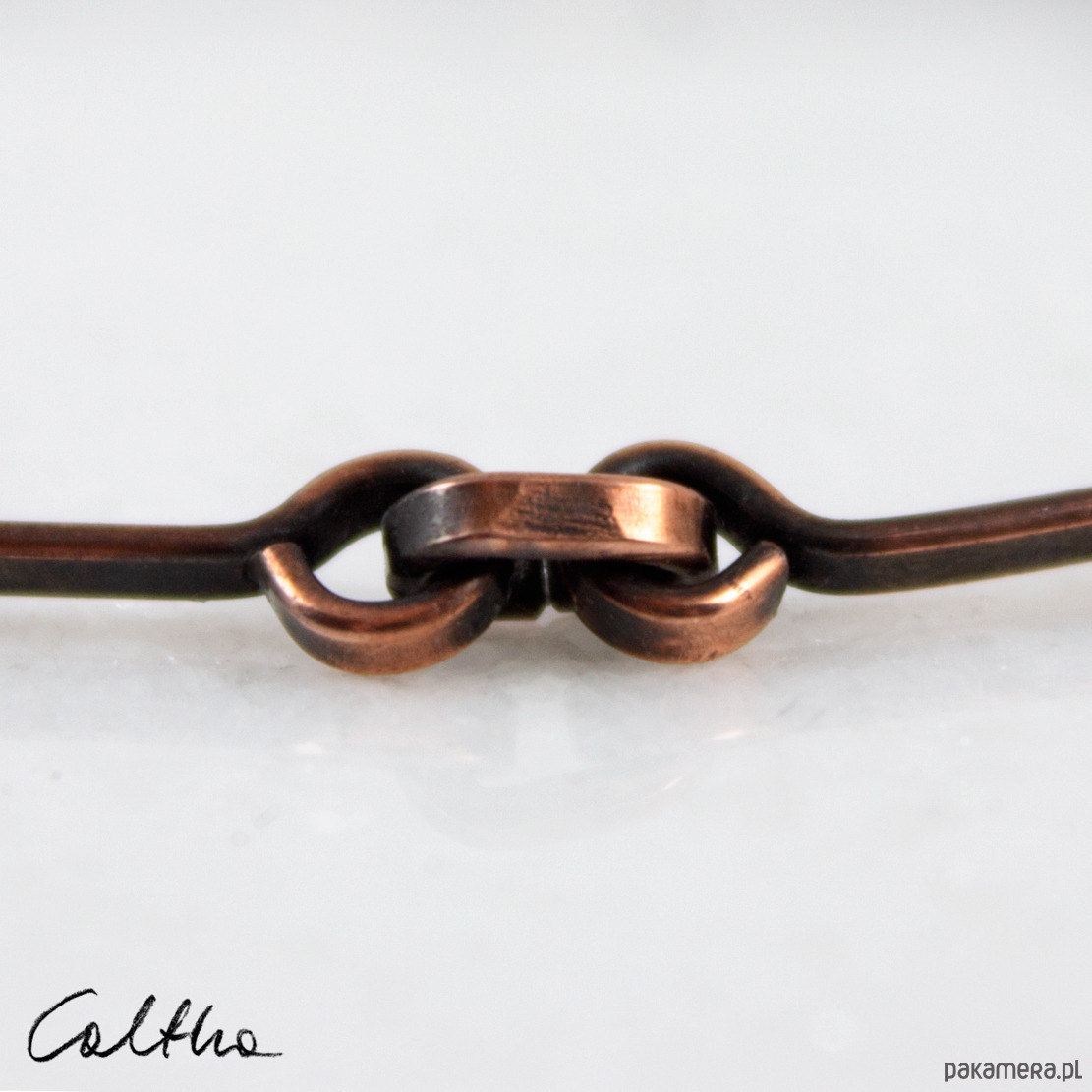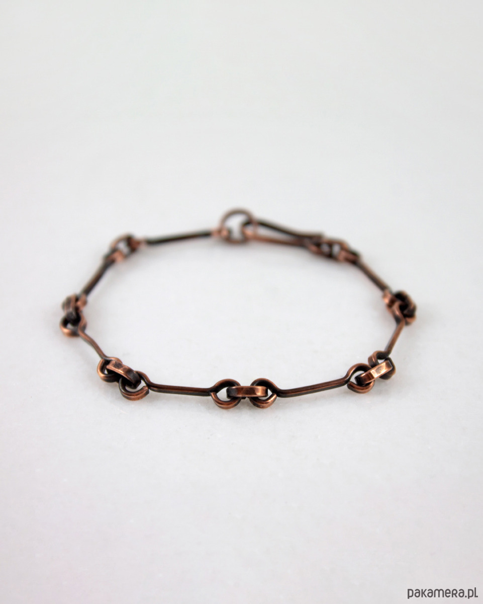 Bransoletka została wykonana w całości z grubego miedzianego drutu, odpornego na odkształcenia. Proste ale mocne zapięcie. Lekka nieregularność jest efektem zamierzonym. Faktura została podkreślona ciemną patyną uzyskaną w procesie oksydacji (bez użycia barwników).