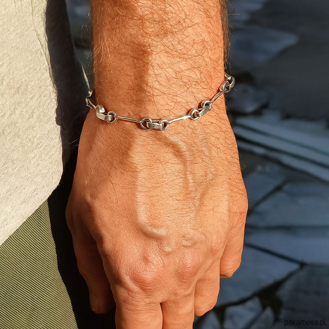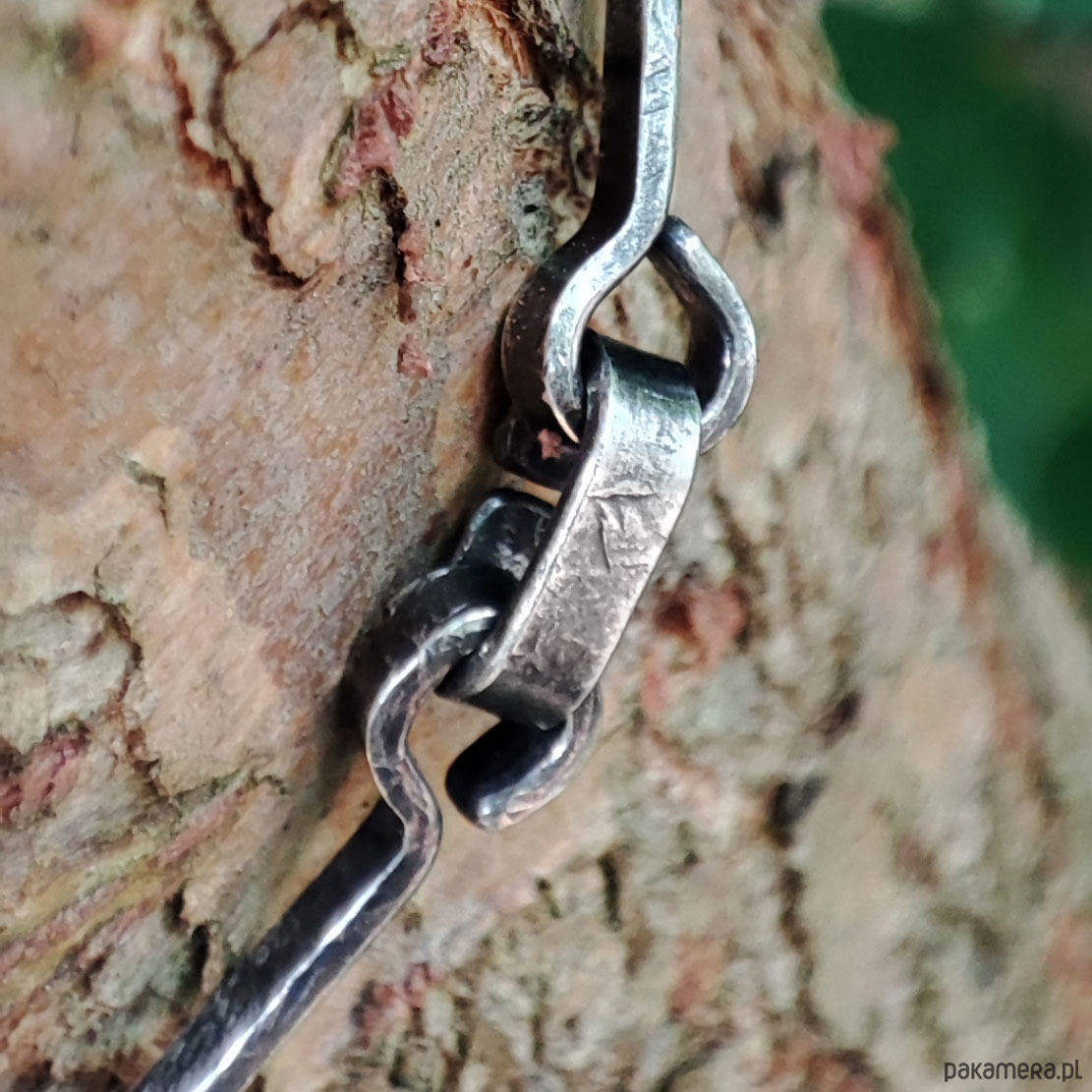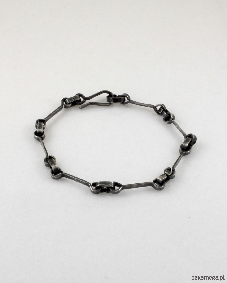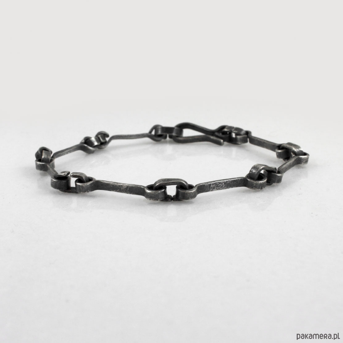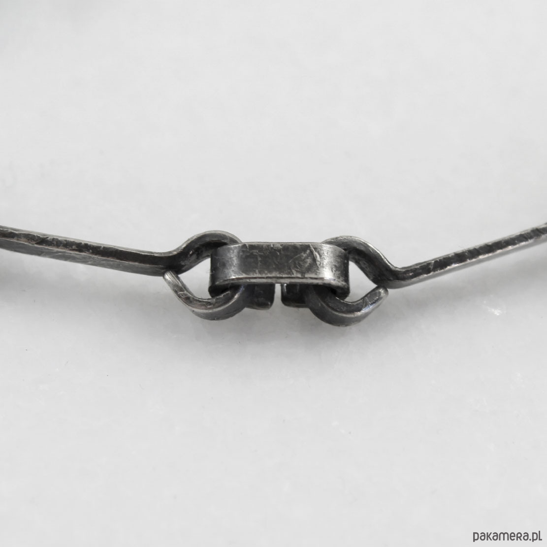 Bransoletka została wykonana w całości ze srebra próby 925, odpornego na odkształcenia. Proste mocne zapięcie. Lekka nieregularność jest efektem zamierzonym. Faktura została podkreślona ciemną patyną uzyskaną w procesie oksydacji (bez użycia barwników).