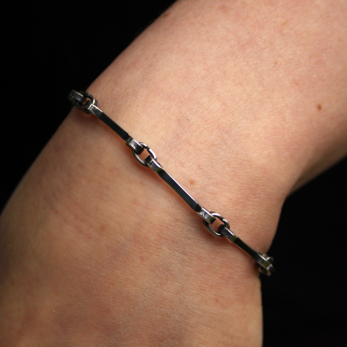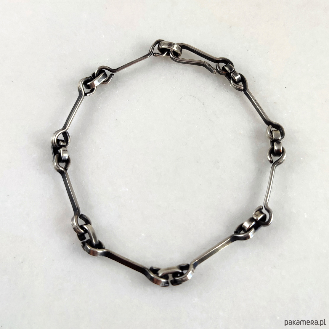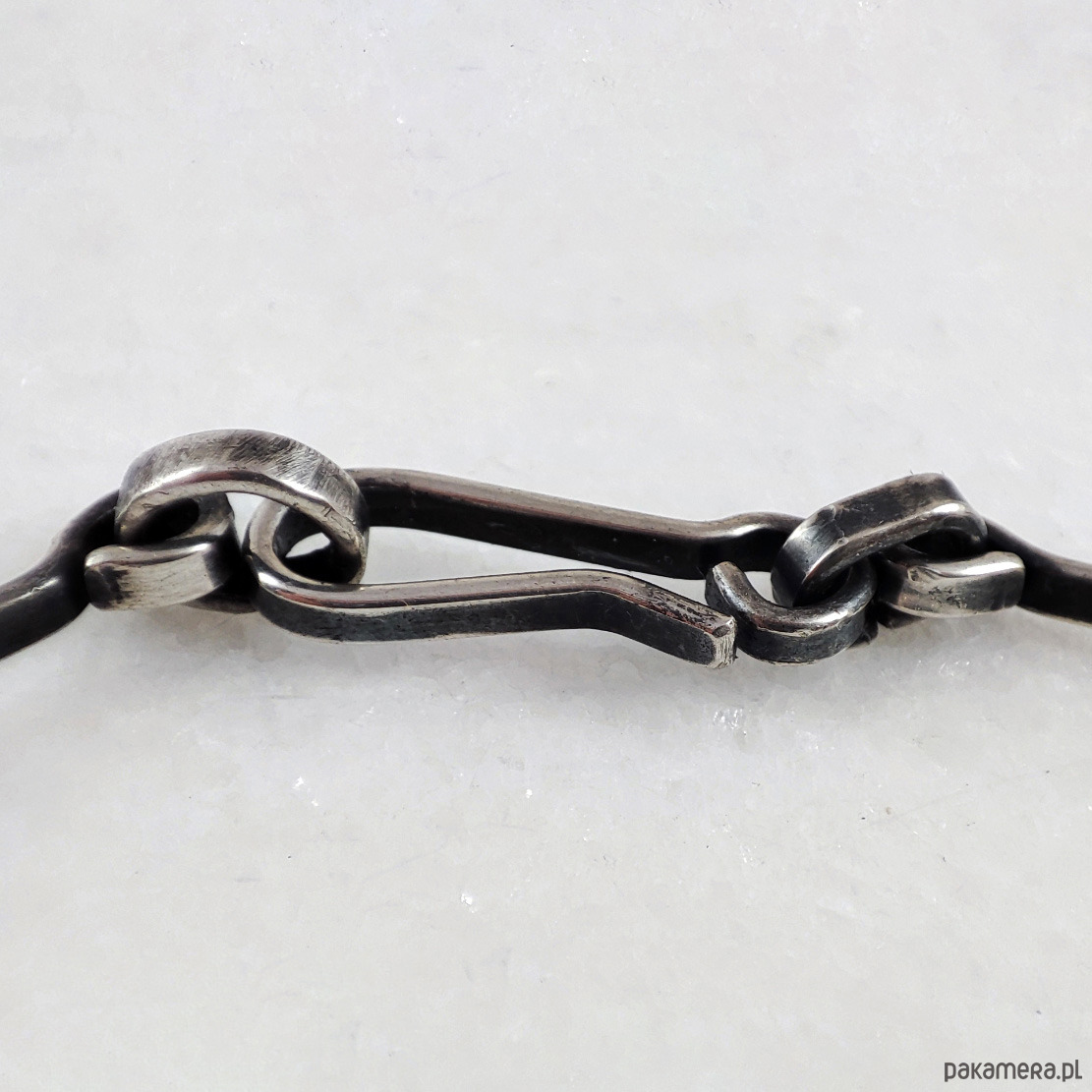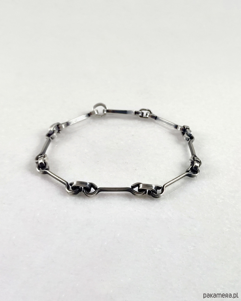 Bransoletka została wykonana w całości ze srebra próby 925, odpornego na odkształcenia. Proste mocne zapięcie. Lekka nieregularność jest efektem zamierzonym. Faktura została podkreślona ciemną patyną uzyskaną w procesie oksydacji (bez użycia barwników).