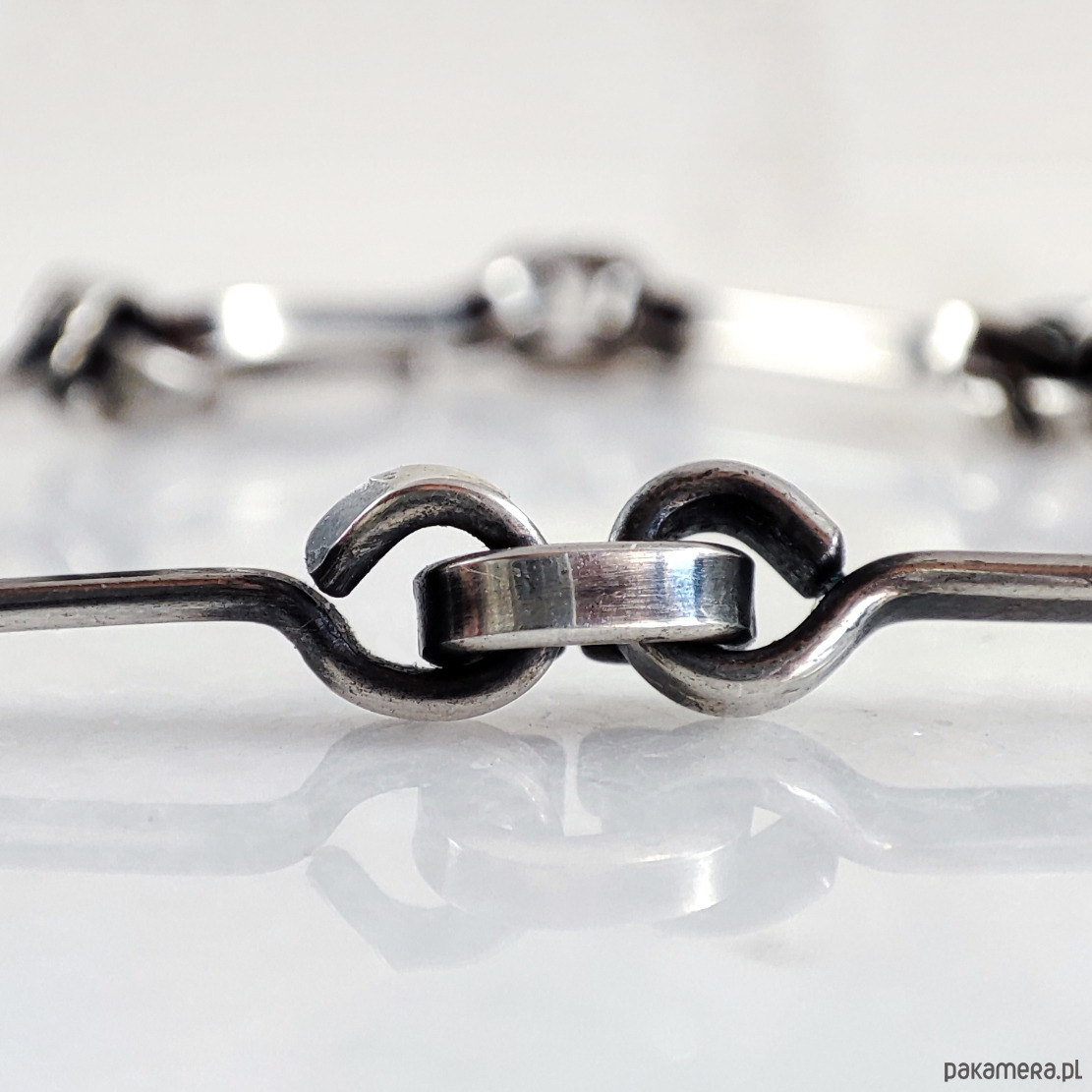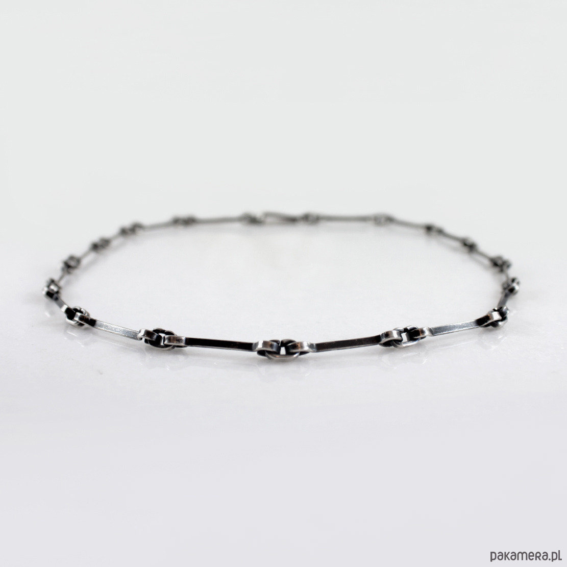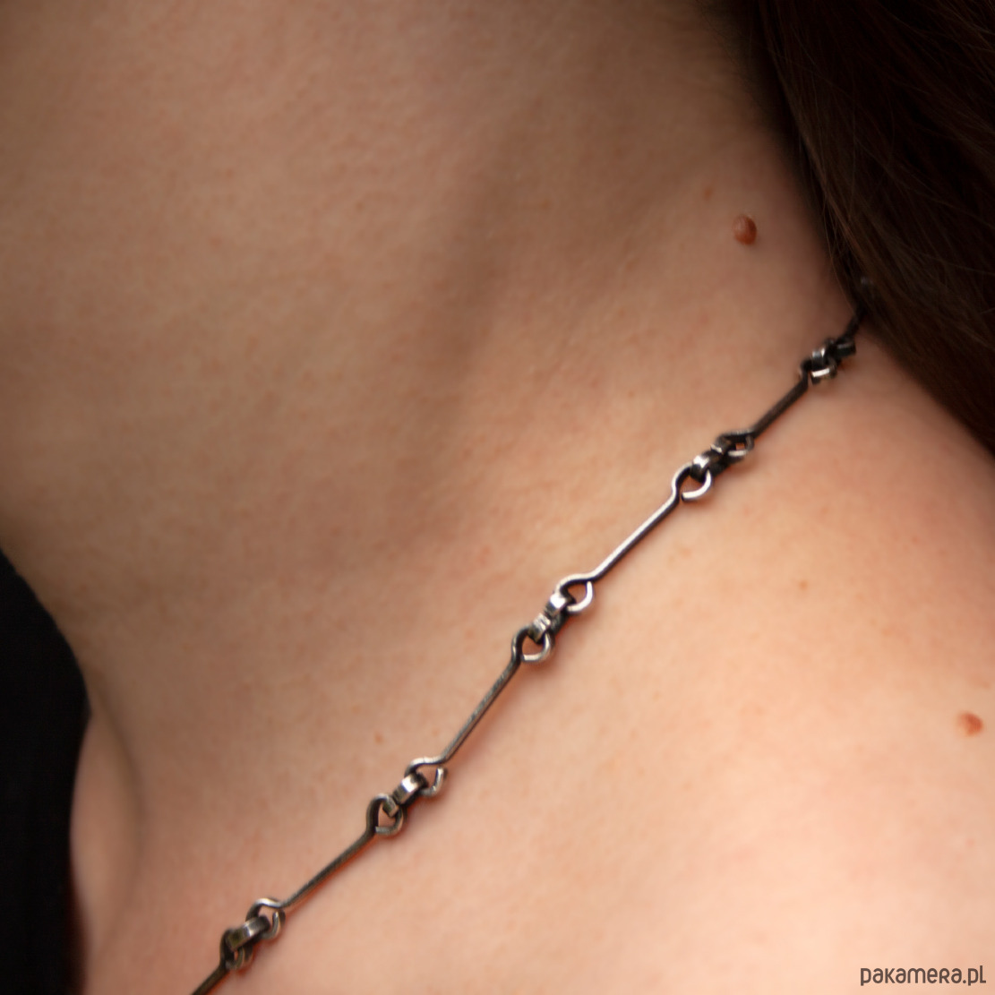 Naszyjnik został wykonany w całości ze srebra próby 925, odpornego na odkształcenia. Proste ale mocne zapięcie. Lekka nieregularność jest efektem zamierzonym. Faktura została podkreślona ciemną patyną uzyskaną w procesie oksydacji (bez użycia barwników). Długość to ok 46 cm. Jeśli potrzebujesz innego rozmiaru - proszę napisz.