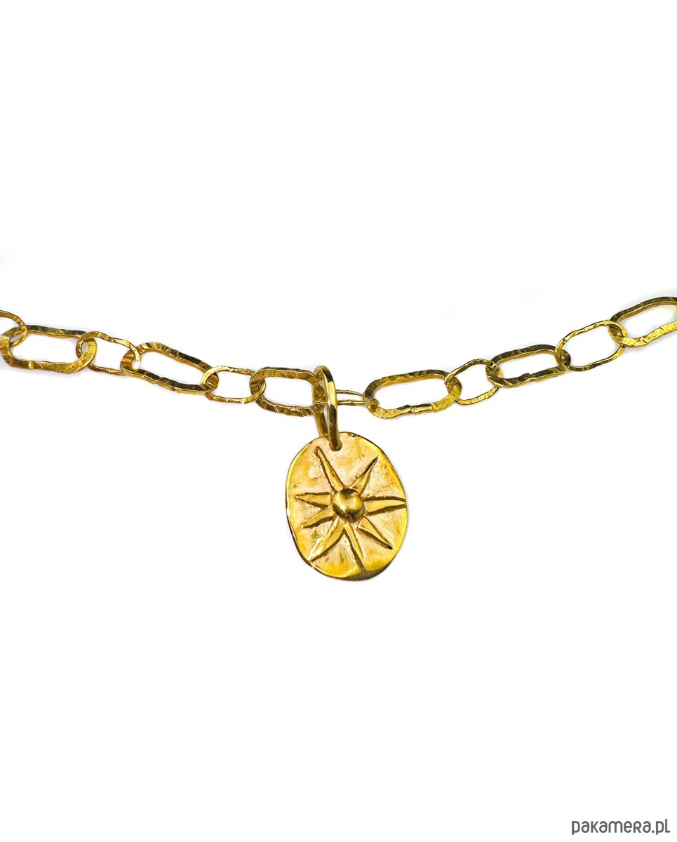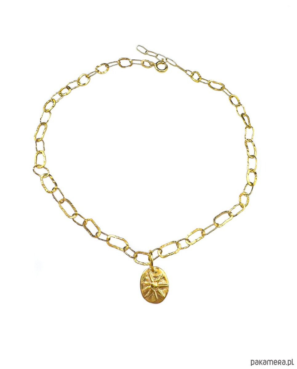 Naszyjnik, Łańcuch z nieregularnych zdobionych fakturą ogniw oraz owalną przywieszką - nieregularną blaszką z motywem słońca. Całość wykonana od podstaw ręcznie ze srebra 925. Złoty kolor jest wynikiem poddania go procesowi elektroforezy, który zapewnia jego trwałość i piękny wygląd przez długi czas.