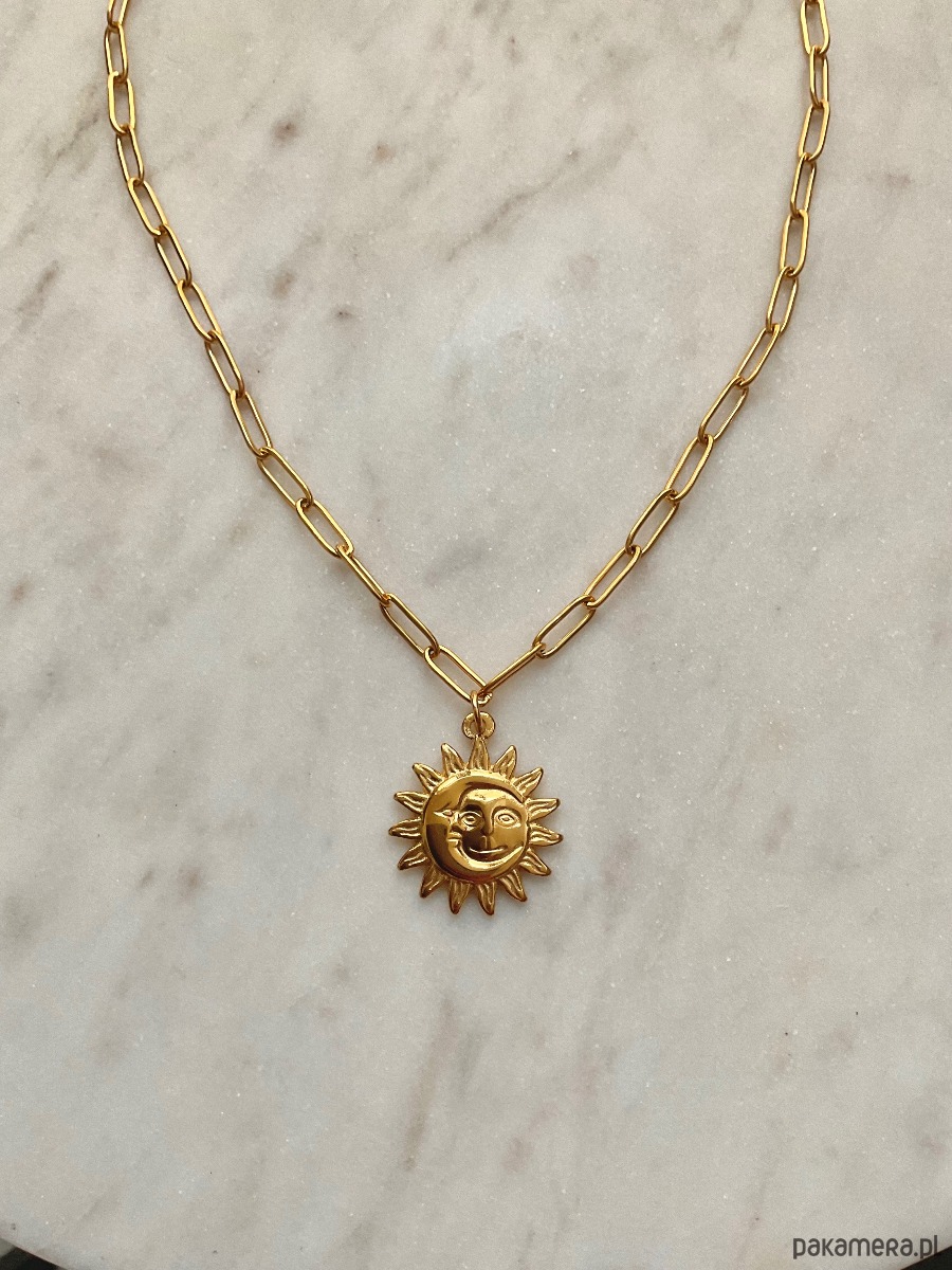 Naszyjnik w formie wyrazistego łańcucha typu spinacz. Duże oczka i duża zawieszka z motywem słońca i księżyca.