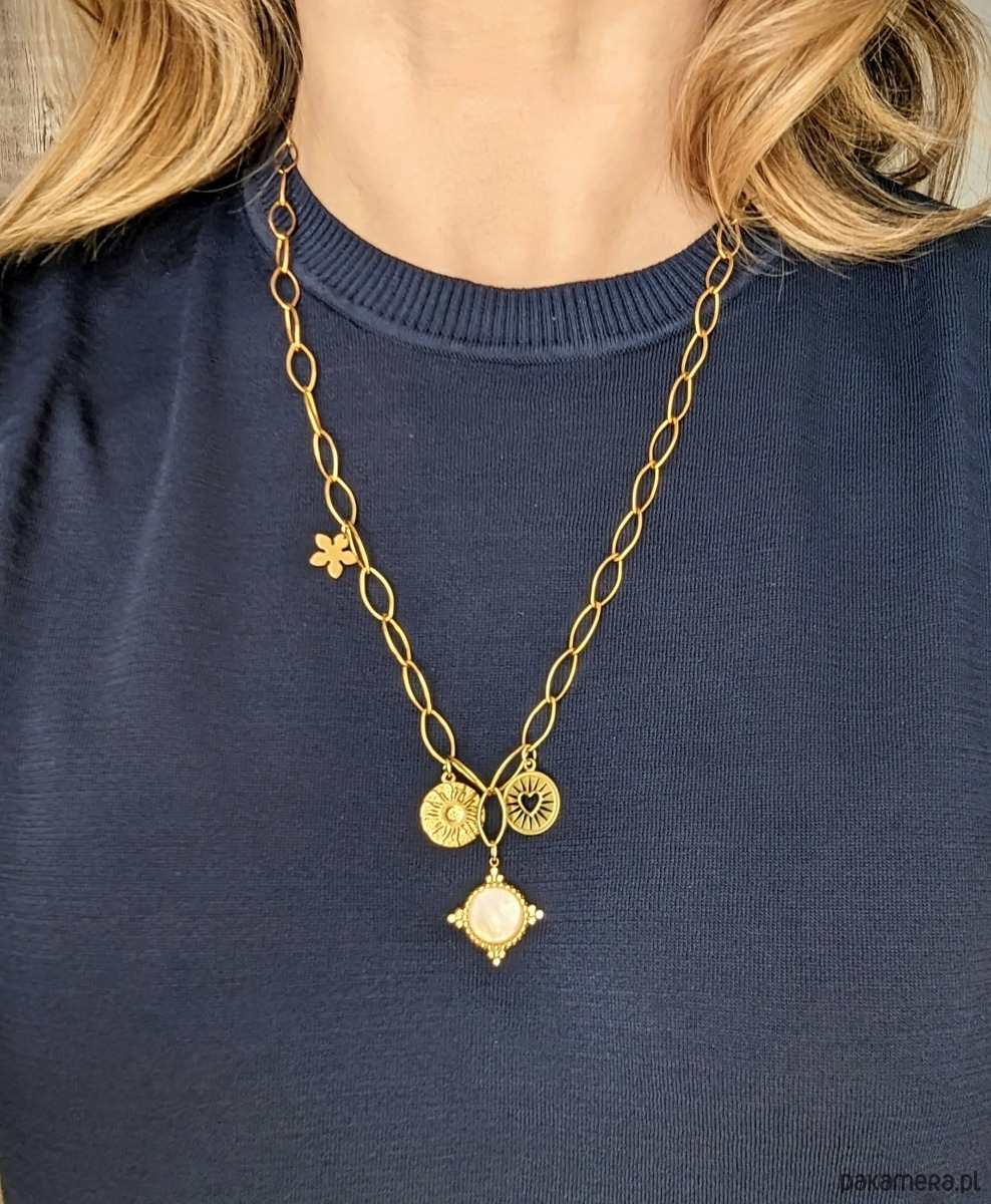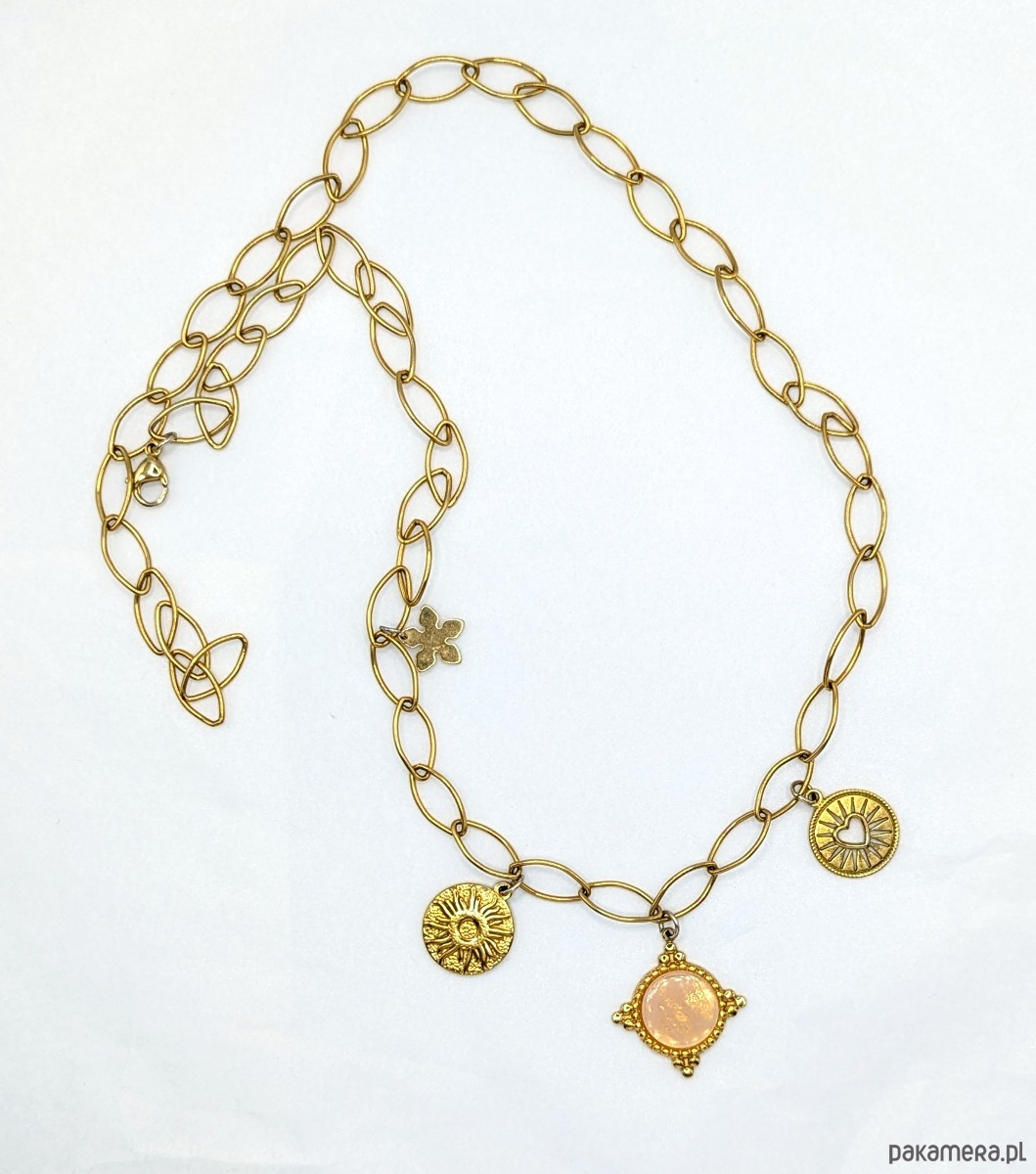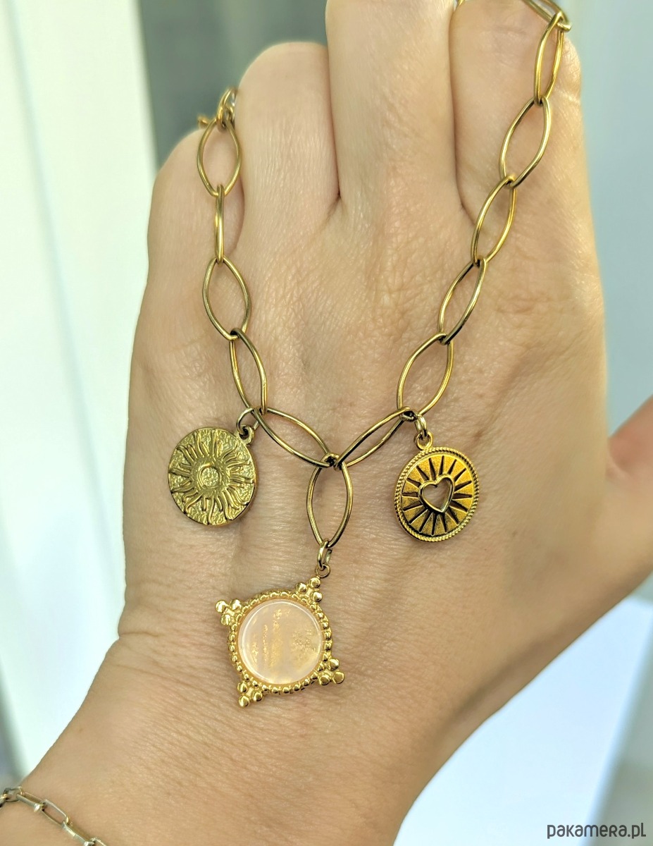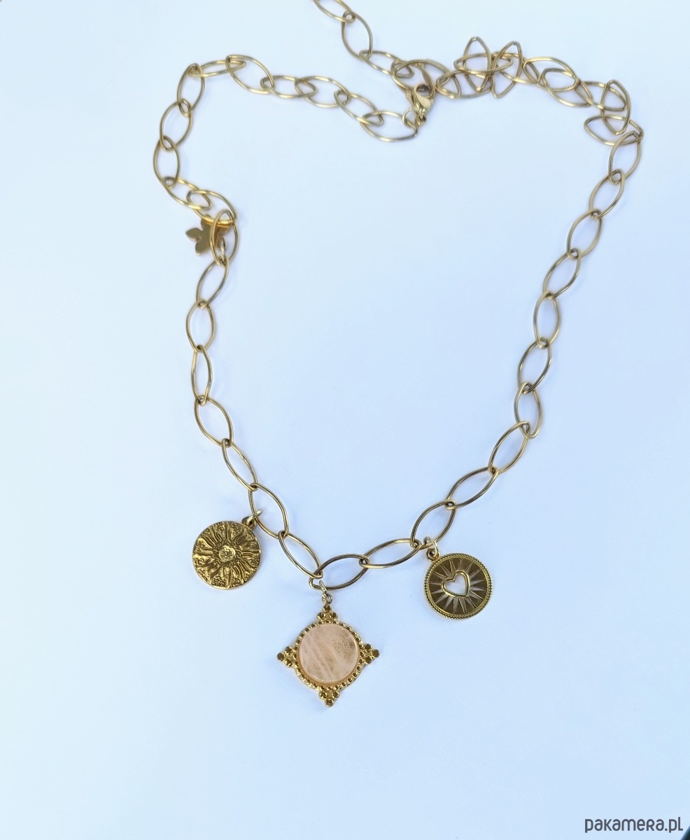 Naszyjnik na bazie łańcucha z efektownych, dużych ogniw w kształcie zbliżonym do elipsy. Ozdobiony trzema zawieszkami: medalikiem z kamieniem różowego kwarcu oraz dwoma monetami (słońce oraz wycięte serce). Z ozdobną blaszką w kształcie kwiatka. Naszyjnik jest wykonany w całości z galwanizowanej na złoto stali chirurgicznej, jest solidny. Dzięki możliwości regulacji na całej długości pozwala na tworzenie różnych aranżacji.