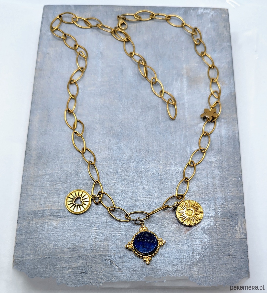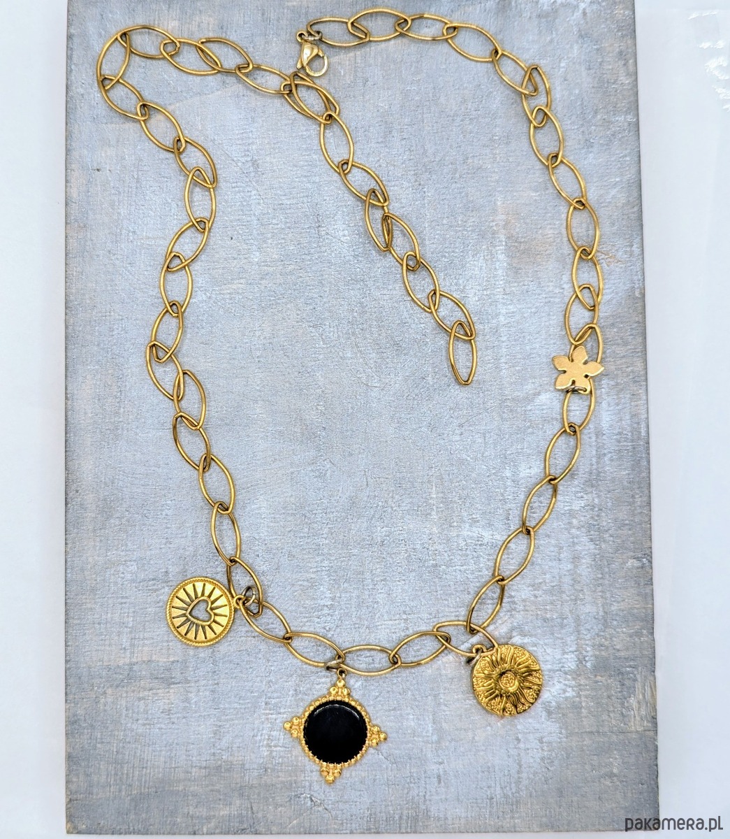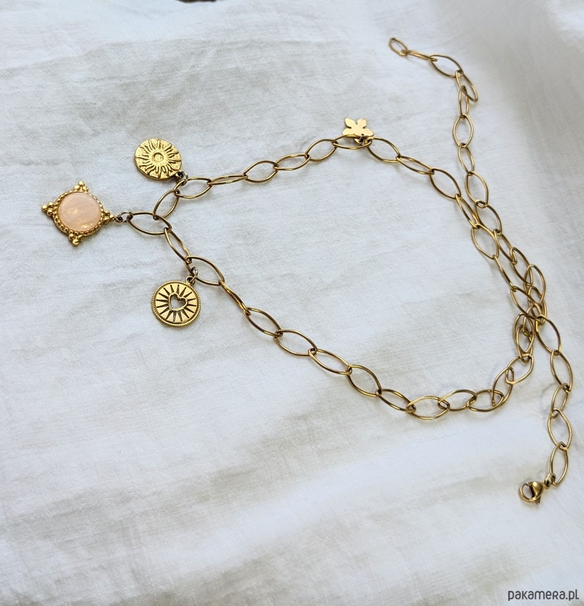 Naszyjnik na bazie łańcucha z efektownych, dużych ogniw w kształcie zbliżonym do elipsy. Ozdobiony trzema zawieszkami: medalikiem z kamieniem różowego kwarcu oraz dwoma monetami (słońce oraz wycięte serce). Z ozdobną blaszką w kształcie kwiatka. Naszyjnik jest wykonany w całości z galwanizowanej na złoto stali chirurgicznej, jest solidny. Dzięki możliwości regulacji na całej długości pozwala na tworzenie różnych aranżacji.