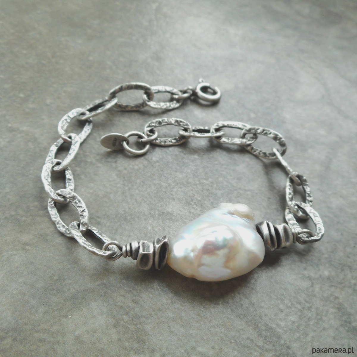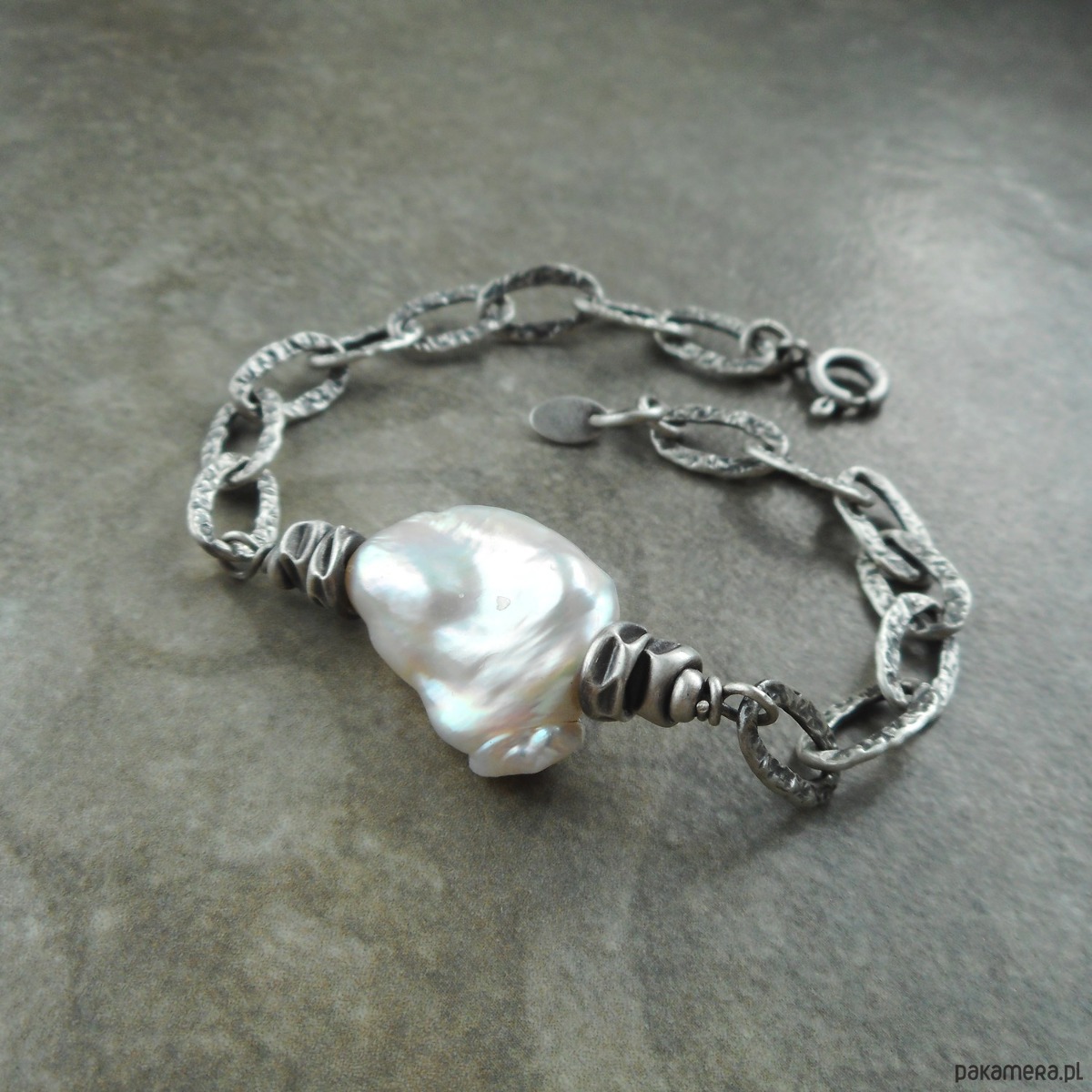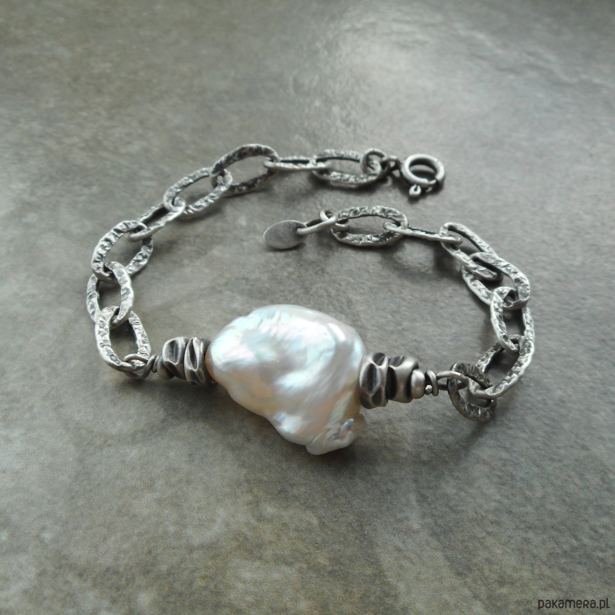Oryginalna, jedyna bransoletka z kamieni naturalnych i szlachetnego srebra; charakteru biżuterii nadaje połączenie nieregularnej, dużej perły hodowlanej z fakturowanym, solidnym łańcuchem o dużych oczkach ( 12 mm).