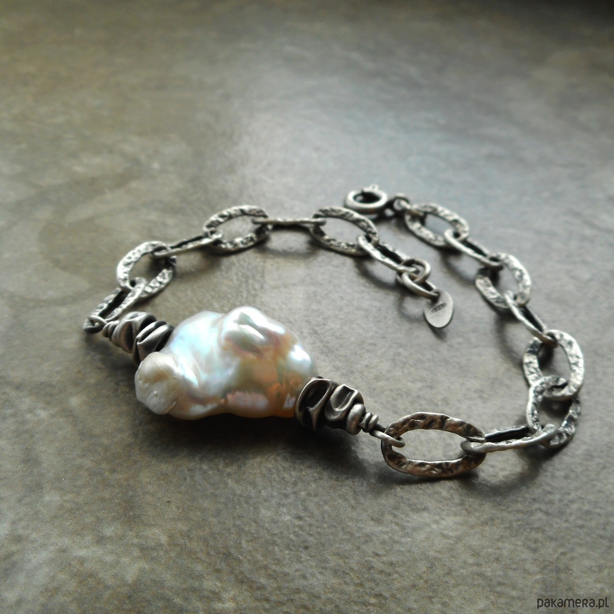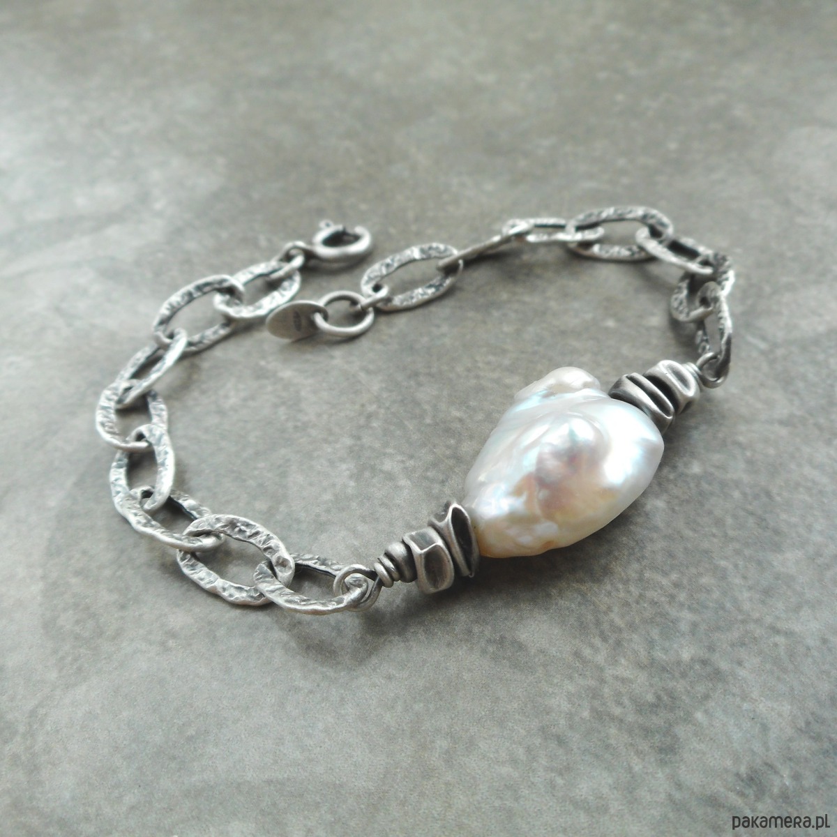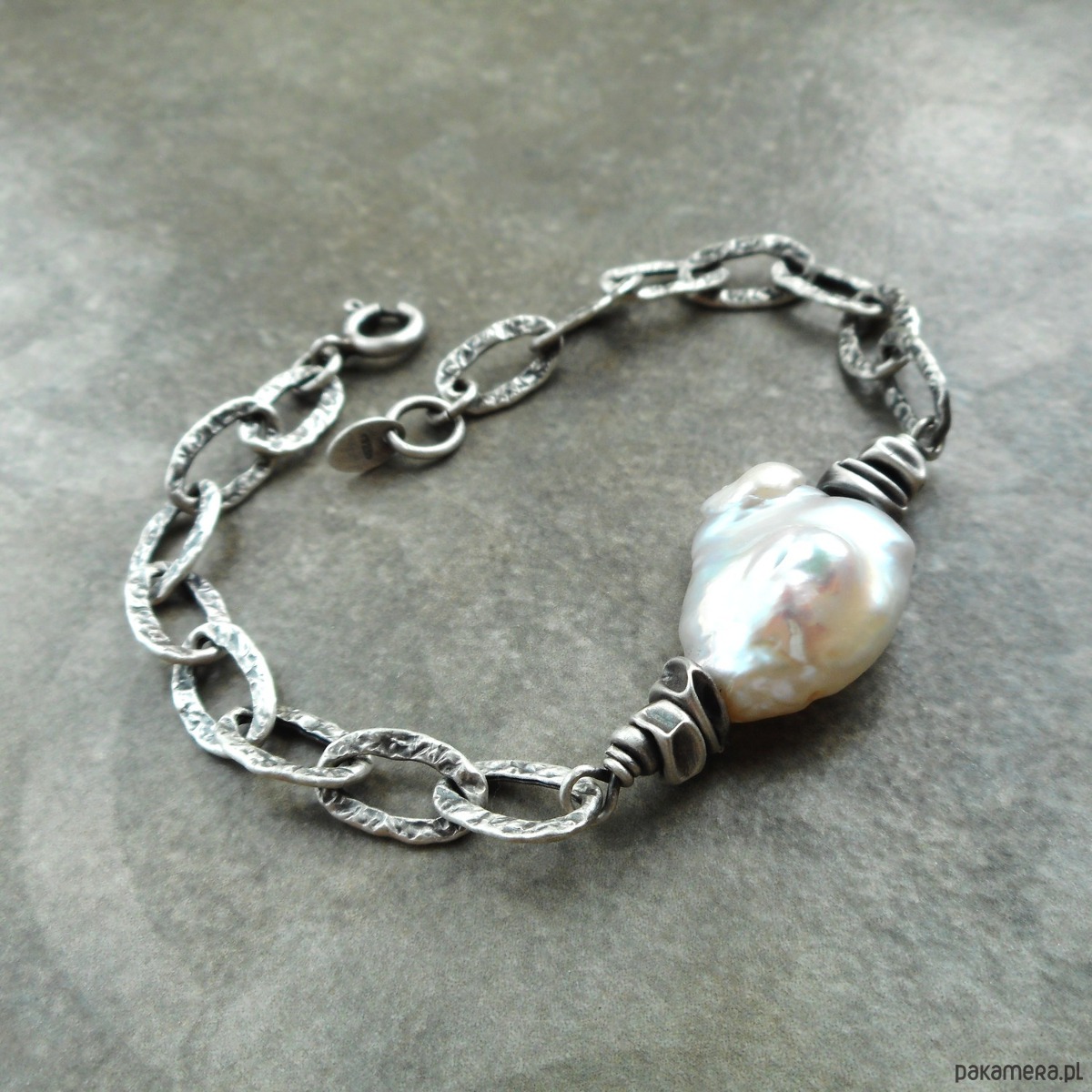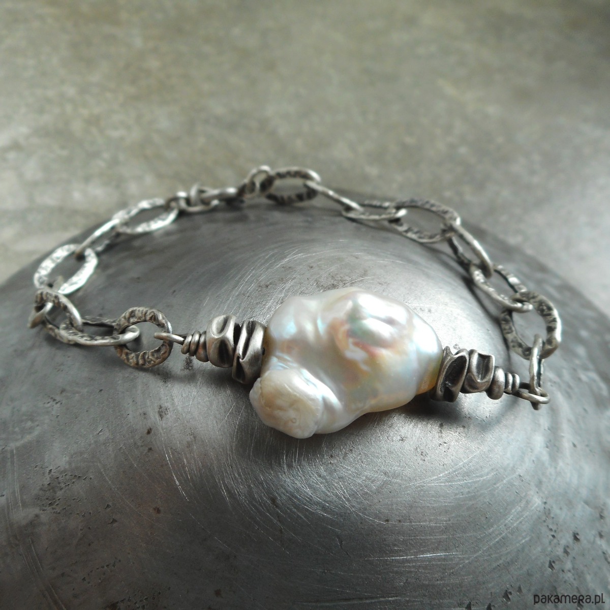 Oryginalna, jedyna bransoletka z kamieni naturalnych i szlachetnego srebra; charakteru biżuterii nadaje połączenie nieregularnej, dużej perły hodowlanej z fakturowanym, solidnym łańcuchem o dużych oczkach ( 12 mm).