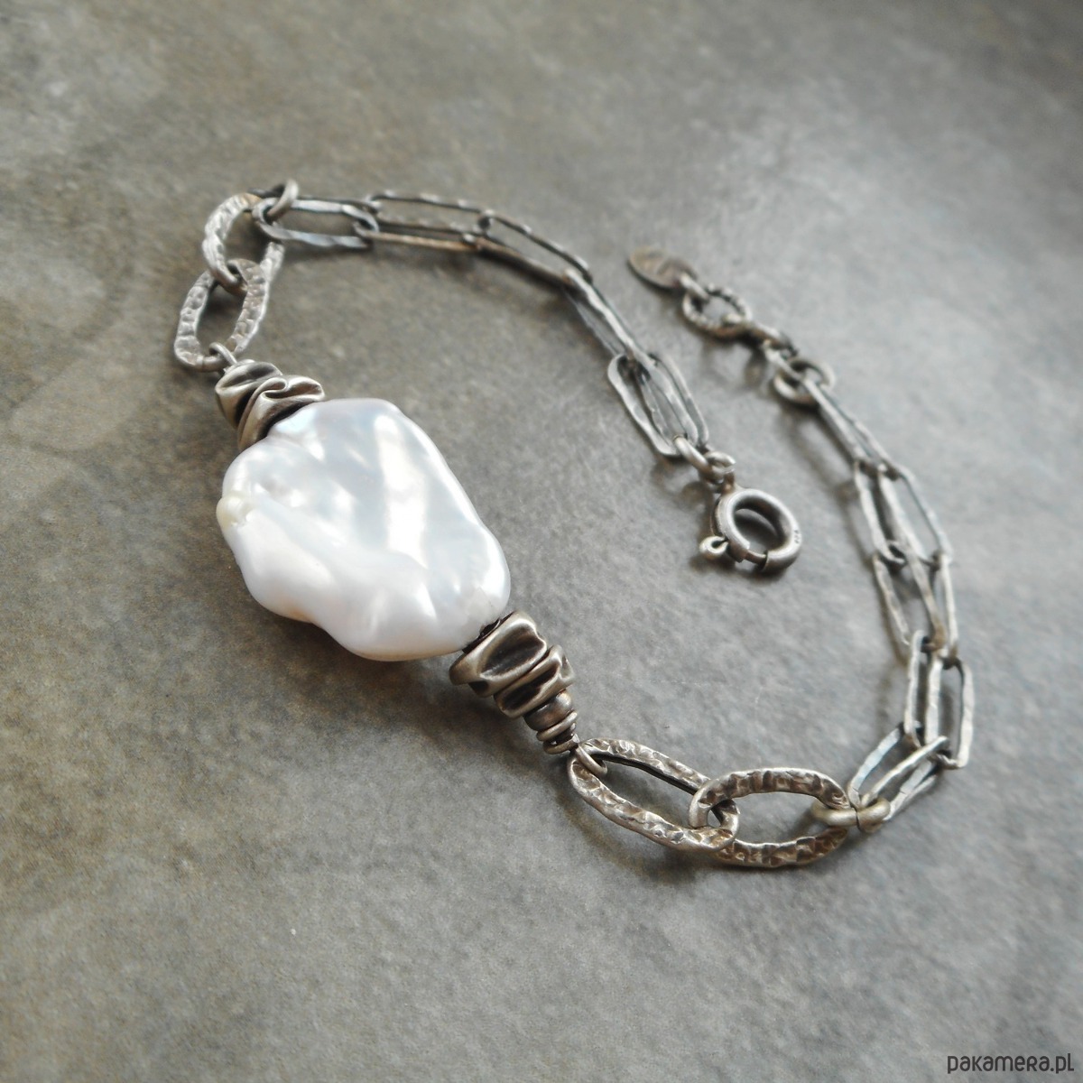 Stylowa bransoletka z kamieni naturalnych i szlachetnego srebra; charakteru biżuterii nadaje połączenie nieregularnej, dużej perły hodowlanej z fakturowanym, solidnym łańcuchem o dużych oczkach ( 12 mm) z oksydowanego srebra.
