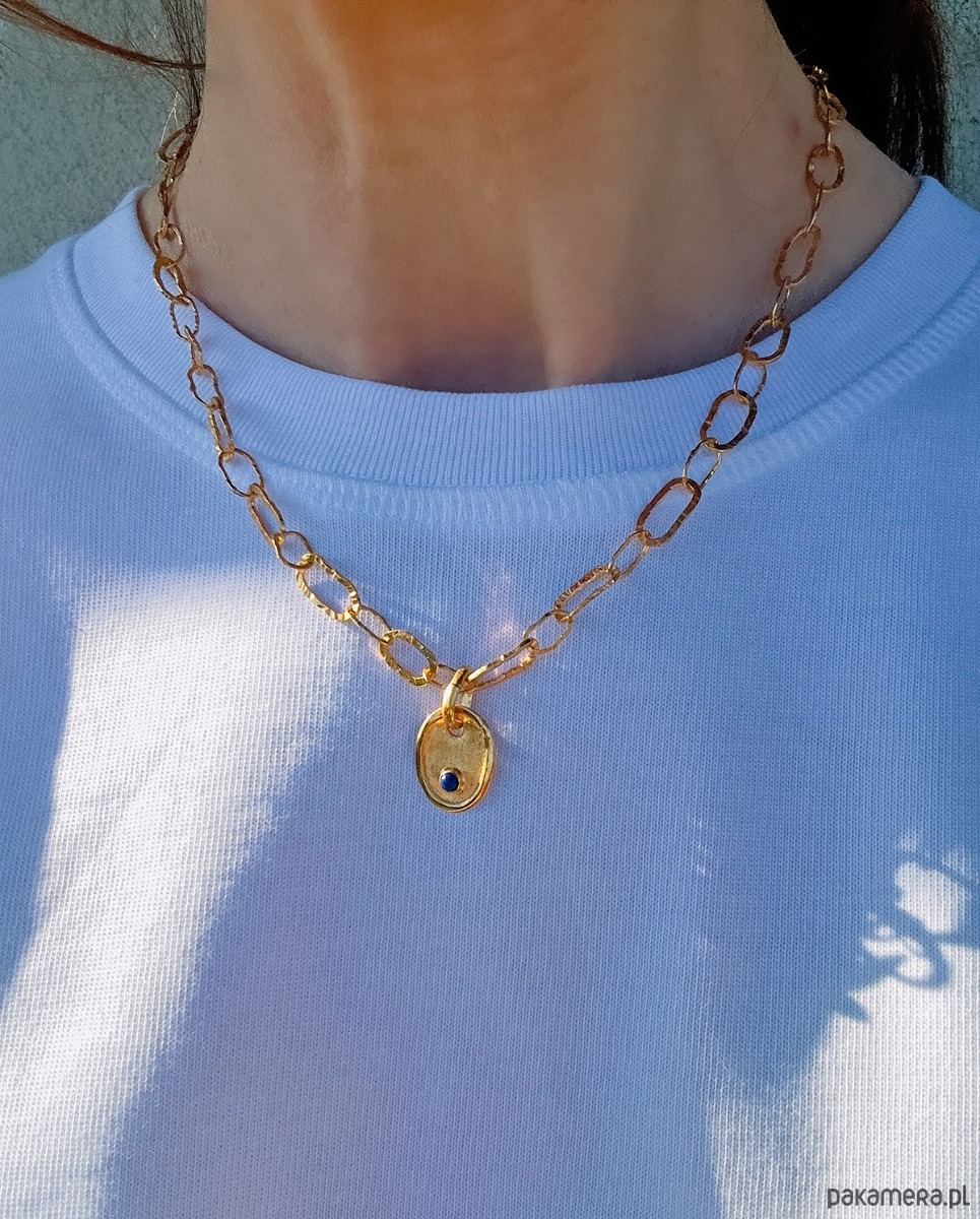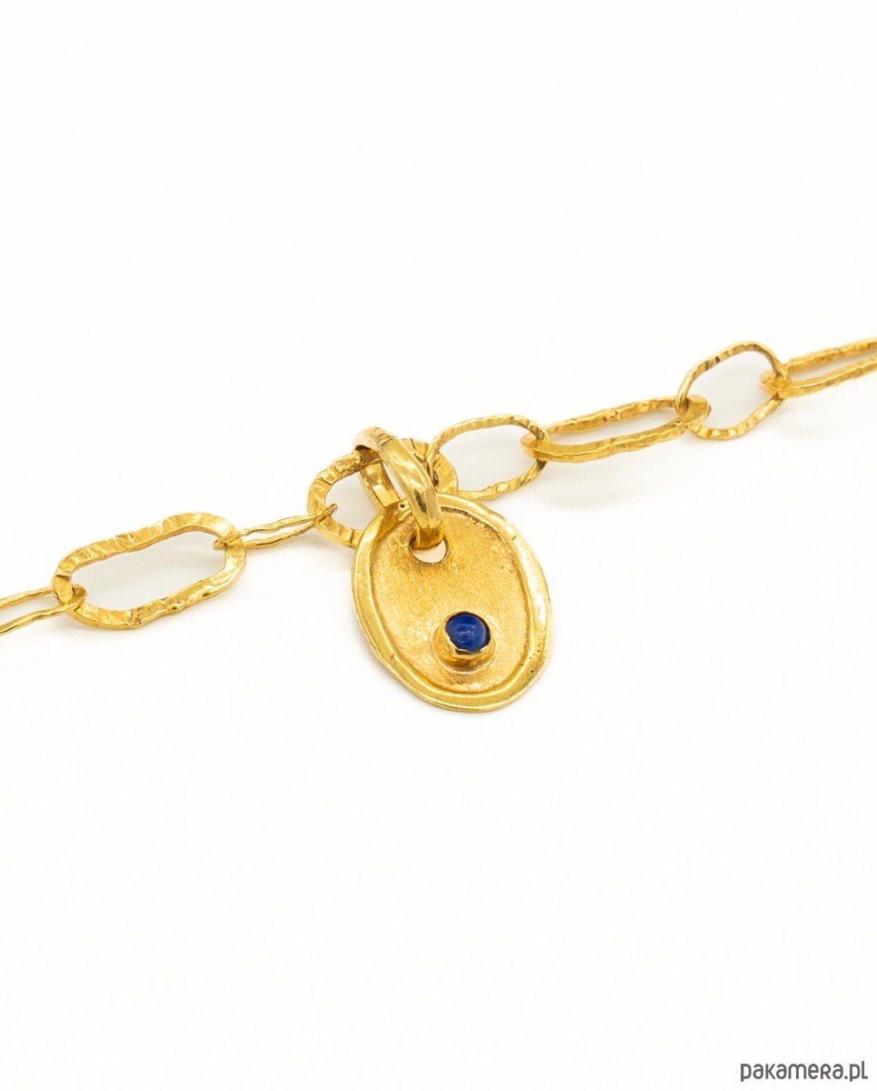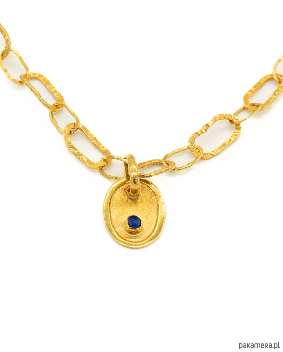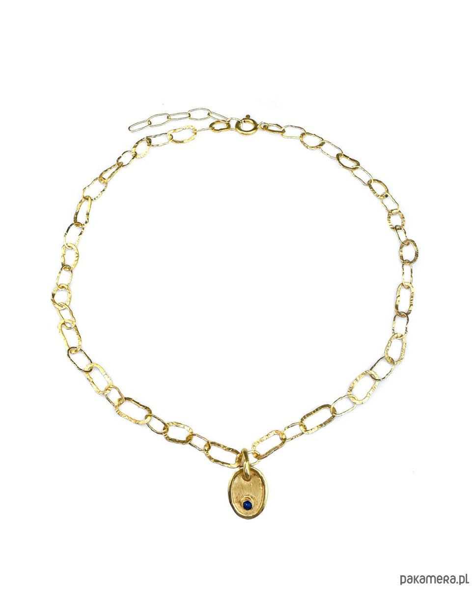 Łańcuszek z nieregularnych, zdobionych fakturą ogniw oraz owalną, satynowaną wewnątrz zawieszką z oprawionym na niej naturalnym lapisem lazuli.