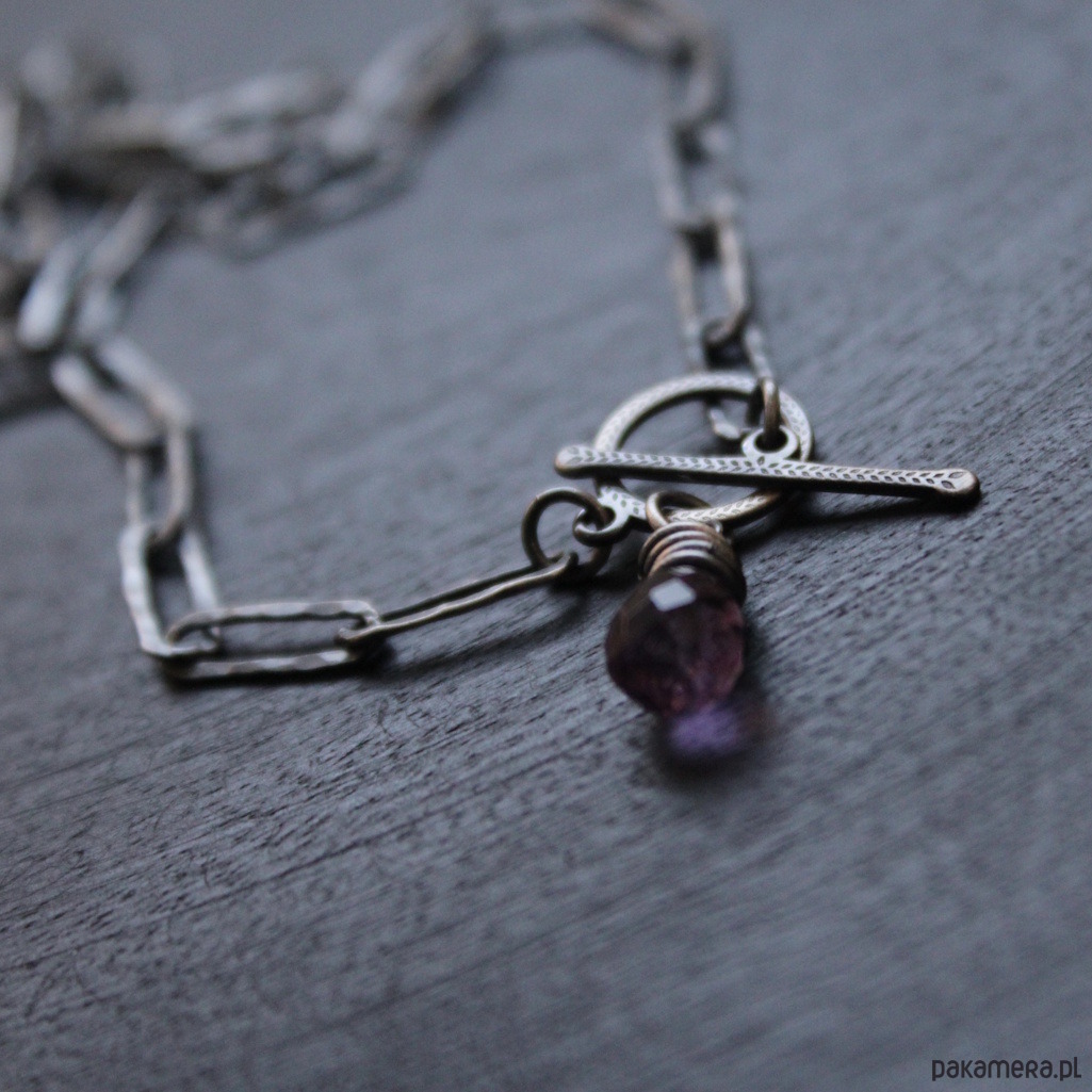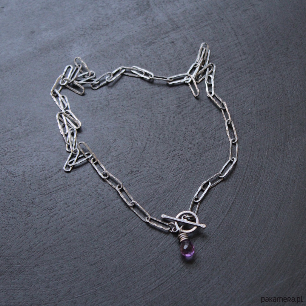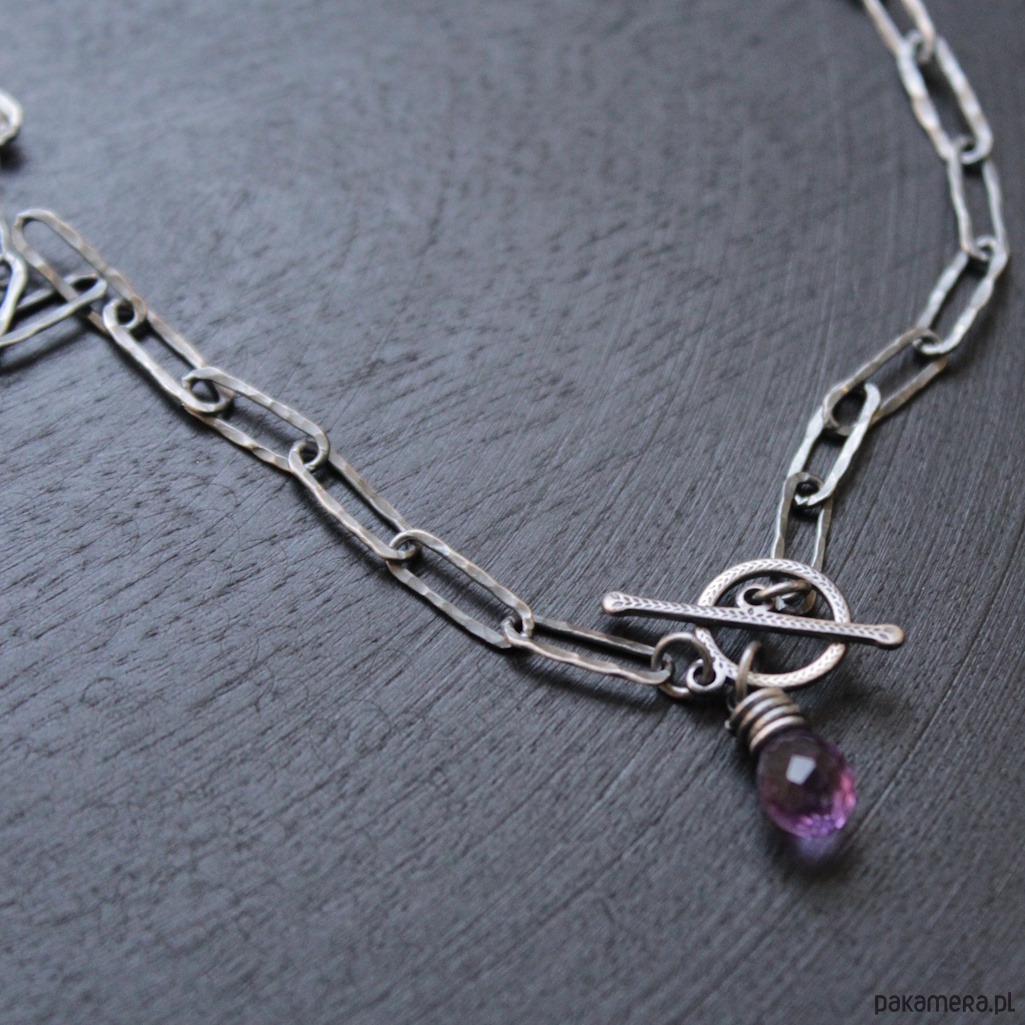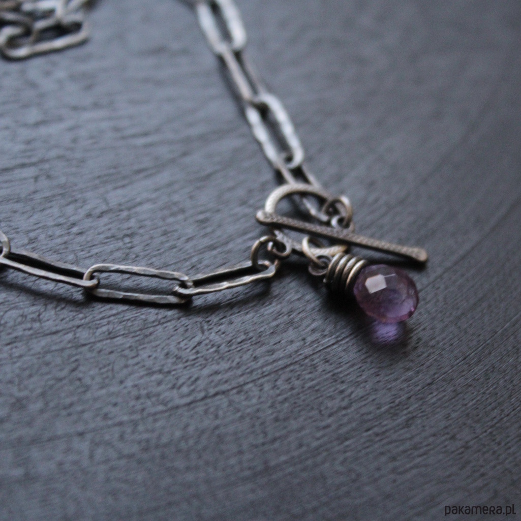 Naszyjnik zapina się z przodu i zakończony jest ozdobnym zapięciem i ozdobiony został fasetowaną kroplą ametystu wielkości 0,7 cm.