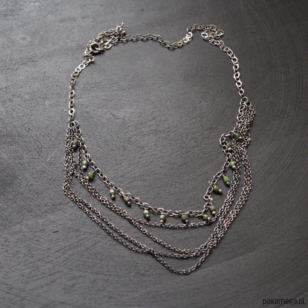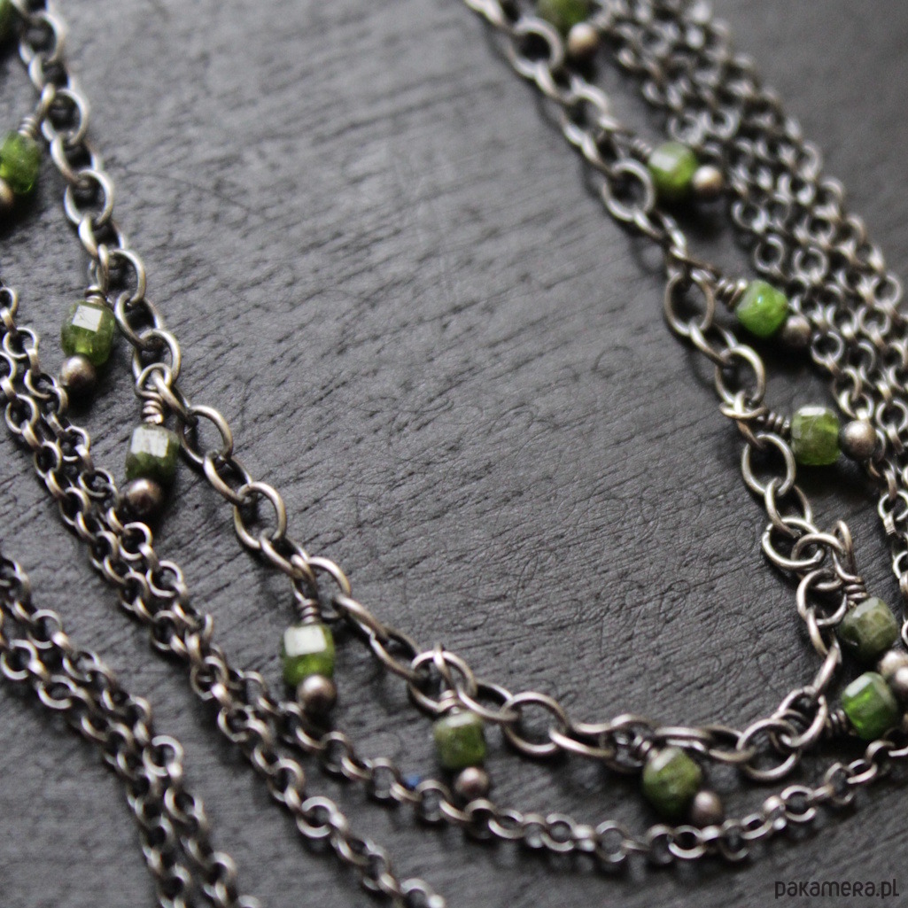 Na łańcuszku zawieszone zostały piękne kosteczki diopsydu wielkości 0,25 cm.