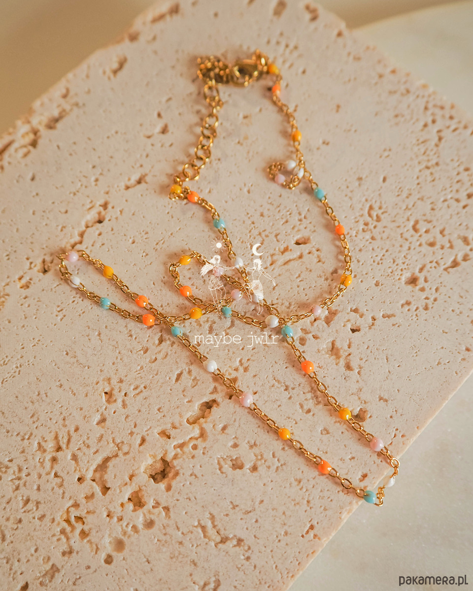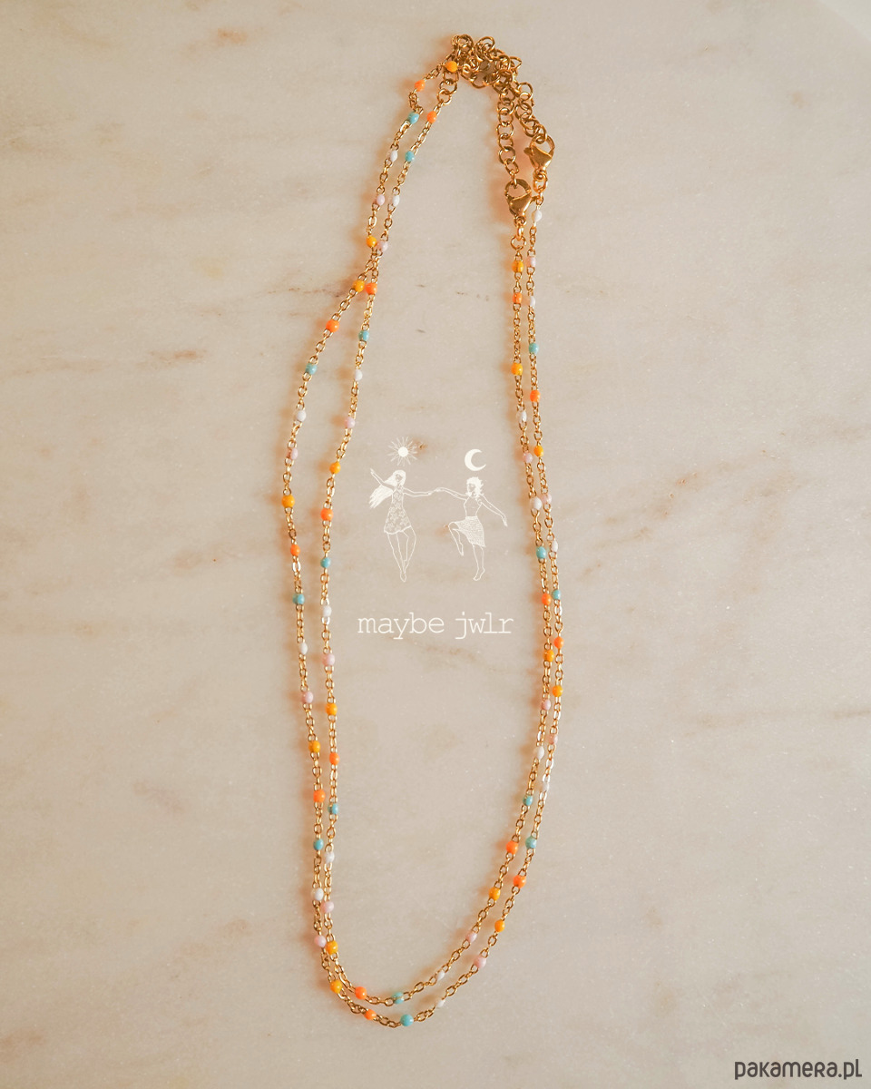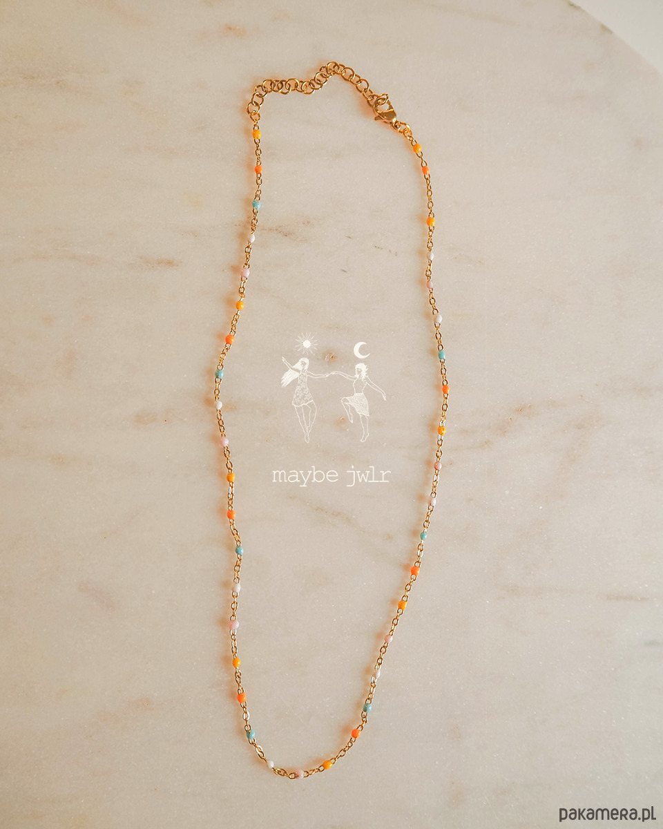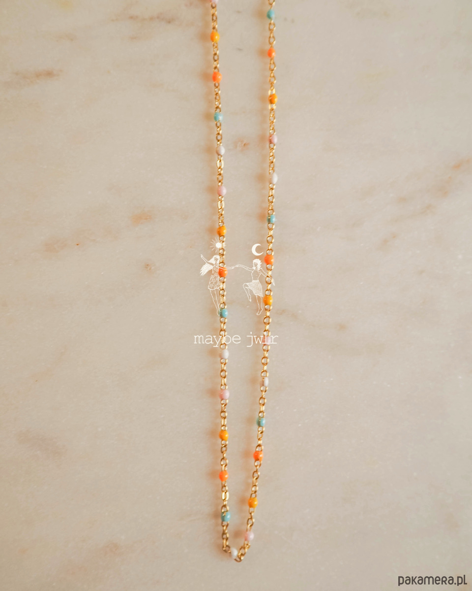 Elegancki i stonowany naszyjnik z drobnymi kuleczkami z emalii w pastelowych kolorach.