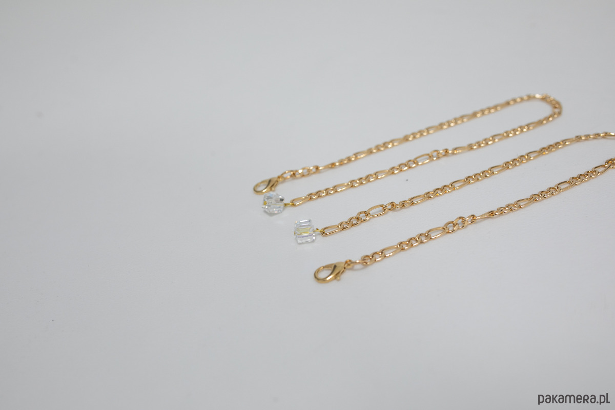 Łańcuszki zakończone z jednej strony połyskującym kryształkiem , a z drugiej karabińczykiem.