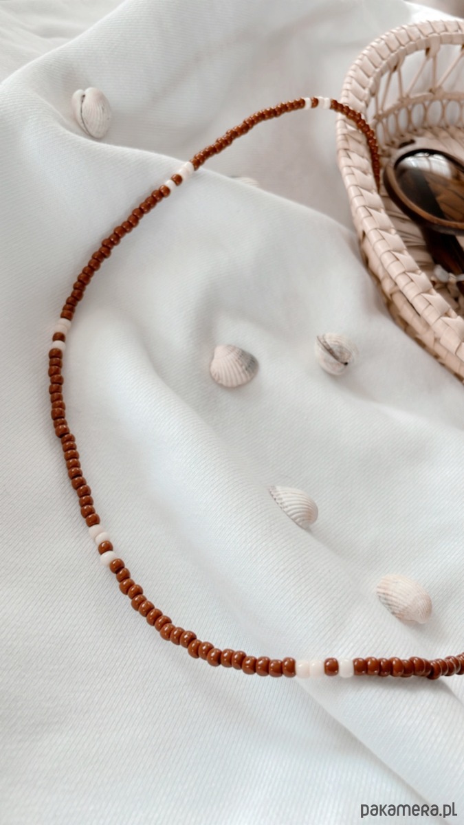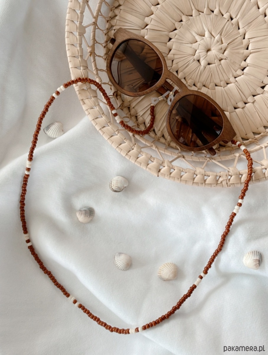 Łańcuszek do okularów wykonany własnoręcznie ze szklanych koralików i żyłki jubilerskiej. Zaciski srebrne AG925 pozłacane.