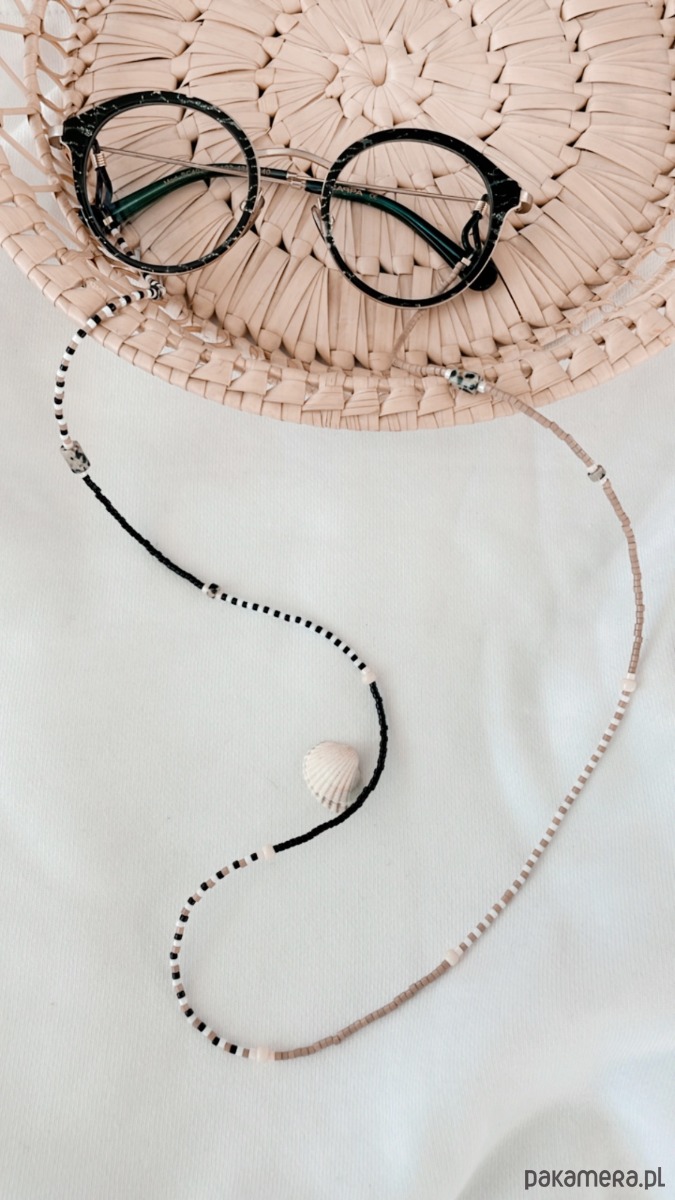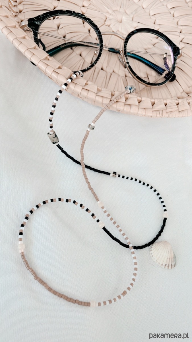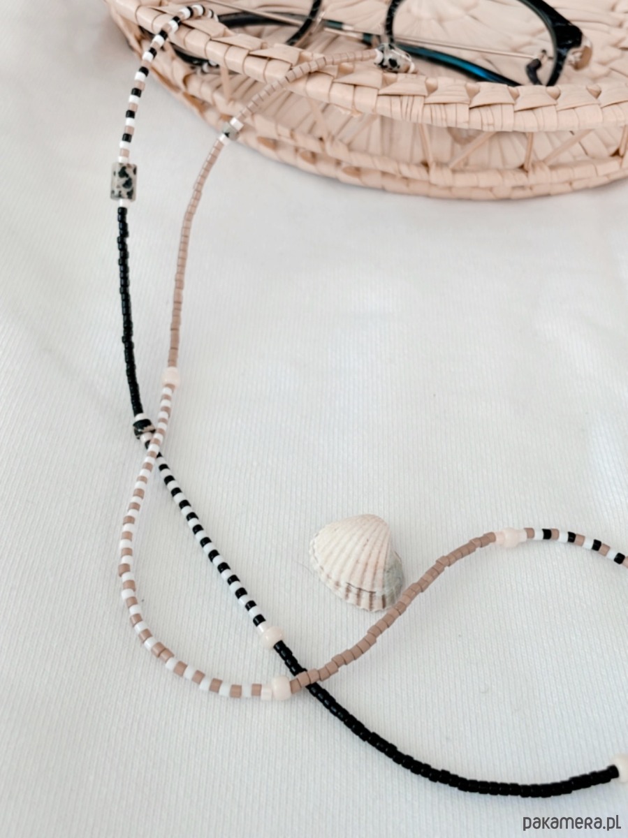 Łańcuszek do okularów wykonany własnoręcznie ze szklanych koralików, jaspisu dalmatyńskiego i żyłki jubilerskiej. Zaciski srebrne AG925 pozłacane.