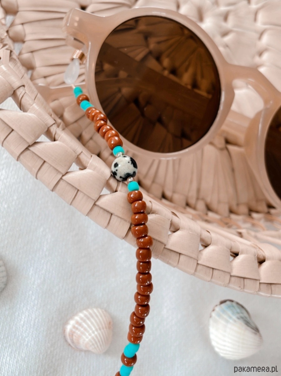 Łańcuszek do okularów wykonany własnoręcznie ze szklanych koralików, jaspisu dalmatyńskiego i żyłki jubilerskiej. Zaciski srebrne AG925 pozłacane.