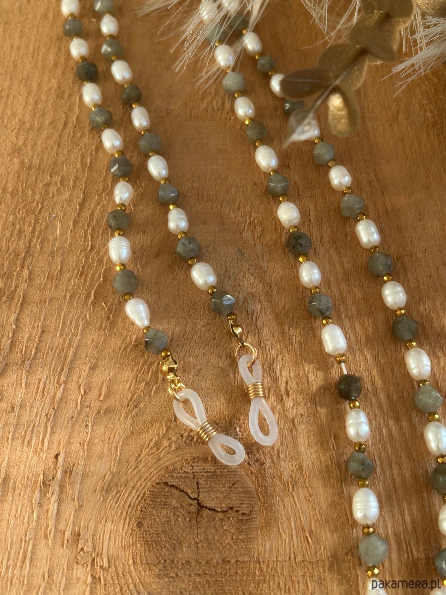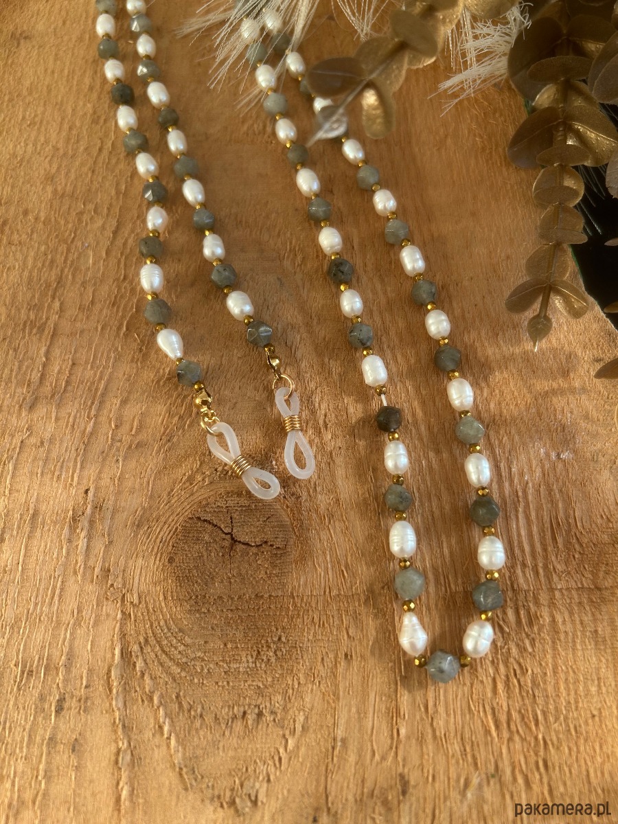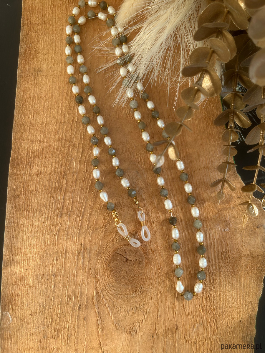 Łańcuszek do okularów z kamieni: Agat mszysty, hematyt i perłami hodowlanymi .