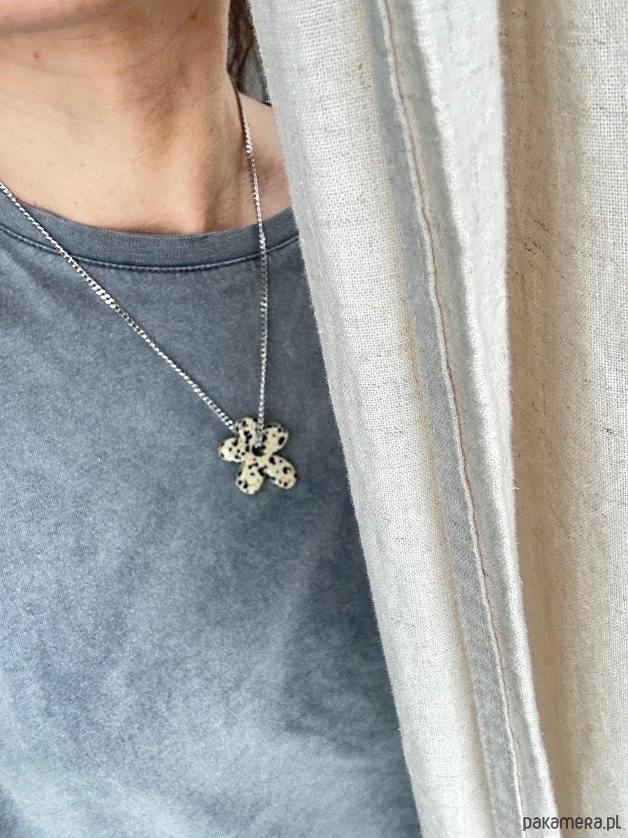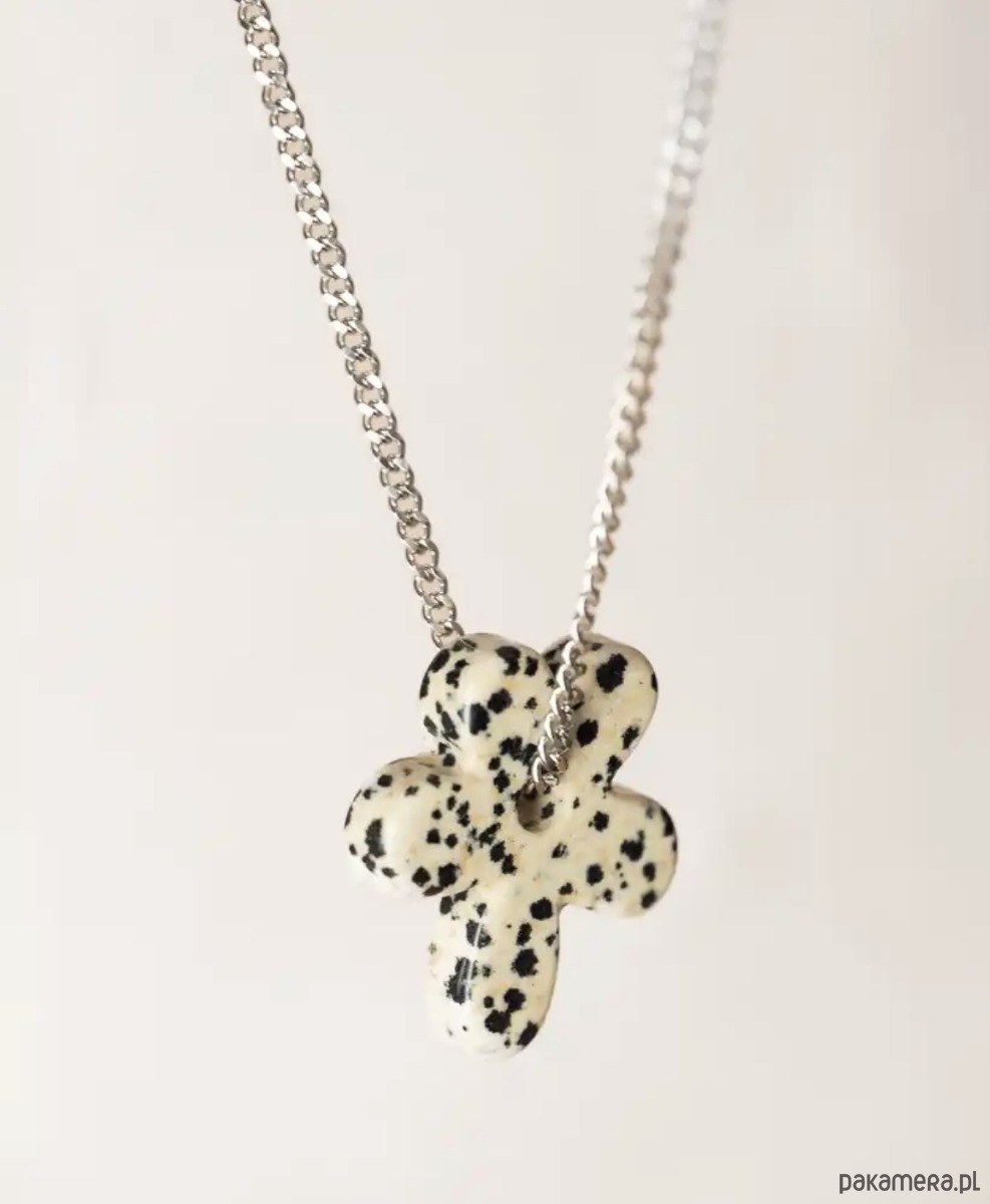 Piekny łańcuch stalowy z zawieszką z dużego kwiata wykonanego z kamienia jaspisu dalmatyńskiego. Kwiat to około 3,5 / 3 cm . Długość 45 cm