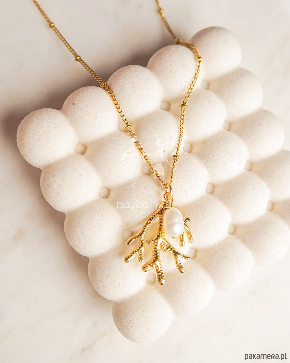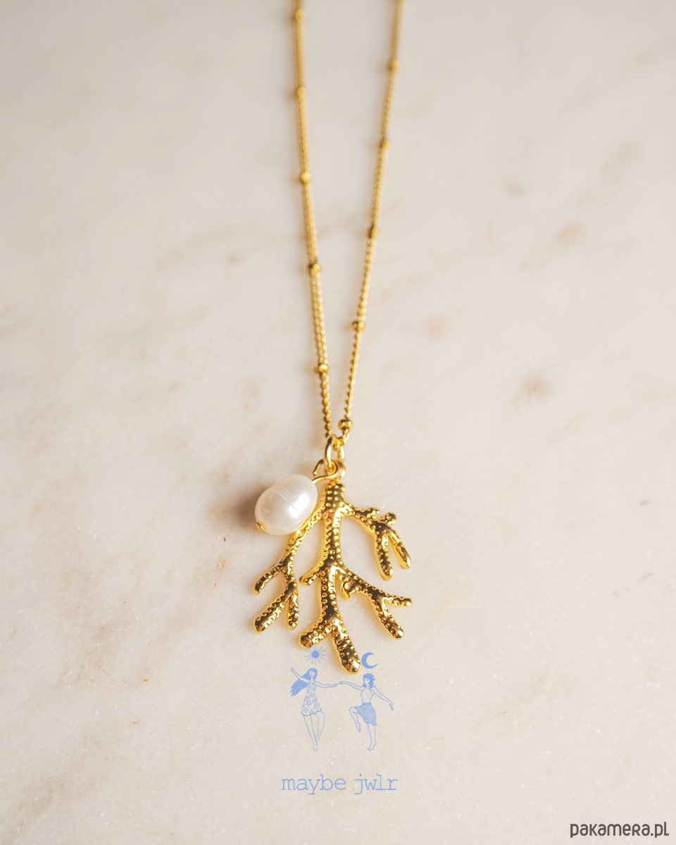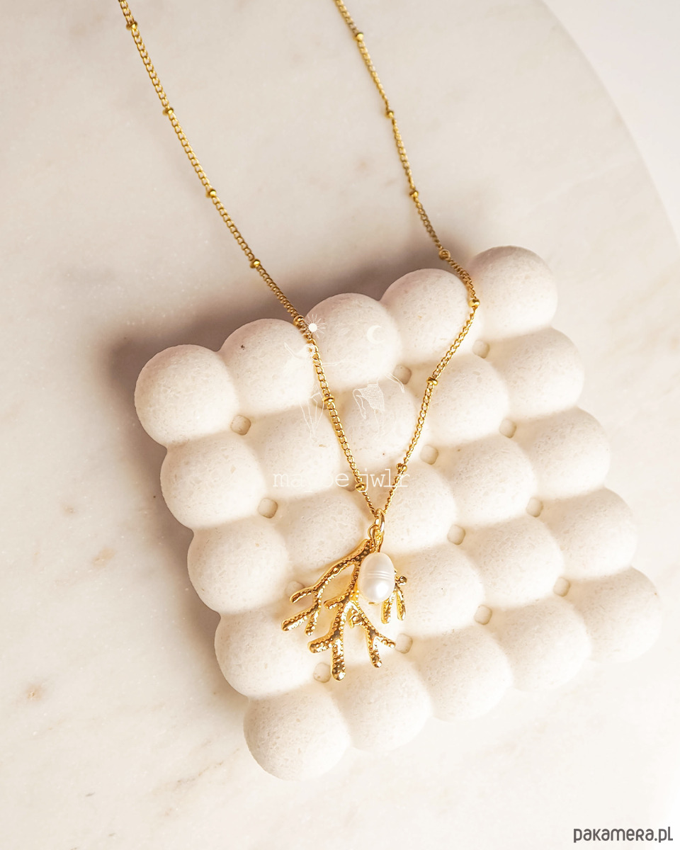 Elegancki i stonowany naszyjnik z zawieszką złoty koralowiec z perłą.