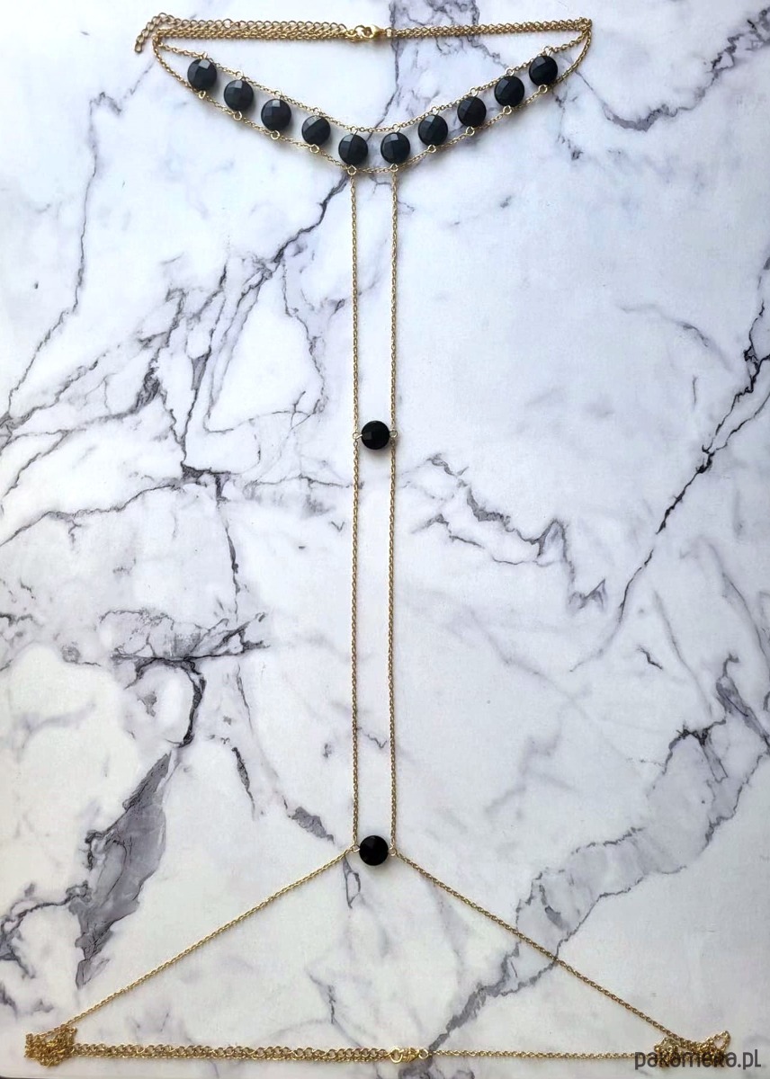 Łańcuszek na ciało wykonany z 12 czarnych kamienie onyksu w kształcie pastylek oraz elementów ze stali szlachetnej pozłacanej. Łańcuszek zapinany jest na karabińczyki, z możliwością regulacji długości łańcuszka, dzięki dodatkowym przedłużkom na szyi (+5 cm) oraz w talii (+10 cm). Naszyjnik pięknie oplata szyję i podkreśla dekolt. Całość prezentuje się wyraziście, dzięki dużej ilości kamieni oraz nietypowemu wzornictwu, który jest idealnym uzupełnieniem stylizacji.