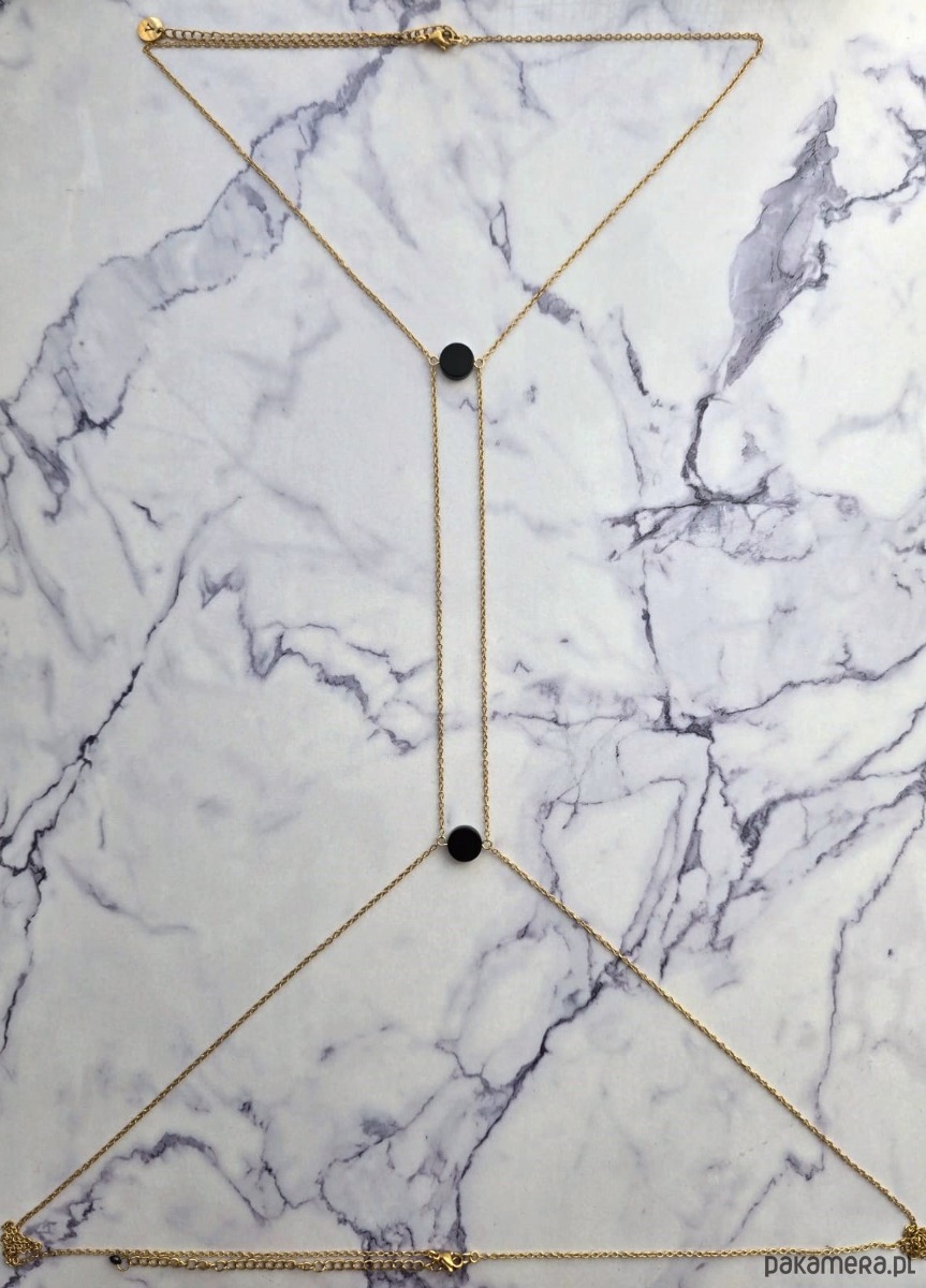 Łańcuszek na ciało z 2 czarnymi, gładkimi kamieniami onyksu, wykonany w połączeniu z elementami ze stali szlachetnej pozłacanej. Łańcuszek zapinany jest na karabińczyki na szyi i w talii, z możliwością regulacji, dzięki dodatkowym przedłużkom (ok. +10 cm). Body chain prezentuje się elegancko i subtelnie. Biżuteria idealna do stylizacji zarówno eleganckich, jak i codziennych.