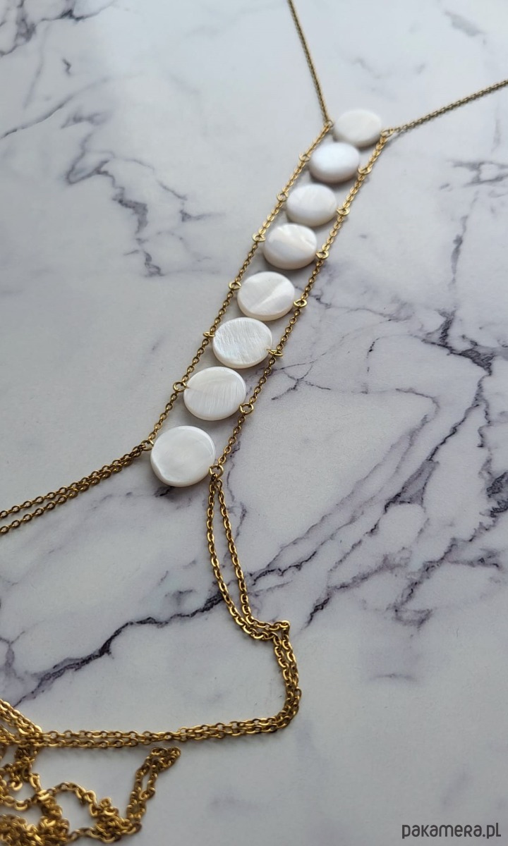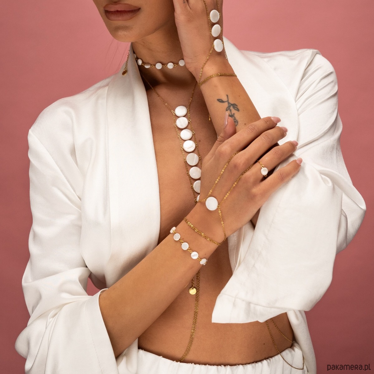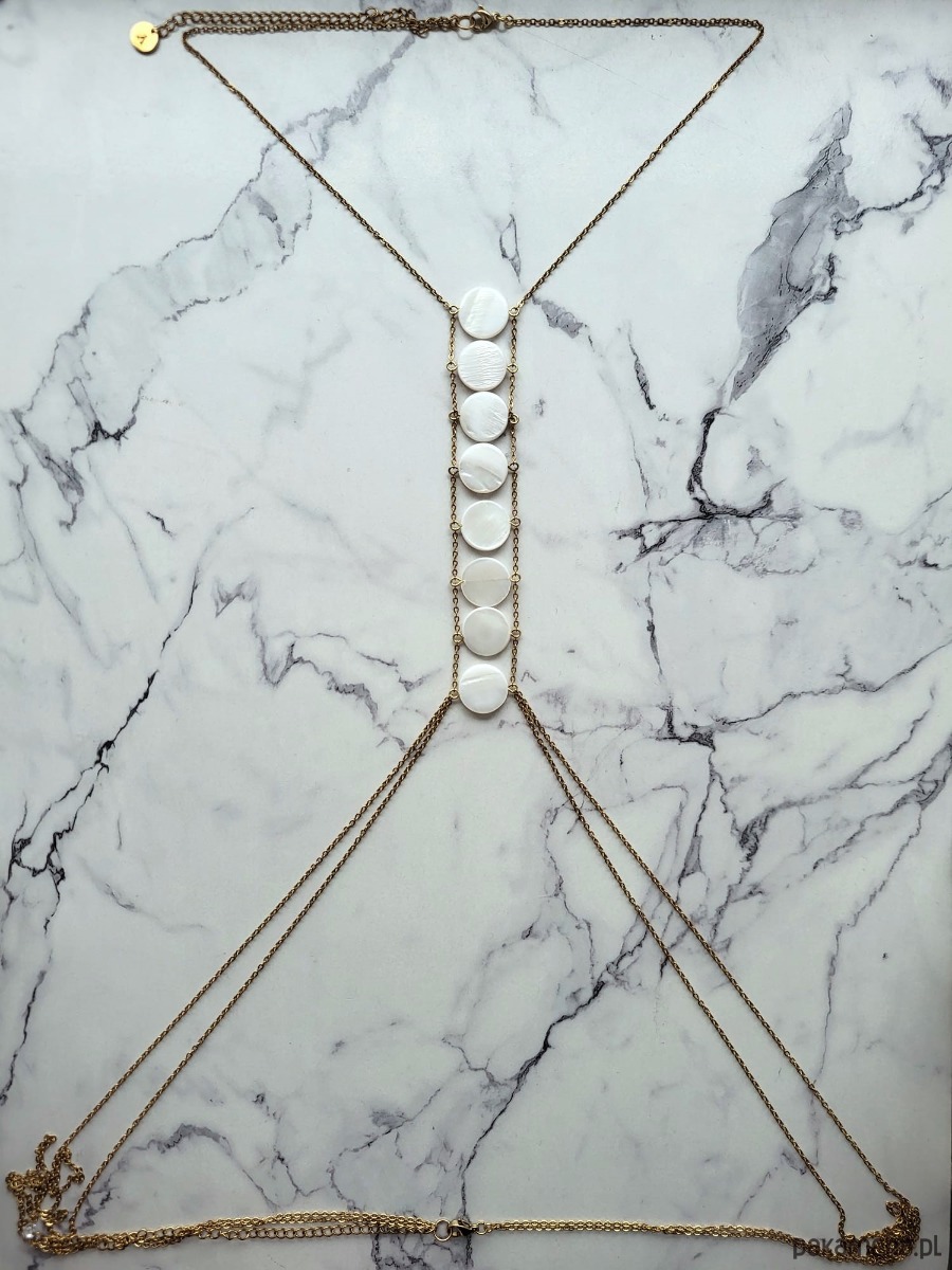 Łańcuszek na ciało z 8 dużymi pastylkami masy perłowej w odcieniach bieli, wykonany w połączeniu z łańcuszkiem i elementami ze stali szlachetnej oraz dodatkiem kółeczek łączących z mosiądzu pozłacanego 14-karatowym złotem, odpornego na ścieranie. Łańcuszki oplatają szyję oraz talię i zapinane są na karabińczyki, z możliwością regulacji długości, dzięki dodatkowym przedłużkom (ok. +10 cm), z zawieszką logo Afroditte. Łańcuszek w talii jest podwójny, co sprawia, że subtelnie układa się na bokach. Całość prezentuje się elegancko, oryginalnie i z klasą, a jednocześnie wzornictwo łańcuszka doskonale dopasuje się również do stylizacji boho. Łańcuszek można nosić zarówno na ciele, jak i na ubraniu.