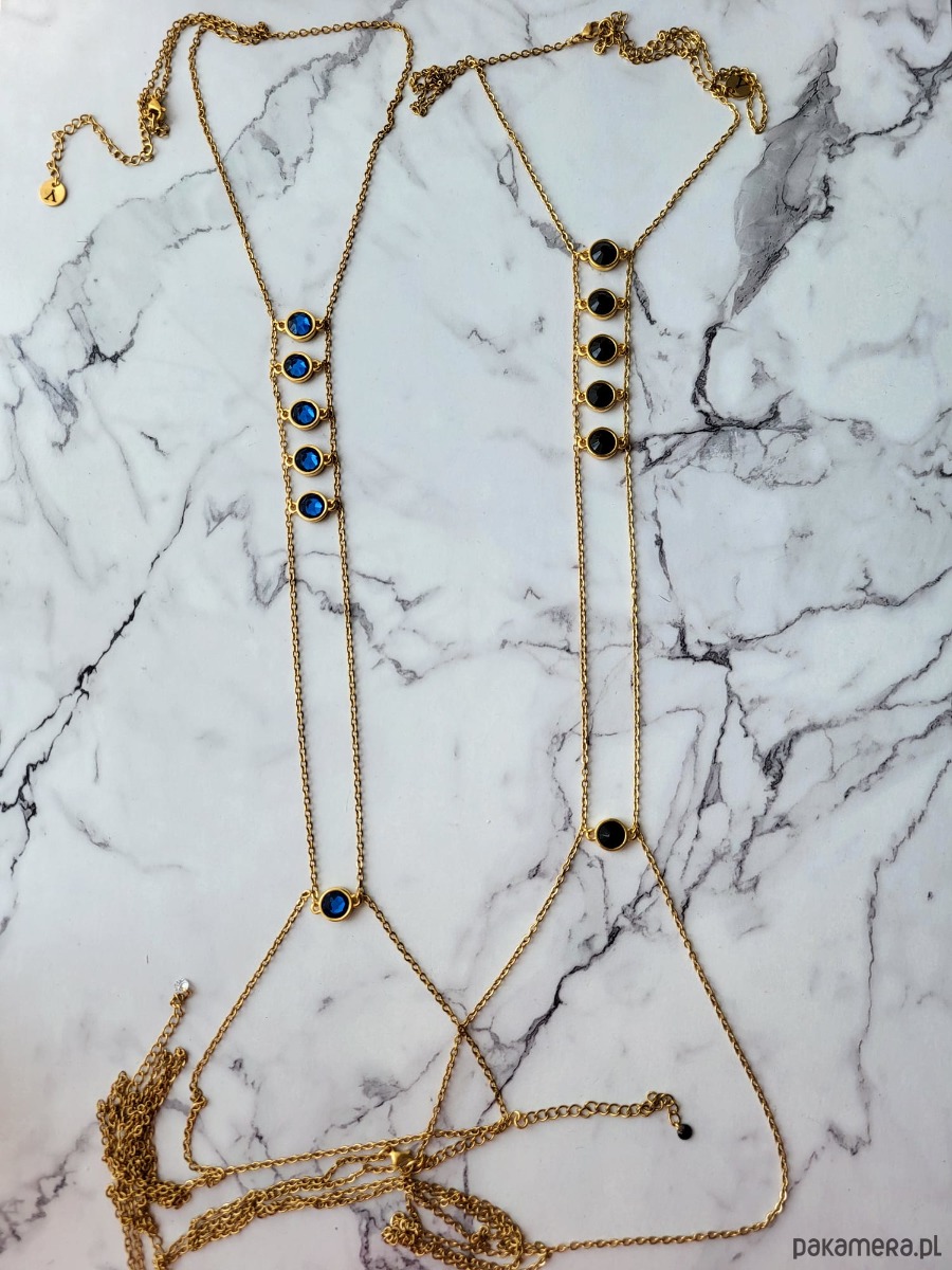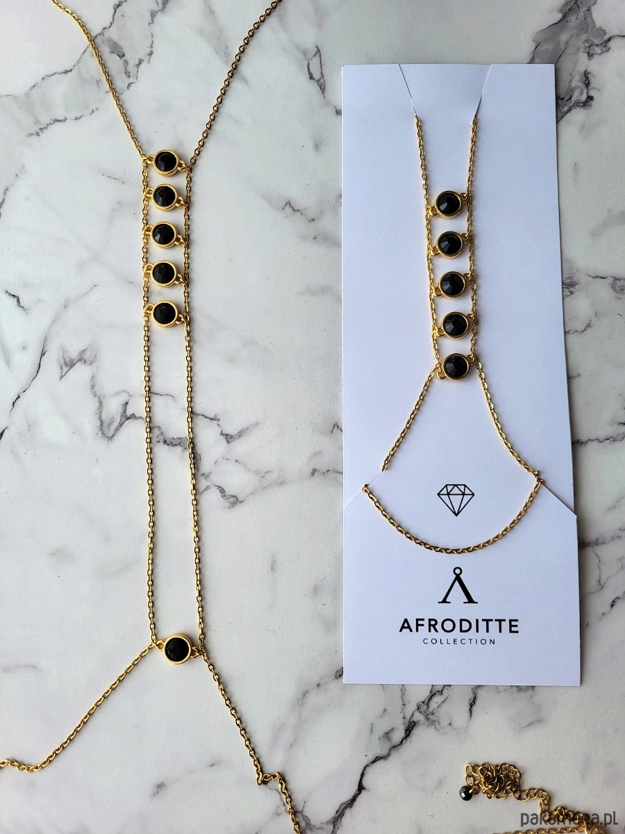 Łańcuszek na ciało z czarnymi kryształami w okuciu, wykonany ze stali szlachetnej oraz cyny pozłacanej. Kryształy ułożone są w kompozycji 5 kryształów + dodatkowy 1 kryształ poniżej (na dekolt lub poniżej topu/stroju). Łańcuszki oplatają szyję oraz talię i zapinane są na karabińczyki, z możliwością regulacji długości, dzięki dodatkowym przedłużkom +10 cm na szyi i w talii. Posiada logo Afroditte. Całość prezentuje się zmysłowo. Idealnie pasuje do topów, sukienek, strojów kąpielowych itp. Można go nosić zarówno na ciele, jak i na ubraniu.